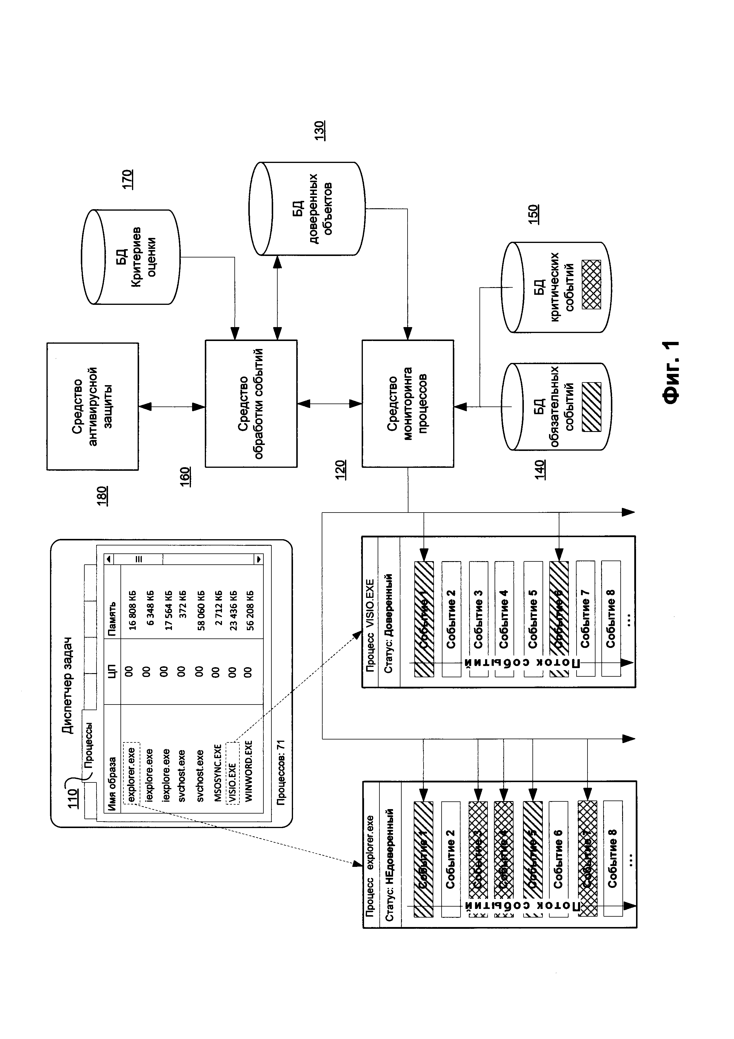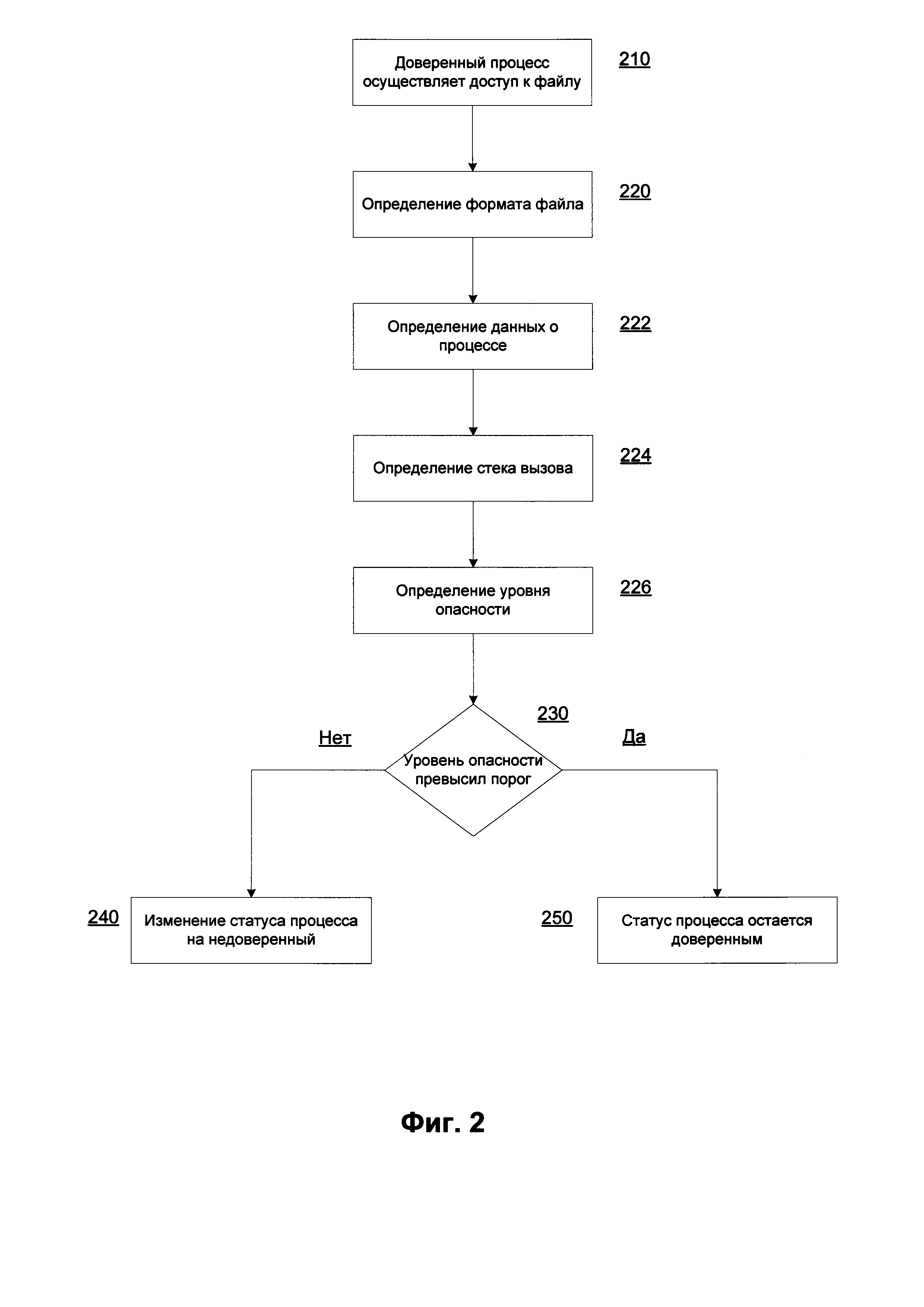 1. Способ исключения процесса из антивирусной проверки, который содержит этапы: 2. Способ по п. 1, в котором уровень опасности запроса на доступ к файлу со стороны процесса является числом и подсчитывается на основании определенных на этапах б)-г) значений для соответствующих операций. 3. Способ по п. 1, в котором уровень опасности запроса на доступ к файлу со стороны процесса может быть в виде двух значений "опасный" и "не опасный" и превышением заданного порога является значение "опасный". 4. Способ по п. 3, в котором уровень опасности запроса на доступ к файлу со стороны процесса признается "опасным", если определенный формат файла определен как небезопасный. 5. Способ по п. 4, в котором небезопасный формат файла является одним из следующих форматов: исполняемый формат файла, архив, формат, который поддерживает интерпретируемый код. 6. Способ по п. 3, в котором уровень опасности запроса на доступ к файлу со стороны процесса признается "опасным", если данные об упомянутом процессе включают среди загруженных библиотек в виртуальную память процесса хотя бы одну запущенную из недоверенного файла. 7. Способ по п. 6, в котором недоверенным файлом является файл, для которого выполняется хотя бы одно условие из следующих: файл был получен на компьютере пользователя из непроверенного источника, файл не имеет проверенной цифровой подписи.