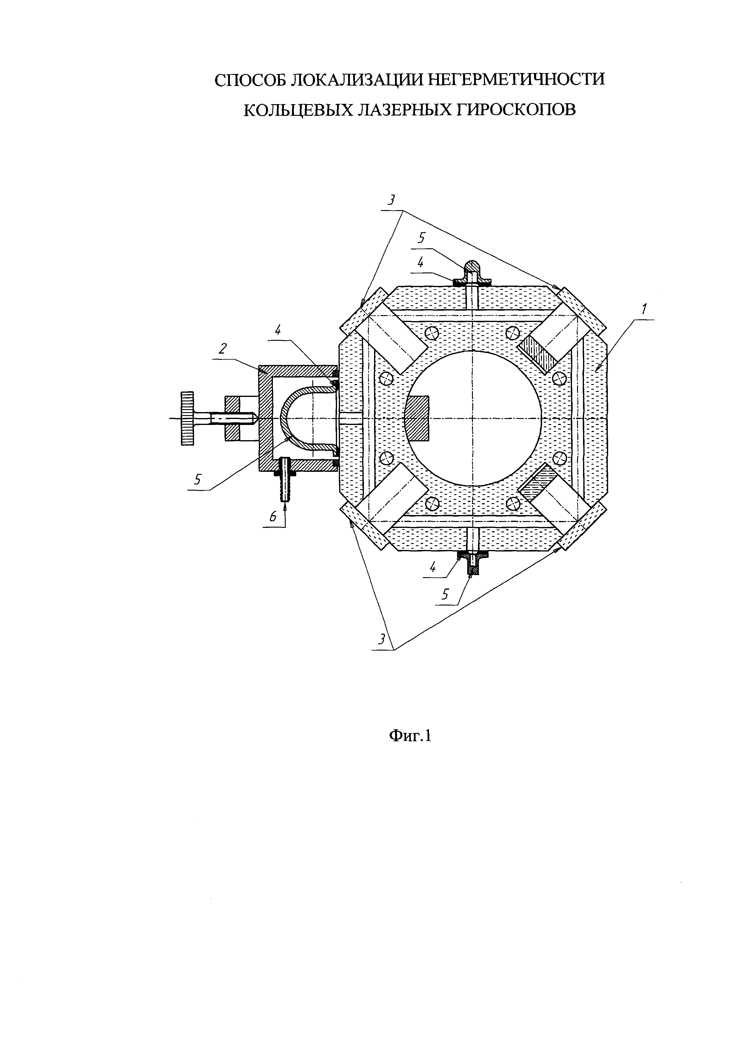 Изобретение относится к области лазерной техники и касается способа локализации негерметичности в кольцевых моноблочных лазерных гироскопах, предназначенных для измерения угловой скорости вращения. Известен способ контроля герметичности газонаполненного и запаянного изделия, заключающийся в размещении изделия в вакуумной камере и оценке утечки, откачивание газа из вакуумной камеры ведут до получения установившегося потока газа, соответствующего фоновому, измеряют поток газа от контрольной течи, а оценку утечки ведут путем сравнивания этих двух потоков, причем изделие признают годным, если фоновый поток меньше потока контрольной течи [Патент РФ №2105278, авторов Морозова B.C., Казакова Ю.И., Щербакова Э.В., Липняка Л.В., опубликованный 20.02.1998 г.]. При этом согласно изобретению положительный эффект достигается в результате обеспечения возможности в объективной оценке степени герметичности изделия, которая достигается в результате сравнения фонового сигнала, состоящего из фона самой барокамеры, фона изделия и потока негерметичности изделия с потоком контрольной течи. Недостатком данного способа является его низкая чувствительность для определения негерметичности кольцевых лазерных гироскопов, не позволяющая регистрировать негерметичность меньше порога чувствительности течеискателя, т.е. менее Известен другой способ масс-спектрометрического контроля герметичности моноблочных газовых лазеров [Патент РФ №2153657, авторов Голяева Ю.Д., Пузанова А.Г., Маш Л.Д., Пролейко Э.П., Шитовой Н.А., опубликованный 27.07.2000 г.]. Данный способ включает в себя создание замкнутых объемов с обеих сторон контролируемой оболочки лазера, откачку внутреннего объема вместе с анализатором пробного газа до высокого вакуума, накопление в контролируемой оболочке пробного газа путем прекращения откачки из нее пробного газа, при откачке остальных газов, и регистрацию изменения фоновой величины пика пробного газа за контрольное время, выбираемое на участке линейного нарастания величины пика пробного газа, возобновление откачки внутреннего объема вместе с анализатором, подачу пробного газа во внешний замкнутый объем, накопление в контролируемой оболочке пробного газа путем прекращения откачки из нее пробного газа при откачке остальных газов, регистрацию изменения суммарной величины пика пробного газа за то же контрольное время и оценку герметичности изделия по разности суммарной и фоновой величин пика пробного газа за контрольное время. Особенность способа состоит в том, что измерение фонового потока пробного газа повторяют до тех пор, пока зависимость интенсивности фонового потока пробного газа от времени при соседних измерениях не будет совпадать по крутизне и интенсивности с точностью до 10%, но не менее 3 раз, а при накоплении пробного газа анализатор оставляют подключенным к контролируемой оболочке и прекращение откачки и регистрацию суммарной величины пика пробного газа производят через время задержки после заполнения пробным газом внешнего замкнутого объема, которое определяется конструкцией лазера и пробным газом и не может быть меньше времени установления стационарного потока пробного газа через дефекты поверхностей, соединяемых вакуумплотно способом оптического контакта, при этом лазер считают герметичным, если измеренна