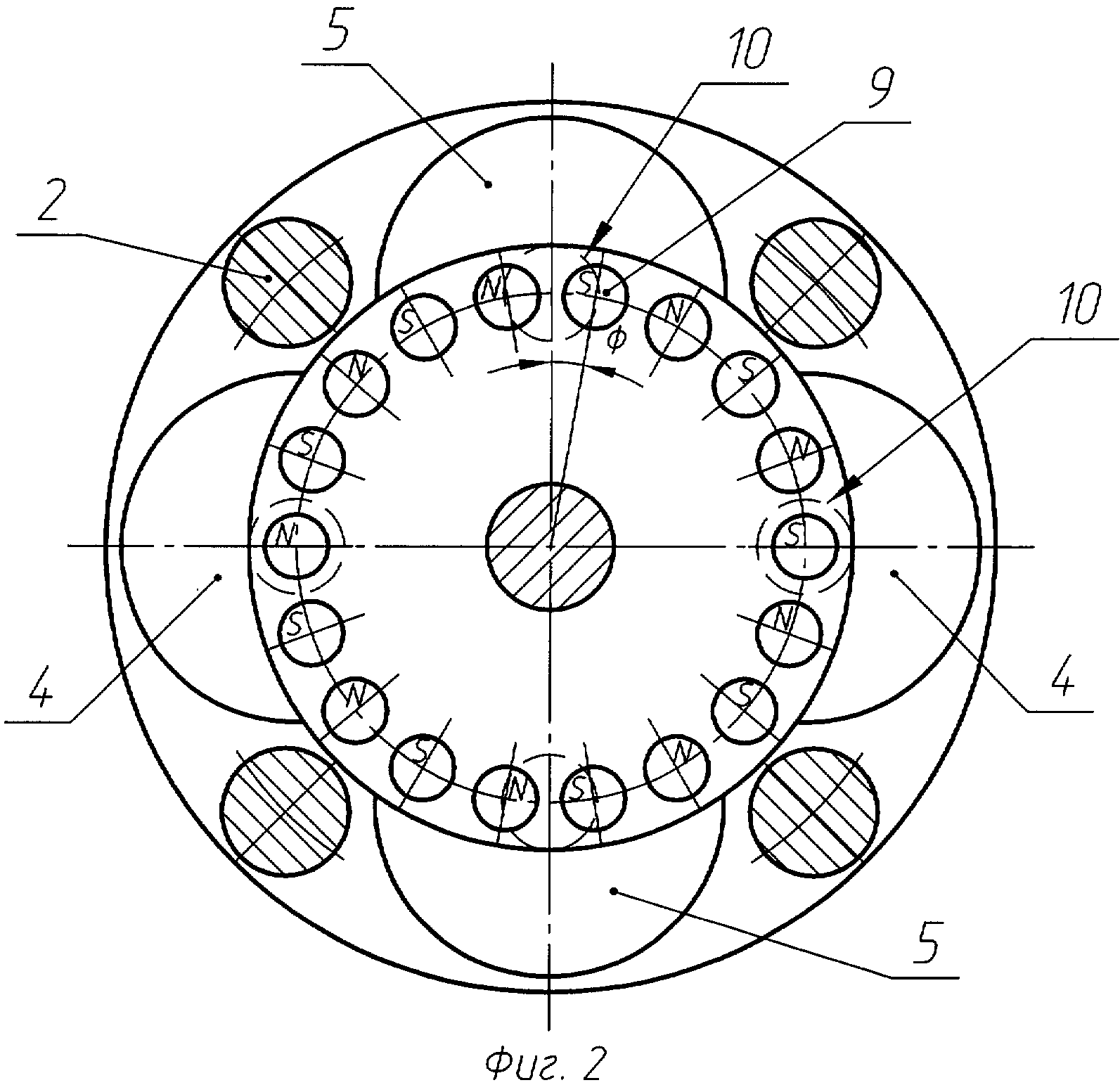 1. Шаговый двигатель, содержащий многополюсный ротор с соосным диском, имеющим распределенные вдоль его периферии и намагниченные параллельно их оси постоянные магниты чередующейся полярности, обмотку возбуждения с сердечником, магнитопроводами и полюсными наконечниками, отличающийся тем, что он снабжен дополнительными обмотками возбуждения, все обмотки возбуждения образуют две фазы возбуждения и расположены с обеих сторон диска параллельно его оси вращения с возможностью взаимодействия создаваемыми электромагнитными полями с обоими полюсами постоянных магнитов, диаметрально размещенных в отверстиях диска, при этом постоянные магниты имеют высоту, равную или превышающую толщину диска, а обмотки возбуждения каждой фазы размещены симметрично оси ротора. 2. Шаговый двигатель по п.1, отличающийся тем, что обмотки возбуждения разных фаз размещены с угловым шагом, кратным половине углового шага размещения магнитов на диске ротора, при этом коэффициент кратности одной фазы четный, второй - нечетный. 3. Шаговый двигатель по п.2, отличающийся тем, что диаметр полюсных наконечников сердечников обмоток возбуждения не меньше диаметра постоянных магнитов, но не превышает шага размещения постоянных магнитов на диске.