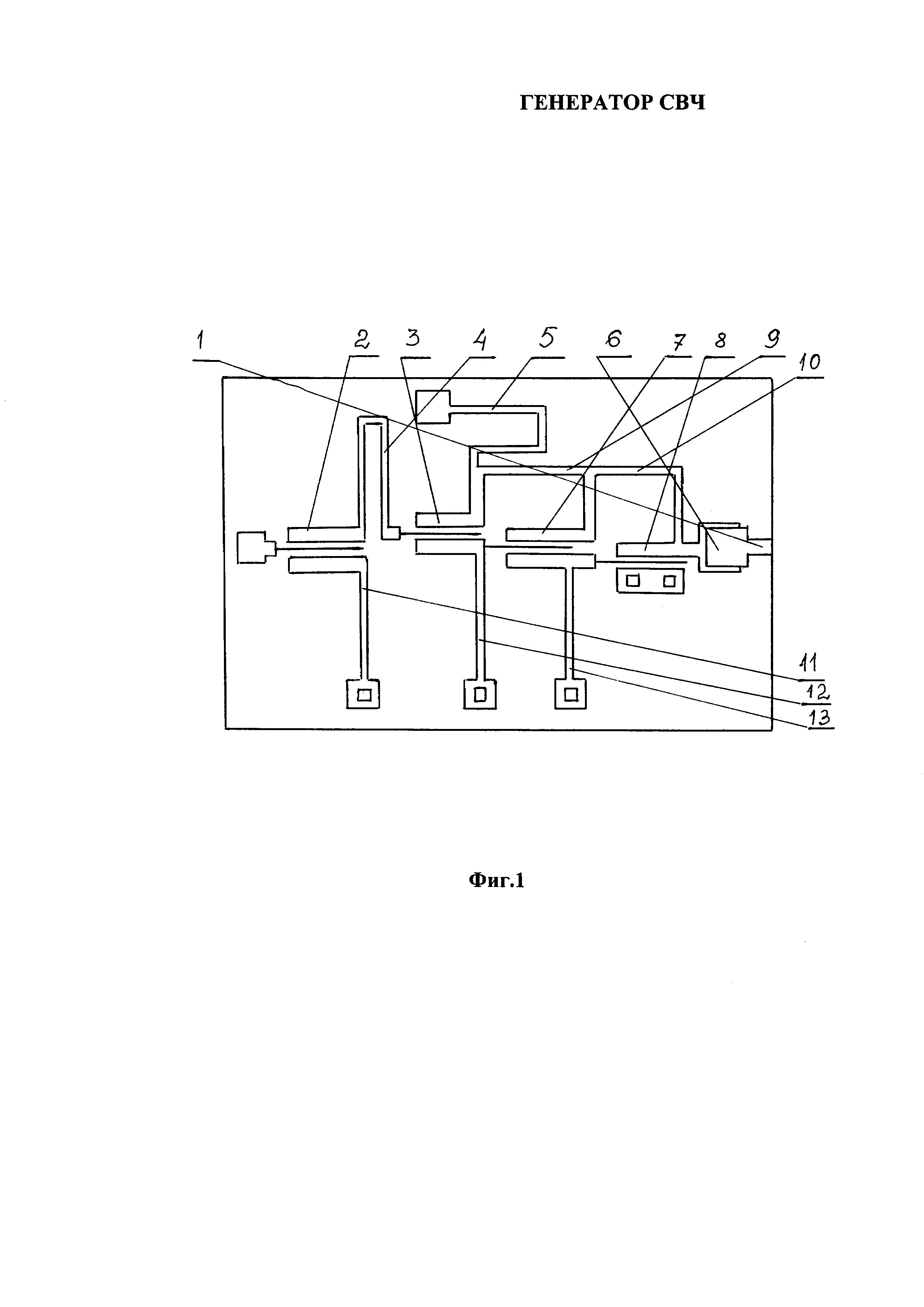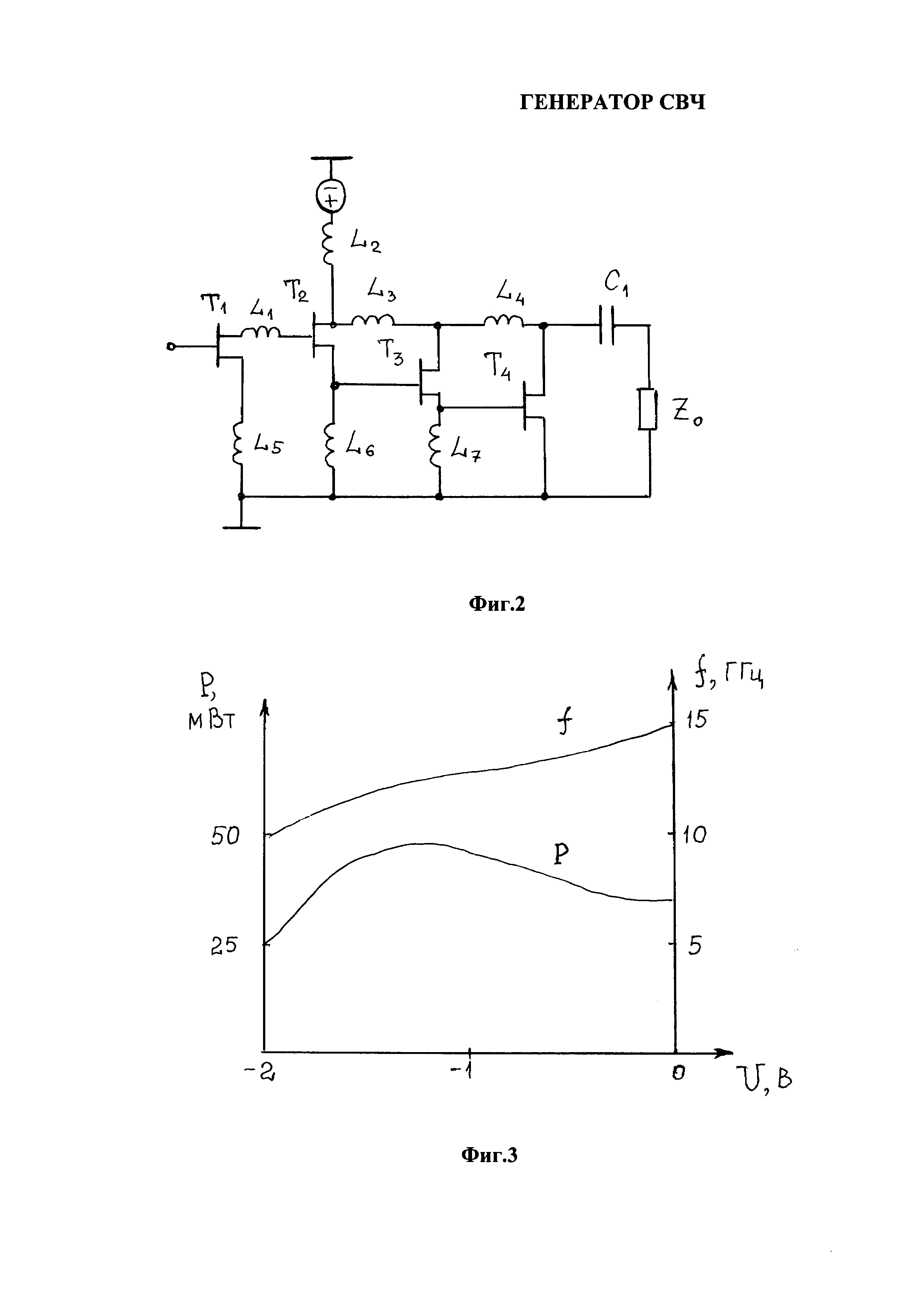 Генератор СВЧ, содержащий линию передачи на выходе, по меньшей мере, два полевых транзистора с барьером Шотки, один из которых управляемый напряжением, по меньшей мере, две индуктивности и разделительную емкость, при этом один конец первой индуктивности соединен со стоком первого полевого транзистора с барьером Шотки, на затвор которого подают постоянное управляющее напряжение, а другой - с затвором второго полевого транзистора с барьером Шотки, на сток которого подают постоянное напряжение положительной полярности через вторую индуктивность, линия передачи на выходе соединена с одним концом разделительной емкости, отличающийся тем, что в генератор дополнительно введены два полевых транзистора с барьером Шотки - третий и четвертый, пять индуктивностей - третья, четвертая, пятая, шестая, седьмая соответственно, при этом сток второго полевого транзистора с барьером Шотки соединен через третью индуктивность со стоком третьего полевого транзистора с барьером Шотки, сток третьего полевого транзистора с барьером Шотки соединен через четвертую индуктивность со стоком четвертого полевого транзистора с барьером Шотки, сток четвертого полевого транзистора с барьером Шотки соединен с другим концом разделительной емкости, исток второго полевого транзистора с барьером Шотки соединен с затвором третьего полевого транзистора с барьером Шотки, исток третьего полевого транзистора с барьером Шотки соединен с затвором четвертого полевого транзистора с барьером Шотки, истоки всех четырех полевых транзисторов с барьером Шотки заземлены, при этом исток первого полевого транзистора с барьером Шотки - через пятую индуктивность, общая точка соединения истока второго и затвора третьего полевых транзисторов с барьером Шотки - через шестую индуктивность, общая точка соединения истока третьего и затвора четвертого полевых транзисторов с барьером Шотки - через седьмую индуктивность.