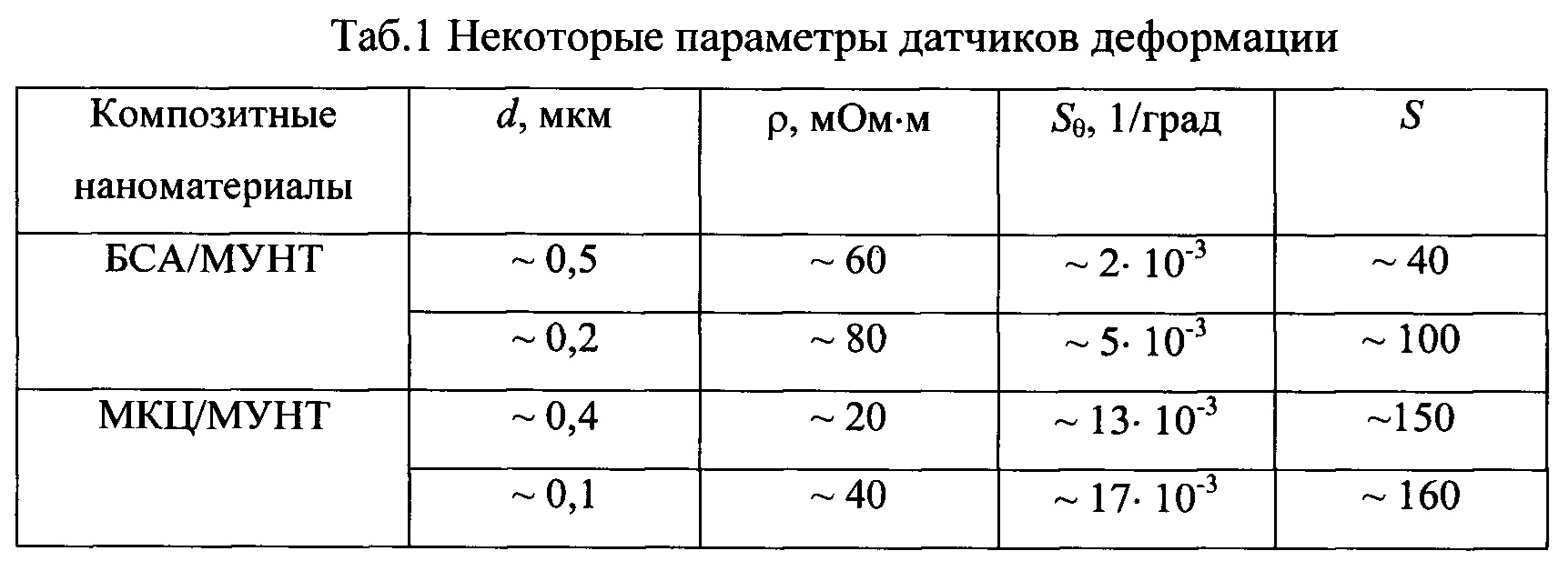 Использование: для создания тензорезисторных датчиков деформации и давления. Сущность изобретения заключается в том, что биполярный датчик содержит тонкую пленку толщиной 0,05-0,5 мкм из композиционного наноматериала в составе бычьего сывороточного альбумина или микрокристаллической целлюлозы и многостенных углеродных нанотрубок. Технический результат - обеспечение возможности повышения чувствительности датчика. 1 з.п. ф-лы, 1 табл., 3 ил.