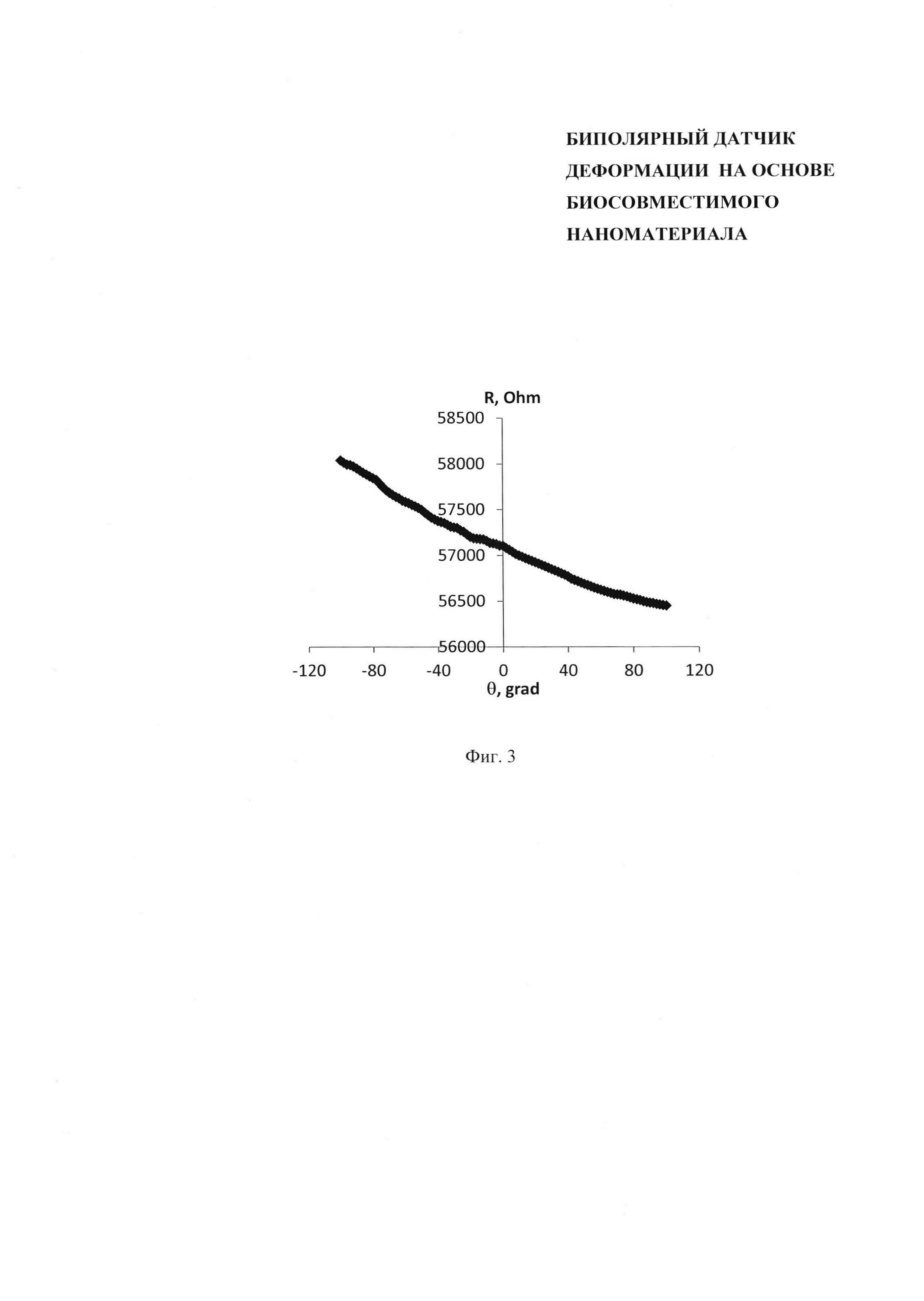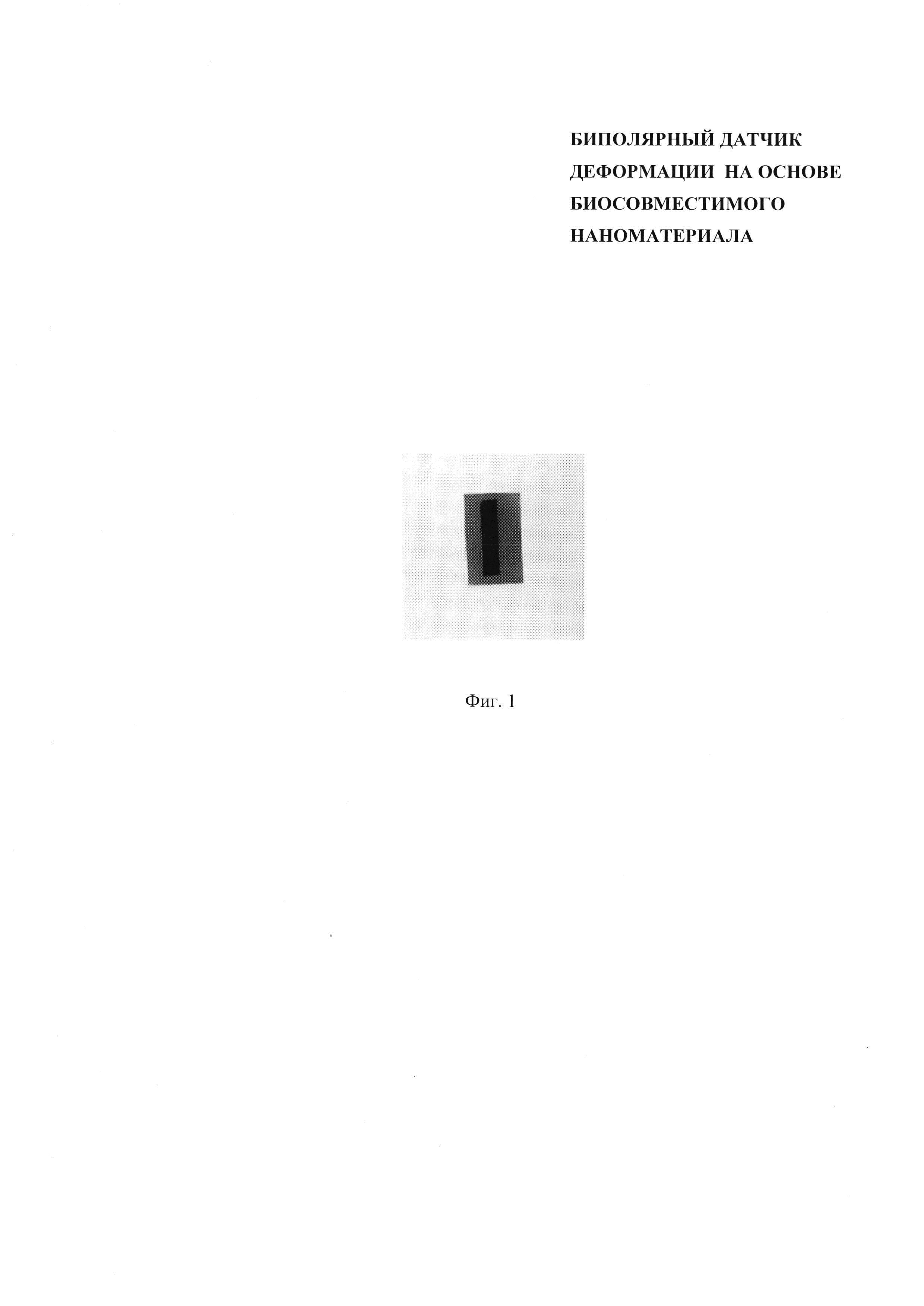 1. Биполярный датчик деформации на основе биосовместимого наноматериала, содержащий гибкую подложку и пленку из сети углеродных нанотрубок, между которыми существуют случайные электросоединения, отличающийся тем, что содержит тонкую пленку толщиной 0,05-0,5 мкм из композиционного наноматериала в составе бычьего сывороточного альбумина, или карбоксилметилцеллюлозы, или акриловой краски и углеродных нанотрубок. 2. Биполярный датчик деформации по п. 1, отличающийся тем, что содержит гибкую подложку из бумаги, или текстиля, или полиэтилентерефталата толщиной до 50 мкм.