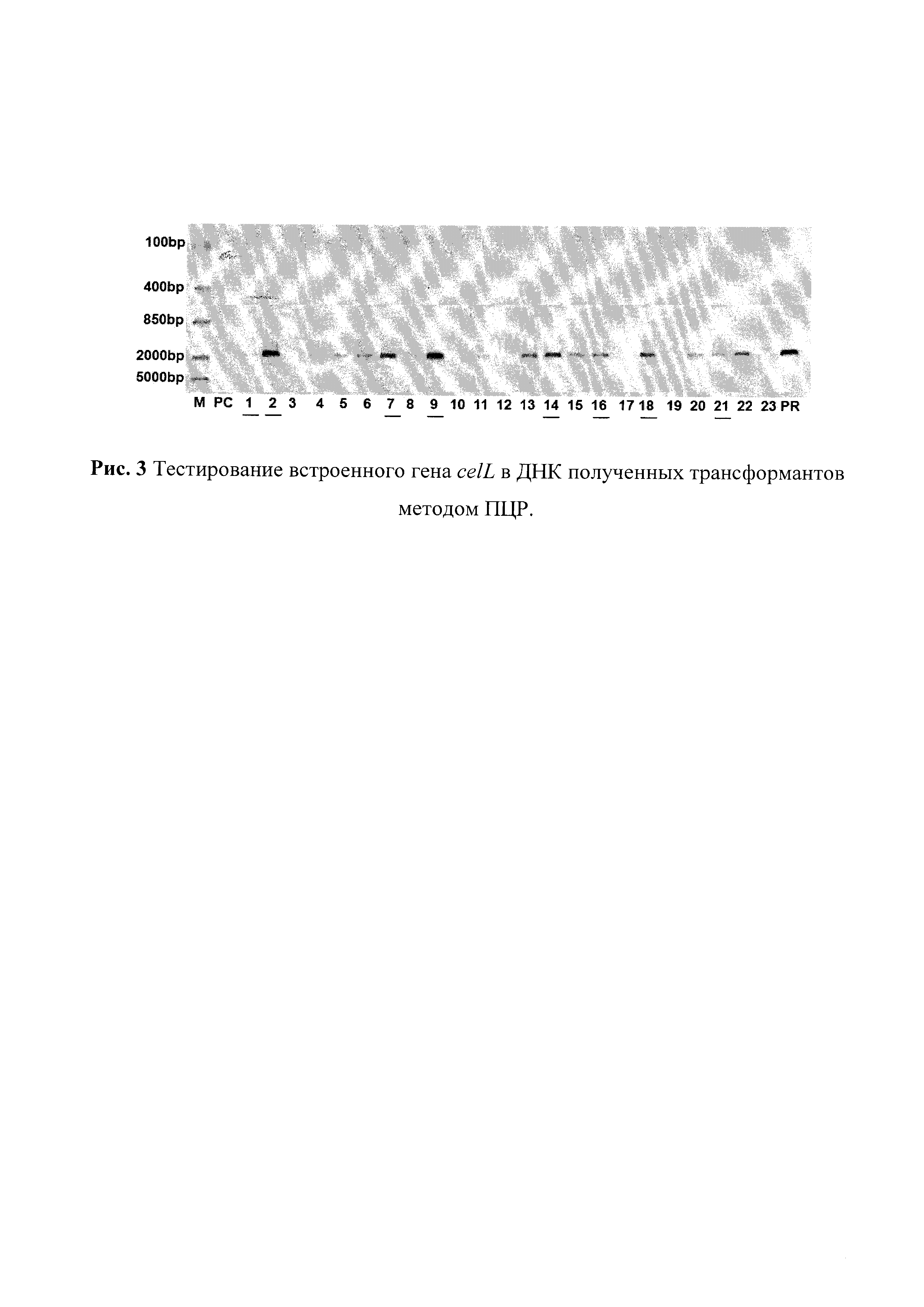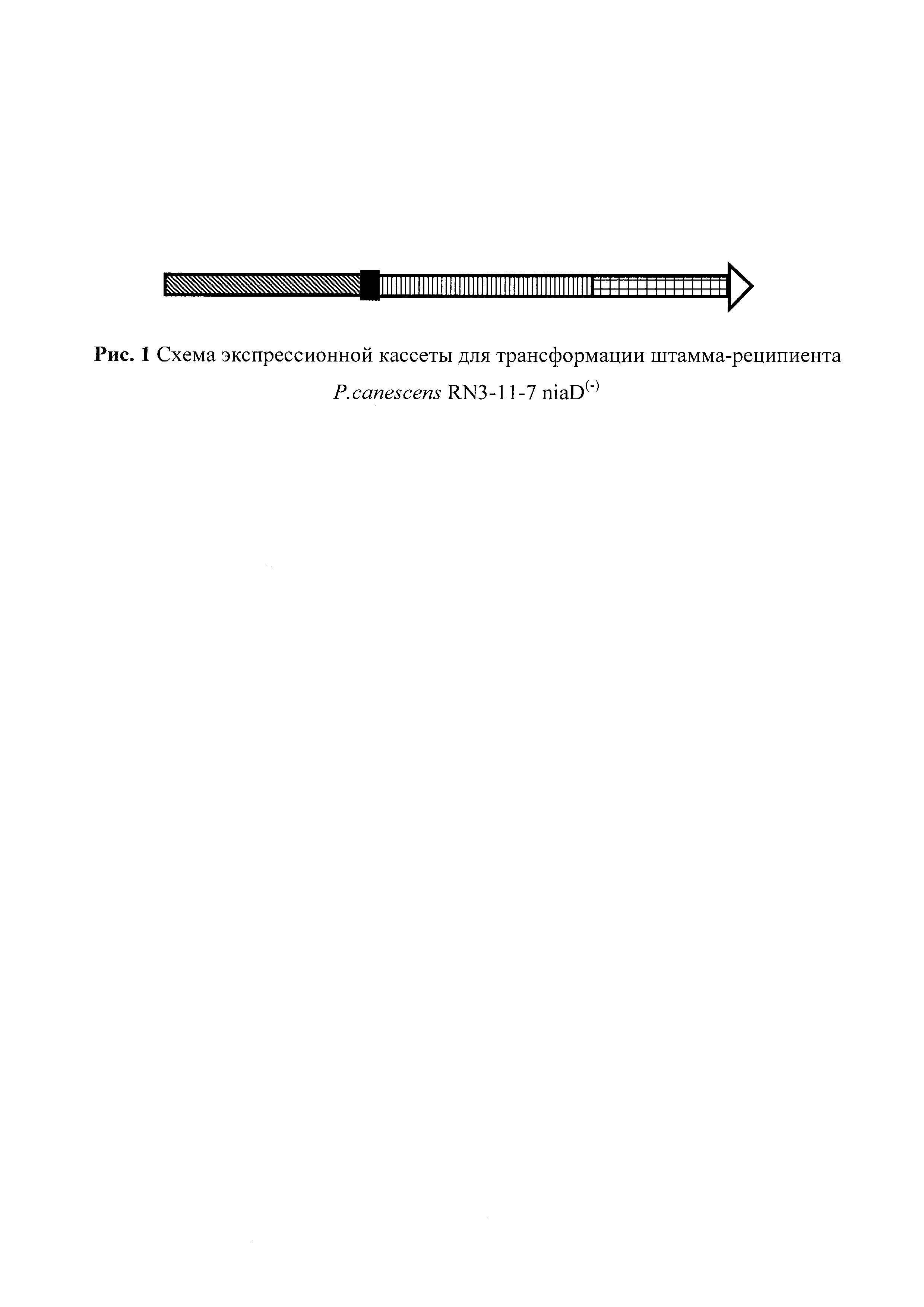 Изобретение в области биотехнологии относится к микробиологической промышленности и представляет собой способ получения и культивирования рекомбинантного штамма мицелиального гриба Penicillium canescens CL14 ВКМ F-4706D, секретирующего термостабильную целлюлазу Cel5L из Clostridium thermocellum. Реконструкция целлюлосомы in vitro является технологически востребованной задачей в связи с уникальными гидролитическими свойствами комплекса бактериальных целлюлаз по отношению к целлюлозосодержащим растительным материалам [Roy H.Doi and Akihiko Kosugi, Cellulosomes: Plant-Cell-Wall-Degrading Enzyme Complexes, Nature Reviews, 2004, V.2, 541-551]. Разработка нового рекомбинантного штамма на основе мицелиального гриба Penicillium canescens, продуцирующего термостабильную целлюлазу 5-го семейства гликозил-гидролаз, Cel5L, позволит получить новый компонент целлюлосомы грамположительной бактерии Clostridium thermocellum, что является необходимым шагом для реконструкции целлюлосомы in vitro. Техническая значимость создания синтетической целлюлосомы (реконструкции) состоит в способности бактериальных целлюлаз к синергетическому взаимодействию, что приводит к повышению эффективности каталитического расщепления растительных полимеров до технических сахаров [Stern J, Kahn A, Vazana Y, Shamshoum M, Moraïs S, Lamed R, et al. (2015) Significance of Relative Position of Cellulases in Designer Cellulosomes for Optimized Cellulolysis. PLoS ONE 10(5): e0127326. doi:10.1371/journal.pone.0127326]. Cel5L является одной из основных структурных единиц целлюлосомы Clostridium thermocellum, мультиферментного комплекса, состоящего из ряда целлюлаз с различной субстратной специфичностью. Недавно было показано, что фермент Cel5L обладает свойствами процессивной целлобиозидазы, включая высокую активность по отношению к аморфной и кристаллической целлюлозе, а также существенной активностью по β-глюкану [Pillip J.Brumm et al, Clostridium thermocellum Cel5L- Cloning and Characterization of a New, Thermostable GH5 Cellulase, IJBcRR, 2015, V.6(2), 62-74]. К числу наиболее перспективных микроорганизмов для получения ферментных препаратов карбогидраз на сегодняшний день относятся микроскопические грибы рода Trichoderma, Penicillium, а также Aspergillus, что обусловлено в основном их высоким уровнем секреции внеклеточных ферментов [Gusakov A.V. Alternatives to Trichoderma reseei in biofuel production / Trends in Biotechnology. – 2011. - T. 29. - № 9. - С. 419-425, Чекушина А.В., Доценко Г.С., Синицын А.П. / Сравнение эффективности процессов биоконверсии растительного сырья с использованием биокатализаторов на основе Penicillium и Trichoderma. // Катализ в промышленности. – 2012. - № 6. - С. 68-76]. Полученные ранее патенты показывают, что одним из возможных биотехнологически значимых микроорганизмов может являться штамм P.canescens RN3-11-7 niaD(-), неоднократно успешно используемый как реципиент для получения продуцентов гомологичных и гетерологичных белков с использованием сильных промоторов гена ксиланазы и β-галактозидазы, например гетерологичной эндо-1,4-β-глюканазы III P.verruculosum с использованием сильных промоторов гена ксиланазы и β-галактозидазы [Рожкова А.М. Волков П.В., Кондратьева Е.А., Сатрутдинов А.Д. и др. Создание продуцентов биотехнологически важных ферментов на основе рекомбинантного штамма гриба Penicillium canescens. Хранение и переработка сельхозсырья. – 2010. - № 7. - С. 37-39, патент РФ2238974 (С2) опубл. 27.10.2004, ДНК-фрагмент мицелиального гриба Penicillium verruculosum, кодирующего синтез секретируемой эндоглюканазы и группа штаммов Penicillium сanescens, продуцирующих эндоглюканазу III Penicillium verruculosum, cконструированных методами трансформации и генетичес