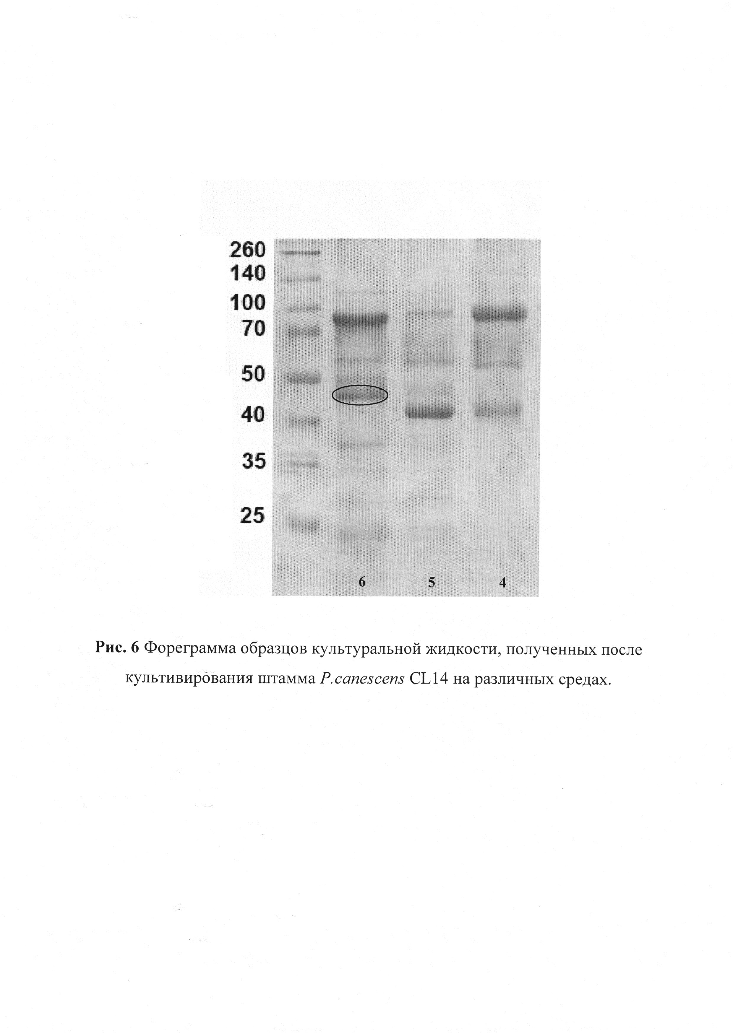 Изобретение относится к биотехнологии. Предложен рекомбинантный штамм мицелиального гриба Penicillium canescens СL14 ВКМ F-4706D, продуцирующий бактериальную термофильную целлюлазу Cel5L из Clostridium thermocellum с молекулярной массой 48 кДа. Указанный штамм получают путем трансформации исходного штамма P.canescens RN3-11-7 niaD(-) плазмидой, несущей ген celL, кодирующей целлюлазу Cel5L из бактерии Clostridium thermocellum. Предложен также способ культивирования указанного штамма, включающий выращивание штамма на питательной среде следующего состава (г/л): соевая мука – 45, кукурузный экстракт – 40, KHPO– 6, CaCl- 0,23, MgSO×7HO - 0,3, дрожжевой экстракт – 10, пшеничные отруби – 10. Группа изобретений обеспечивает эффективную продукцию целлюлазы Cel5L из Clostridium thermocellum в гетерологичном грибном штамме-хозяине. 2 н.п. ф-лы, 6 ил., 1 табл., 4 пр.