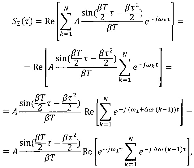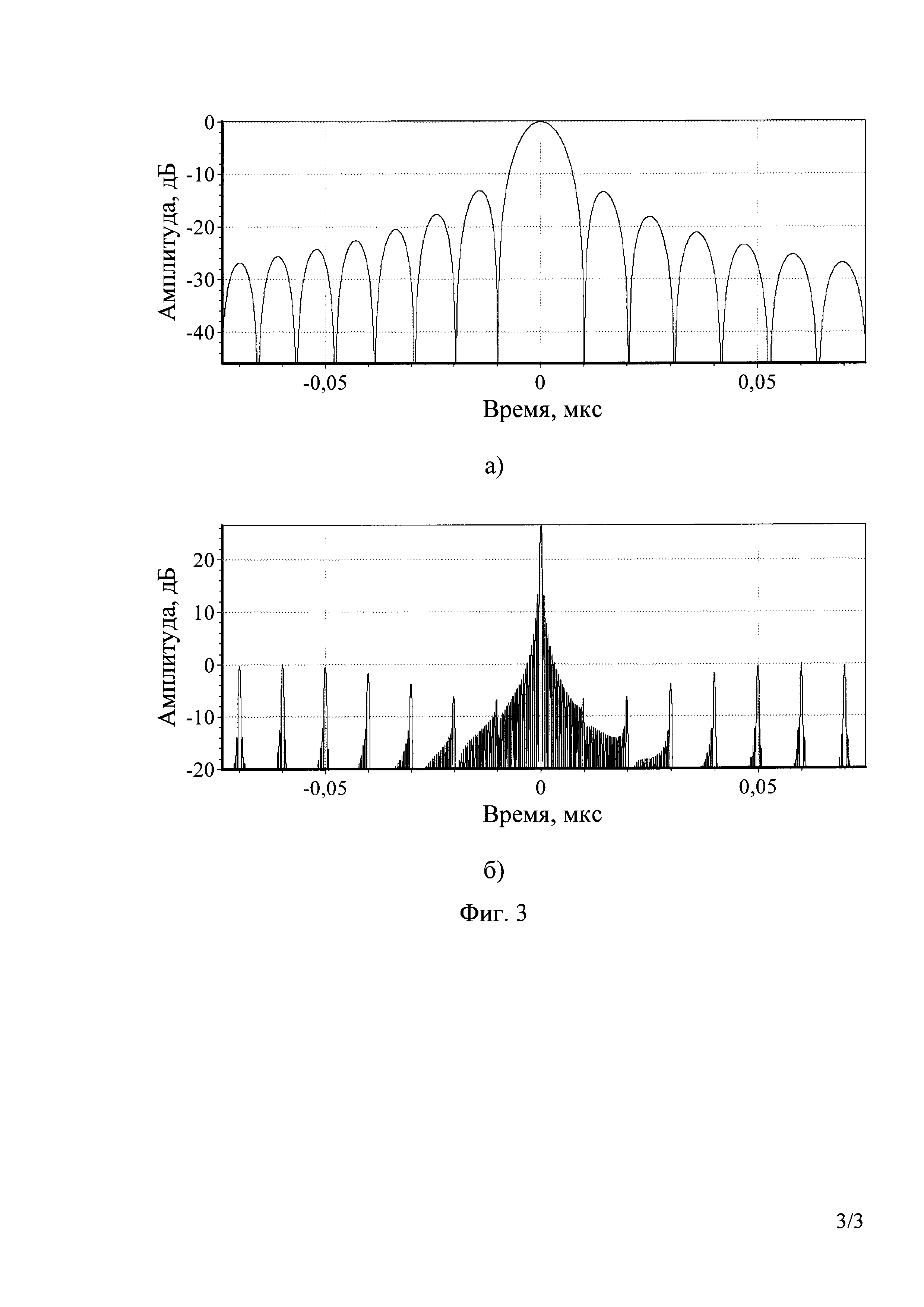 - интервал между несущими частотами, не превышающей максимальной полосы сигнала Вk. С целью увеличения рабочей дальности в каждом поддиапазоне осуществляется фазовая модуляция (манипуляция) сигнала (линейная или нелинейная частотная модуляция, фазокодовая манипуляция) и при приеме осуществляется сжатие сигнала. Результирующий сигнал получается в результате суммирования сжатых сигналов с учетом фазы их несущей. Для уменьшения боковых лепестков в результирующем сигнале фазовая модуляция (манипуляция) может производиться по индивидуальному закону для каждой несущей частоты. 3 ил.