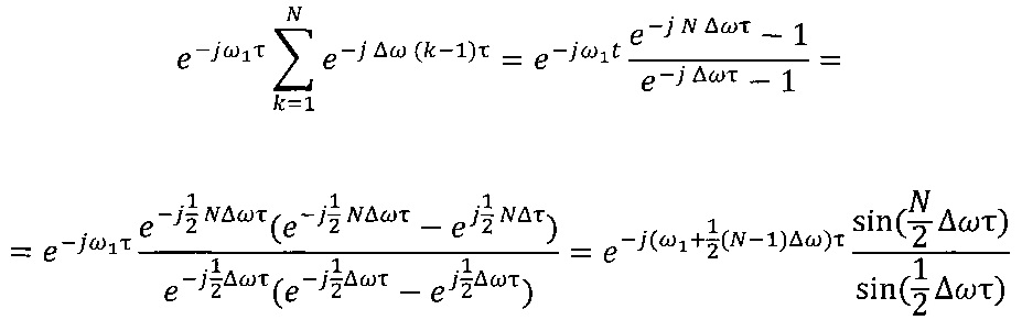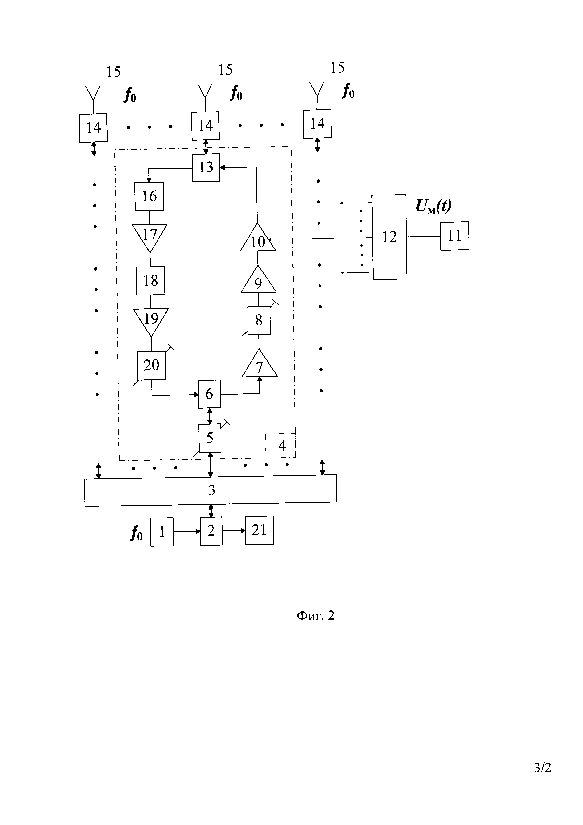 . Несущие частоты определяются выражением (2). Для обеспечения взаимной когерентности частоты возбудителей формируются от общего опорного генератора (22), сигнал с частотой