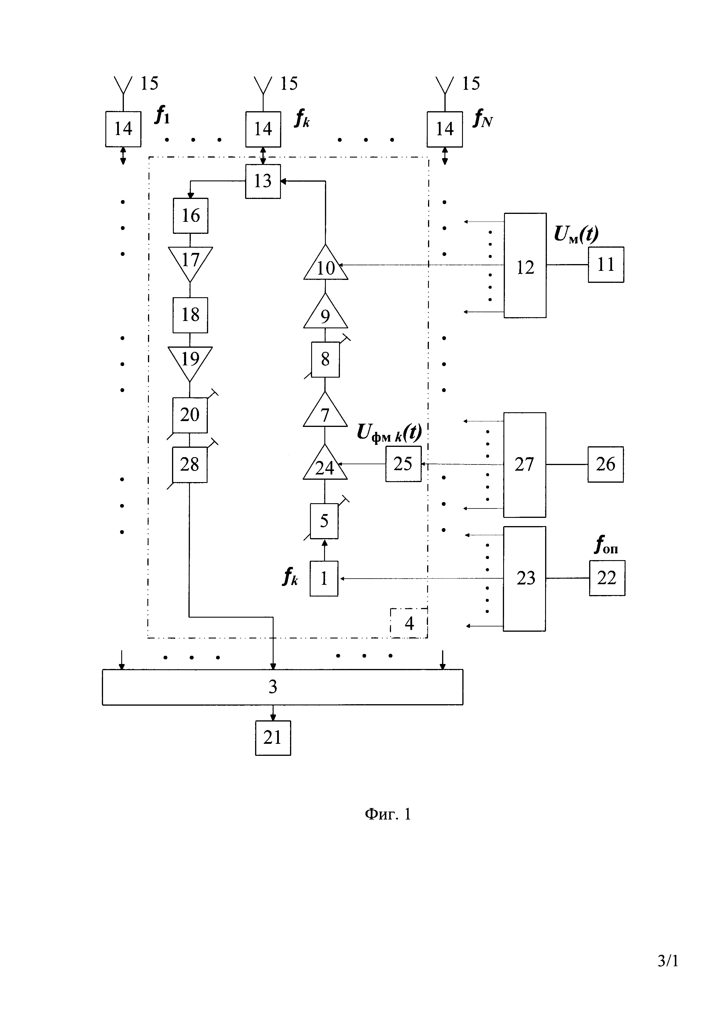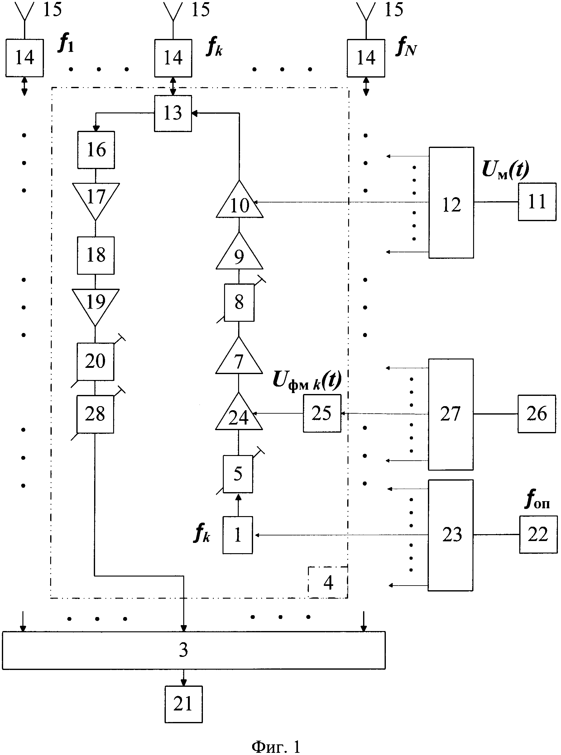. В связи с этим из схемы исключены ППП (2) и (6). Взаимная когерентность обеспечивается общим для всех AM опорным генератором (22), сигнал с которого поступает на возбудители (1) через PC опорного сигнала (23). При этом полосы частот могут быть одинаковыми Вk=Вk+1 или иметь разную ширину.