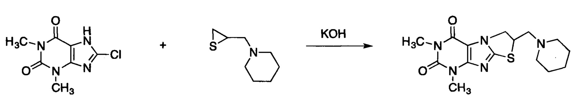 1. Способ получения 1,3-диметил-7-(пиперидин-1-илметил)-6,7-дигидротиазоло[3,2-ƒ]пурин-2,4(1H,3H)-диона формулы содержащего остаток молекулы 1,3-диметилксантина, заключающийся во взаимодействии соединения 8-R-1,3-диметилксантина формулы где R - атом хлора, с 1-(тииран-2-илметил)пиперидином в присутствии едкого кали в среде диметилформамида при температуре кипения реакционной смеси в течение 1 часа. 2. Способ получения 1,3-диметил-7-(пиперидин-1-илметил)-6,7-дигидротиазоло[3,2-ƒ]пурин-2,4(1H,3H)-диона по п. 1, отличающийся тем, что молярное соотношение реагентов вода : гидроокись калия : 8-хлор-1,3-диметилксантин : ДМФА : 1-(тииран-2-илметил)пиперидин составляет 6,05:0,3:0,3:14:0,3.