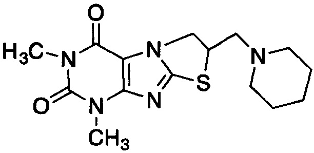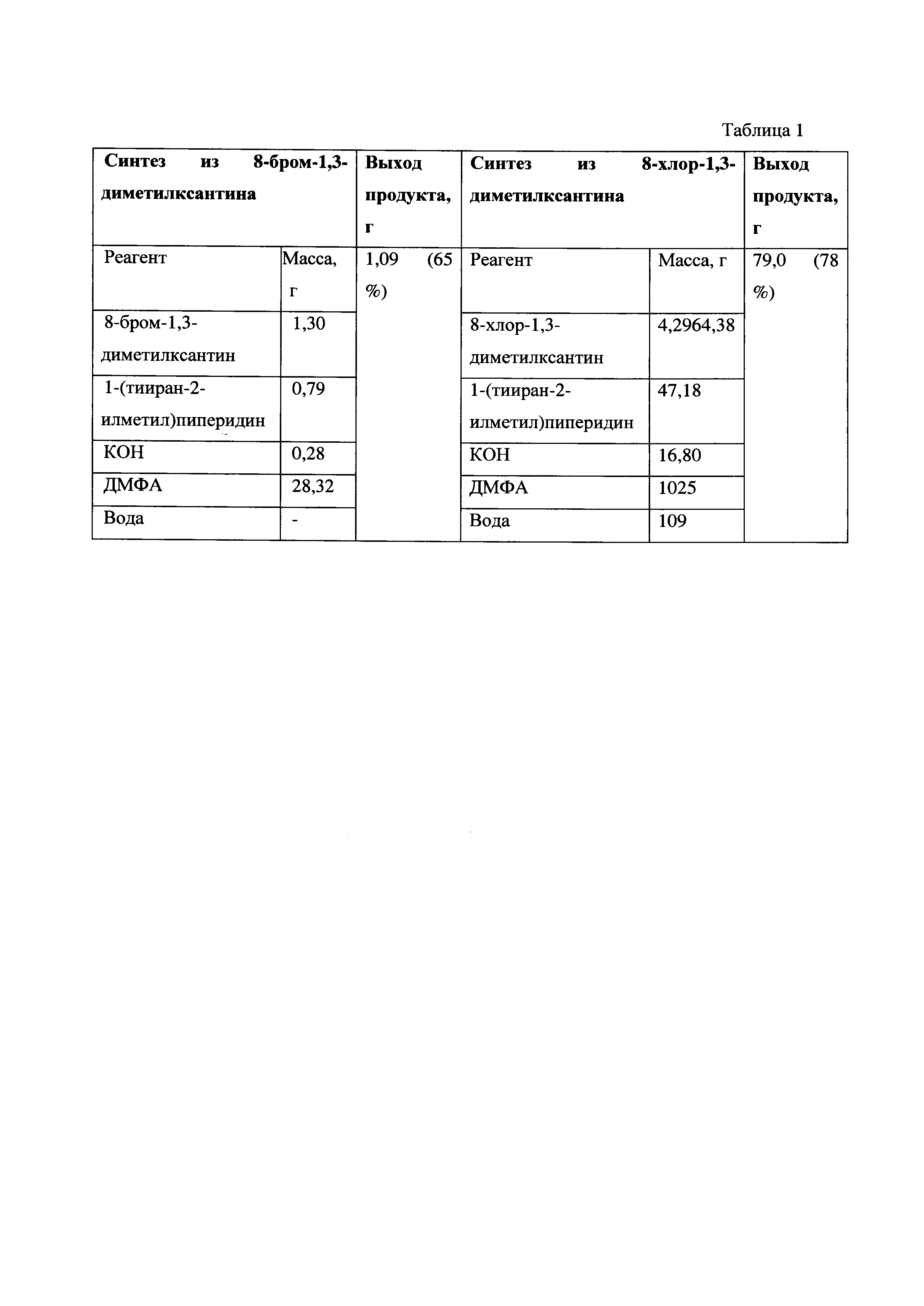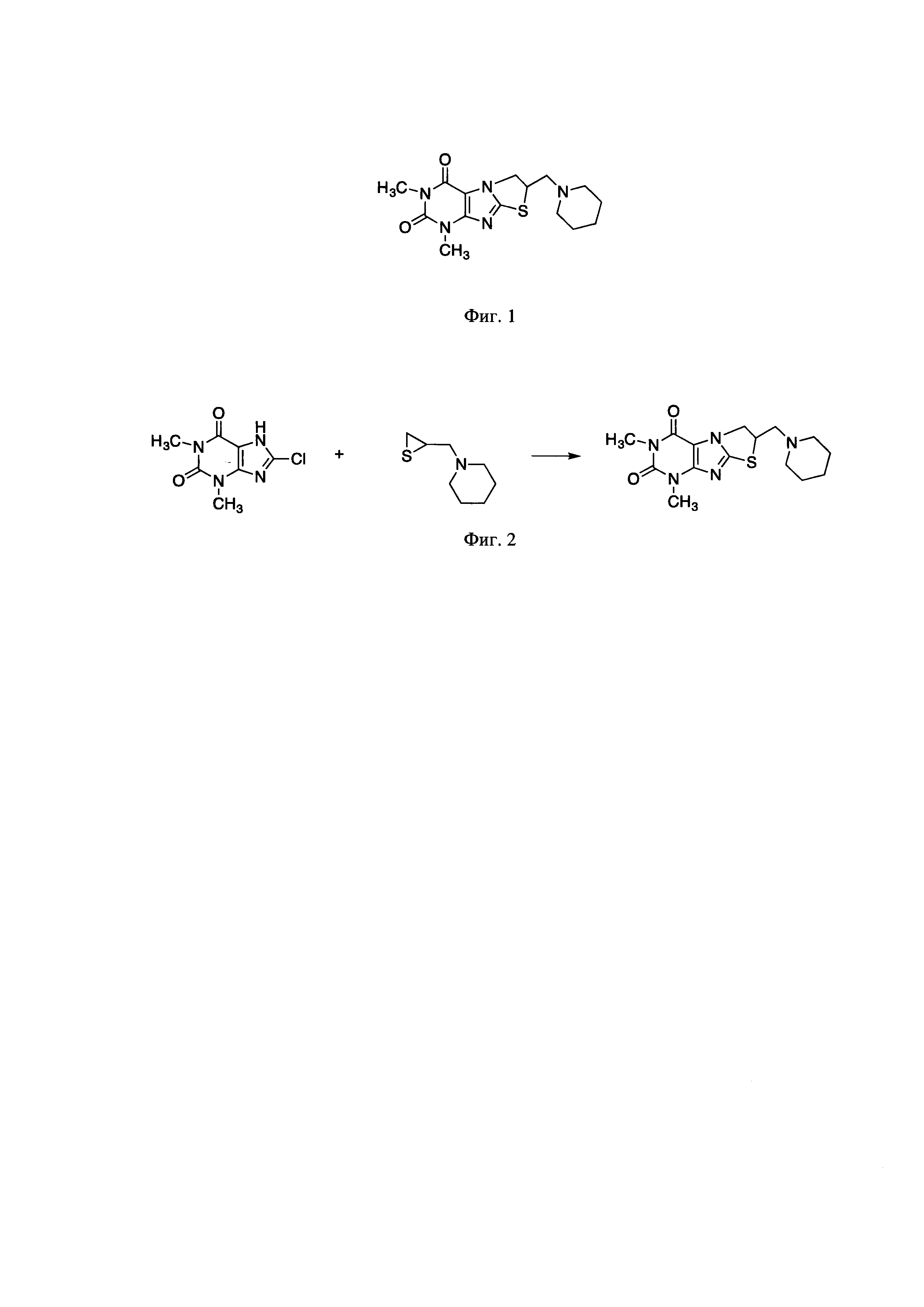Изобретение относится к области медицины и фармацевтической промышленности и касается усовершенствования способа получения 1,3-диметил-7-(пиперидин-1-илметил)-6,7-дигидротиазоло[3,2-ƒ]пурин-2,4(1H,3H)-диона, который может быть использован для нормализации детоксицирующей функции печени при хронических гепатитах и циррозах лекарственного и алкогольного генеза. В начале 2000-х гг. были инициированы поисковые фармакологические исследования индукторов цитохрома Р450 среди соединений класса азолов. В скрининговых исследованиях было установлено, что наиболее перспективным является производное пиперидинометилтиазолоксантина - 1,3-диметил-7-(пиперидин-1-илметил)-6,7-дигидротиазоло[3,2-ƒ]пурин-2,4(1H,3H)-дион (Фиг. 1), которое показало более выраженную МОС-индуцирующую активность, чем препарат сравнения бензонал, при этом, в отличие от производных барбитуровой кислоты, соединение не влияло на функции ЦНС [Никитина И.Л. Поиск и фармакология новых индукторов монооксигеназной системы - производных азолов: диссертация … доктора медицинских наук: Волгоградский государственный медицинский университет, Волгоград, 2004. - 281 с.]. Известен способ получения 1,3-диметил-7-(пиперидин-1-илметил)-6,7-дигидротиазоло[3,2-ƒ]пурин-2,4(1H,3H)-диона: на первой стадии обработкой 8-бромтеофиллина едким кали получают калиевую соль 8-бромтеофиллина с выходом 92% [Кочергин П.М., Линенко В.И., Ткаченко А.А. и др. Исследования в ряду имидазола. L III. Синтез и фармакологическое действие производных имидазо[1,2-f]ксантина / Хим.-фарм. журн. - 1971.- N2. - С. 22-26]. На второй стадии, взаимодействием калиевой соли 8-бромтеофиллина с эпитиохлоргидрином в течение 10 часов получают 8-бром-1,3-диметил-7-(2,3-эпитиопропил)ксантин с выходом 10% [Халиуллин Ф.А., Катаев В.А., Строкин Ю.В. Взаимодействие галогенопроизводных ксантина и бензимидазола с эпитиохлоргидрином / Деп. В ВИНИТИ 22.1 1.88, n 8223. - В. 88. - 5 с.]. На третьей стадии, реакцией 8-бром-1,3-диметил-7-(2,3-эпитиопропил)ксантина с пиперидином в течение 3 часов получают 1,3-диметил-7-(пиперидин-1-илметил)-6,7-дигидротиазоло[3,2-ƒ]пурин-2,4(1H,3H)-дион с выходом 93% [Халиуллин Ф.А., Мироненкова Ж.В., Гильманов А.Ж. и др. Синтез и изучение гипогликемической активности производных 2,3-дигидротиазоло[2,3-f]ксантина / Хим.-фарм. журн.- 1994. - N 9. - С. 33-34]. Суммарный выход целевого соединения составляет 8,6%. Недостатками способа являются: низкий выход 1,3-диметил-7-(пиперидин-1-илметил)-6,7-дигидротиазоло[3,2-ƒ]пурин-2,4(1H,3H)-диона, сложность и большая общая длительность процесса. Наиболее близким по технической сущности к заявленному является способ синтеза 1,3-диметил-7-(пиперидин-1-илметил)-6,7-дигидротиазоло[3,2-ƒ]пурин-2,4(1H,3H)-диона [RU 2161160 С2, опубликовано 27.12.2000] из 8-бром-1,3-диметилксантина (8-бромтеофиллина) (1,30 г (5 ммоль)) и 2-(N-пиперидинометил)тиирана (0,79 г (5 ммоль)) в среде диметилформамида (30 мл) в присутствии (0,28 г (5 ммоль)) едкого кали при температуре кипения реакционной смеси в течение 1 часа с выходом 65%. Недостатками способа являются средний выход 6,8-диметил-2-пиперидинометил-2,3-дигидротиазоло[2,3-ƒ]ксантина - 65%, использование коммерчески малодоступного 8-бромтеофиллина, небольшие загрузки компонентов и большой расход органических растворителей (ДМФА), что создает сложности при масштабировании данного метода для наработки большого количества соединения для доклинических и клинических испытаний. Цель изобретения - увеличение