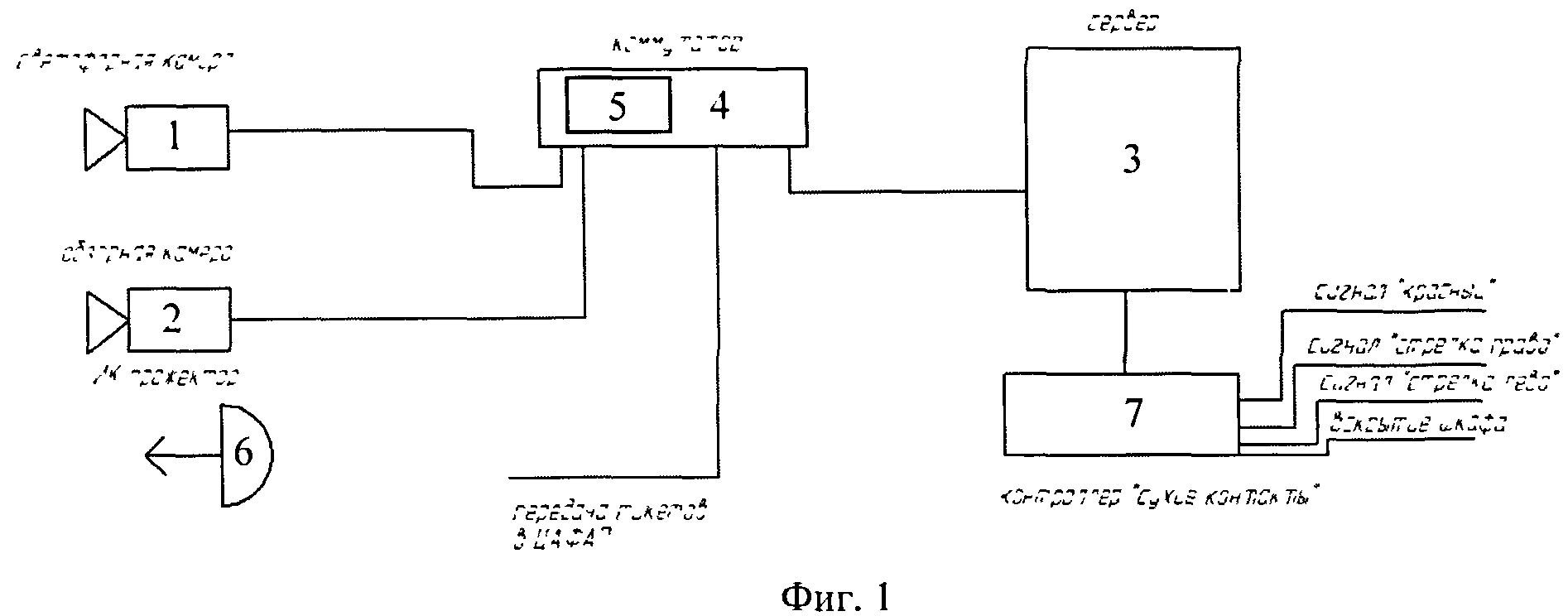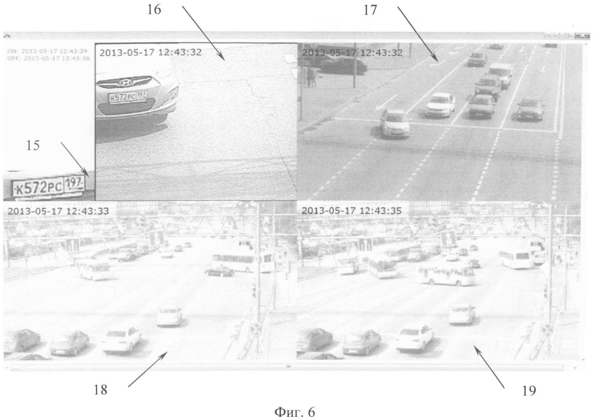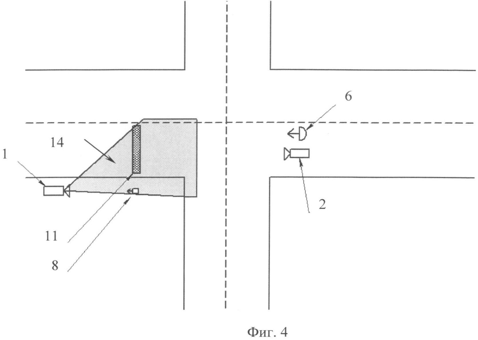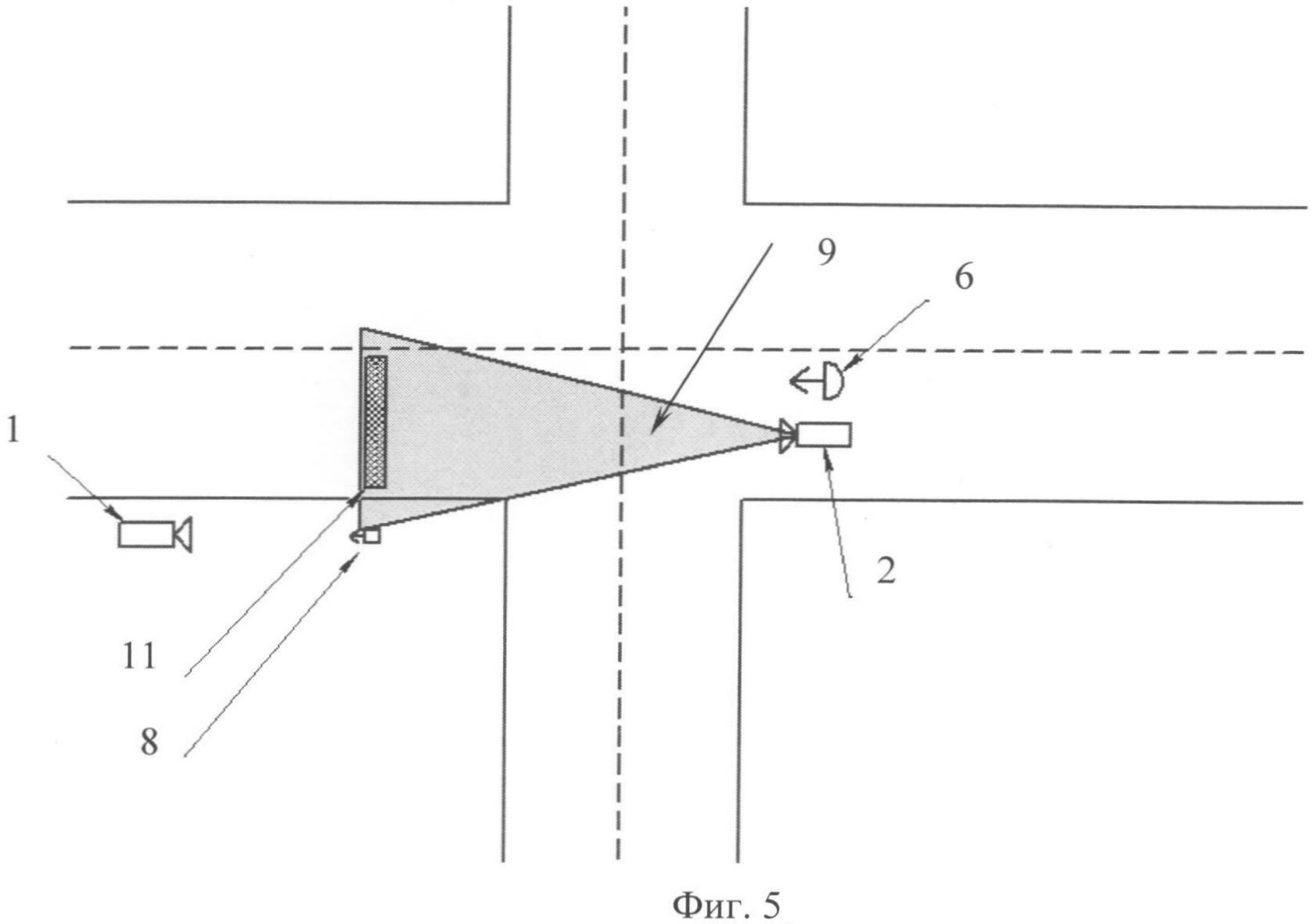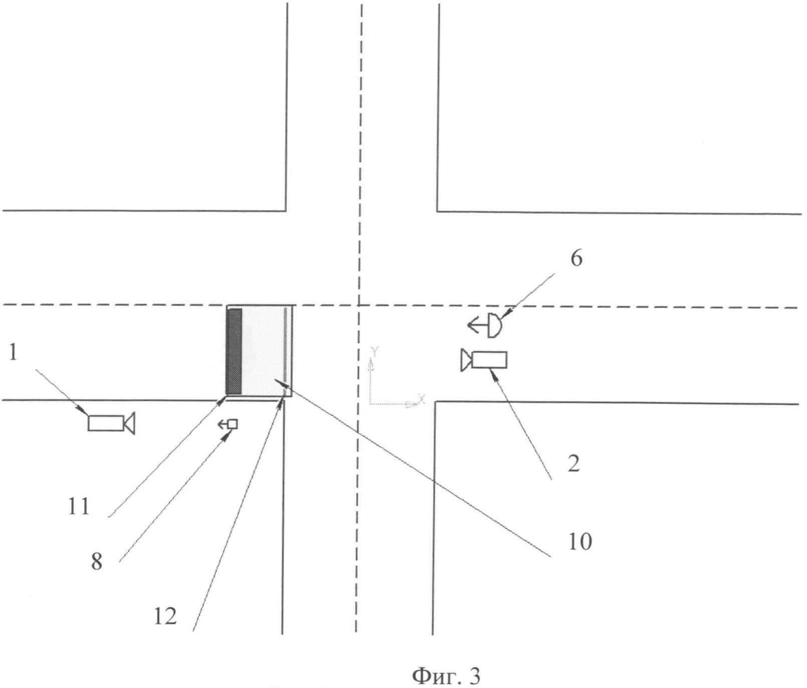 1. Система определения нарушений правил дорожного движения при проезде перекрестка, содержащая, по меньшей мере, одну светофорную камеру, по меньшей мере, одну обзорную камеру и средство передачи данных, соединенные с электронно-вычислительным устройством, которое содержит память с управляющей программой, отличающаяся тем, что обзорная камера выполнена с возможностью формирования изображения зоны стоп-линии, включающей в себя полосы движения проезжей части встречного направления и расположенной между стоп-линией и ближайшей к ней воображаемой линией перекрестка, соединяющей противоположные начала закруглений проезжих частей, а также изображения зоны, расположенной за воображаемой линией перекрестка, соединяющей противоположные начала закруглений проезжих частей; светофорная камера выполнена с возможностью формирования изображения сигналов светофора, регулирующего движение транспортных средств, и одновременно изображения зоны стоп-линии и зоны, расположенной за воображаемой линией перекрестка; электронно-вычислительное устройство с помощью управляющей программы выполнено с возможностью получения и записи в память изображения с обзорной и светофорной камер, с возможностью распознавания на изображении со светофорной камеры индикации сигналов светофора, при этом определения времени начала и времени окончания индикации красного сигнала светофора одной фазы и времени наличия зеленого сигнала в дополнительной секции светофора, с возможностью распознавания государственного регистрационного знака транспортного средства (ГРЗ ТС) и государственного регистрационного номера транспортного средства на изображении с обзорной камеры и определения момента времени распознавания ГРЗ ТС, с возможностью определения нарушения транспортным средством правила дорожного движения «об остановке перед стоп-линией при запрещающем сигнале светофора», при распознавании ГРЗ ТС в зоне стоп-линии на изображении с обзорной камеры в момент времени между временем начала и временем окончания индикации красного сигнала светофора одной фазы, при одновременном отсутствии зеленого сигнала в дополнительной секции светофора для полосы движения, в которой находится транспортное средство; а также с возможностью определения нарушения транспортным средством правила дорожного движения «проезд на запрещающий сигнал светофора», при определении перемещения ГРЗ ТС в зоне стоп-линии на изображении с обзорной камеры во время индикации красного сигнала светофора, при одновременном отсутствии зеленого сигнала в дополнительной секции светофора для полосы движения, в которой находится транспортное средство, и последующего исчезновения ГРЗ ТС за воображаемой линией перекрестка, соединяющей противоположные начала закруглений проезжих частей, во время индикации красного сигнала светофора одной фазы, при одновременном отсутствии зеленого сигнала в дополнительной секции светофора для полосы движения, в которой находится транспортное средство; а также с возможностью формирования для транспортного средства нарушителя информации о факте нарушения правил дорожного движения «об остановке перед стоп-линией при запрещающем сигнале светофора» и «проезд на запрещающий сигнал светофора», при этом средство передачи данных выполнено с в