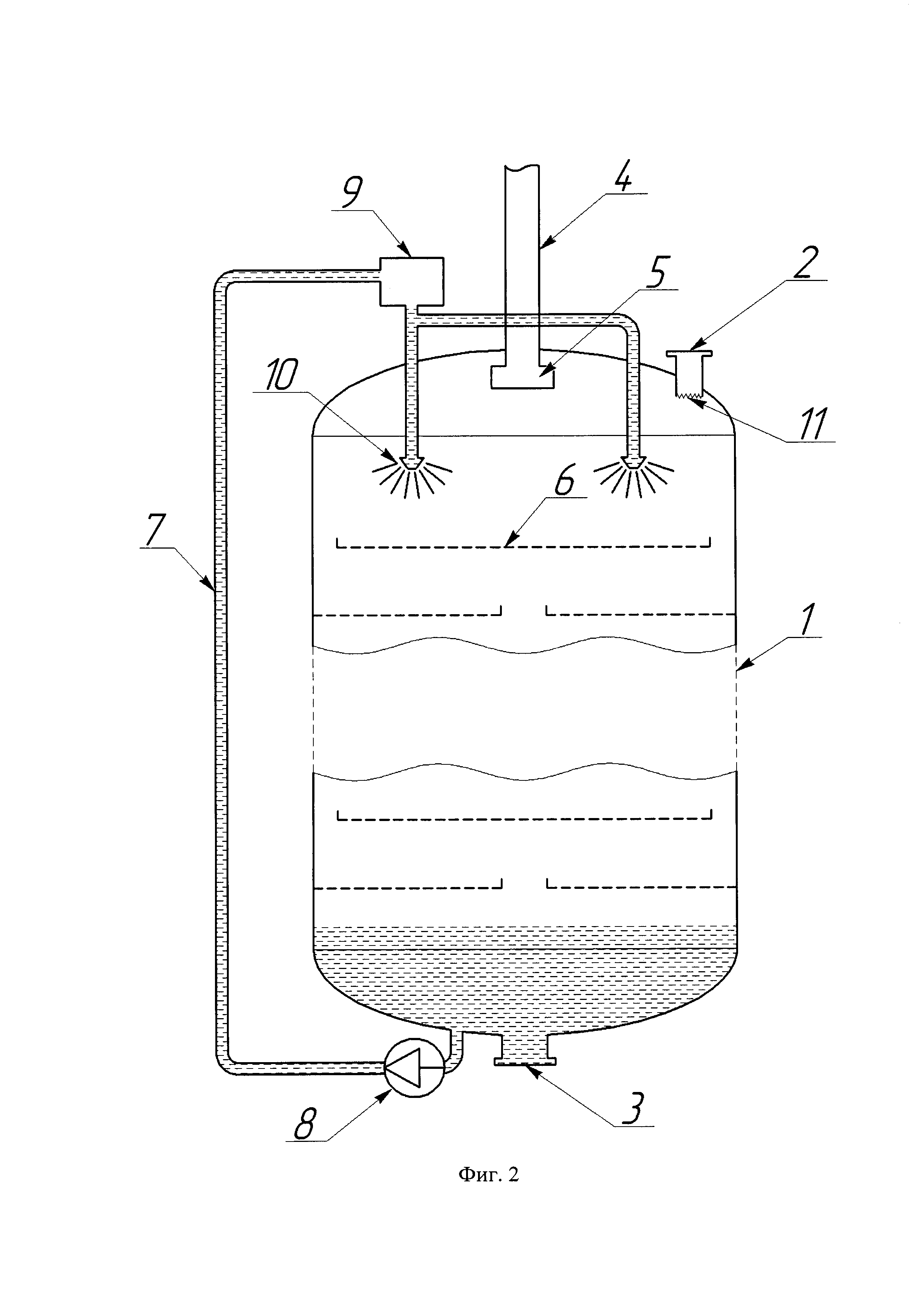 Изобретение относится к устройствам для разрушения нефтяной пены и может быть использовано в нефтяной и нефтеперерабатывающей промышленности. Известно устройство для разрушения пены, состоящее из подводящего трубопровода, трубчатого газового коалесцентора и наклонных пластин, установленных по высоте внахлест с зазорами в месте нахлеста и между корпусом коалесцентора и верхними концами пластин (SU 1308354 А1, опубл. 07.05.1987). Известно также устройство для разрушения пены, состоящее из подводящего трубопровода, патрубков для отвода нефтяной и газовой фаз, трубчатого газового коалесцентора, внутри которого установлены полые цилиндрические элементы в виде труб, касающихся друг друга по нижней образующей, а по верхней образующей трубы выполнены со сквозными отверстиями, расположенными по всей их длине (В.П. Тронов, Прогрессивные технологические процессы в добыче нефти. Сепарация газа, сокращение потерь. Казань, изд-во «ФЭН»,1996. - 308 с.). Основным недостатком известных устройств являются неполное разрушение пены до чистой нефти и сухого газа. Кроме того эти устройства имеют значительные размеры и, следовательно, требуют высокой материалоемкости для их изготовления. Задачей, на решение которой направлено заявленное изобретение, является повышение эффективности разрушения пены и получение очищенной от газа нефти. Технический результат достигается тем, что устройство для разрушения нефтяной пены, содержащее корпус с патрубками вывода отсепарированного газа и дегазированной жидкости, соответственно, в верхней и нижней его части, и подводящий трубопровод и каплеотделитель, дополнительно содержит установленные в корпусе перфорированные диски с буртиками, причем диски установлены попарно и в каждой паре один из дисков установлен с радиальным зазором относительно корпуса, а другой диск выполнен с центральным отверстием и установлен без радиального зазора относительно корпуса, а также трубопровод отвода части дегазированной жидкости с установленным в нем насосом, соединенный с нагревательным элементом и снабженный на конце по меньшей мере одной форсункой, размещенной в верхней части корпуса, при этом подводящий трубопровод снабжен на конце рассекателем потока. Кроме того, форсунки трубопровода отвода части дегазированной жидкости равномерно размещены по окружности относительно продольной оси корпуса. На фиг.1 изображена схема предлагаемого устройства в варианте с одной форсункой на конце трубопровода отвода части дегазированной жидкости; на фиг.2 изображена схема предлагаемого устройства в варианте с двумя форсунками на конце трубопровода отвода части дегазированной жидкости. Устройство для разрушения нефтяной пены включает корпус 1, в верхней и нижней части которого расположены соответственно патрубки вывода отсепарированного газа 2 и дегазированной нефти 3, подводящий трубопровод 4, снабженный рассекателем потока 5, перфорированные диски с буртиками 6, установленные в корпусе попарно таким образом, что один из них (верхний) образует зазор между диском и стенками корпуса, а другой, имеющий центральное отверстие для стекания пены, установлен вплотную к стенке корпуса, трубопровод 7 для отвода части дегазированной жидкости (нефти), установленный в трубопроводе 7 насос 8, соединенный с трубопроводом 7 нагревательный 