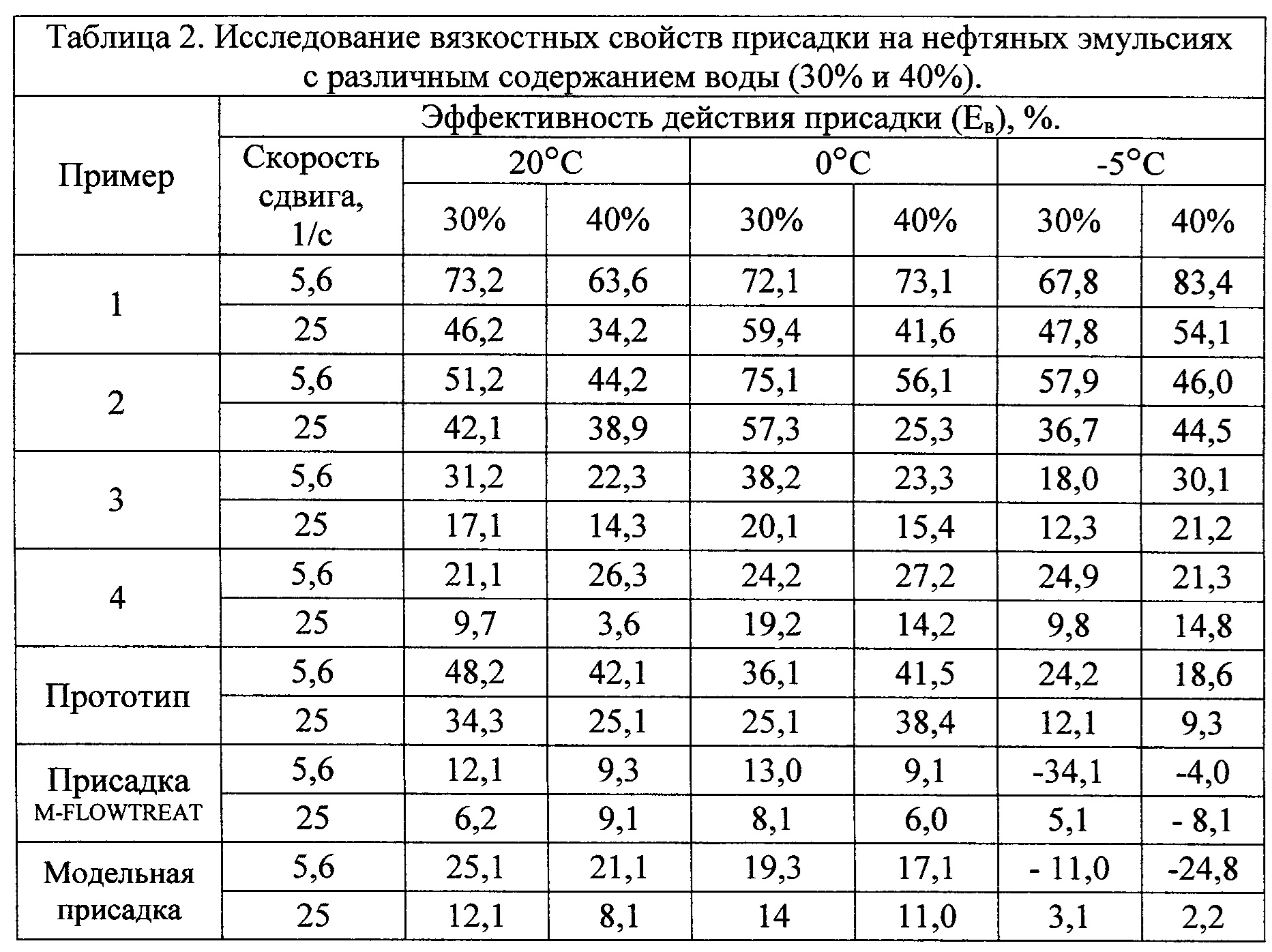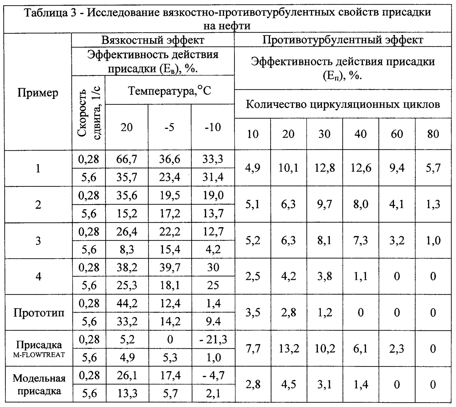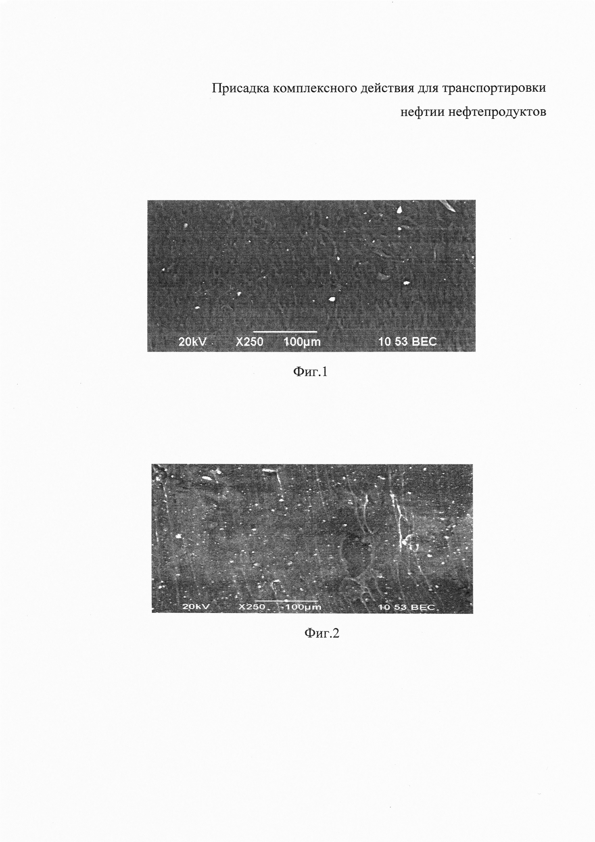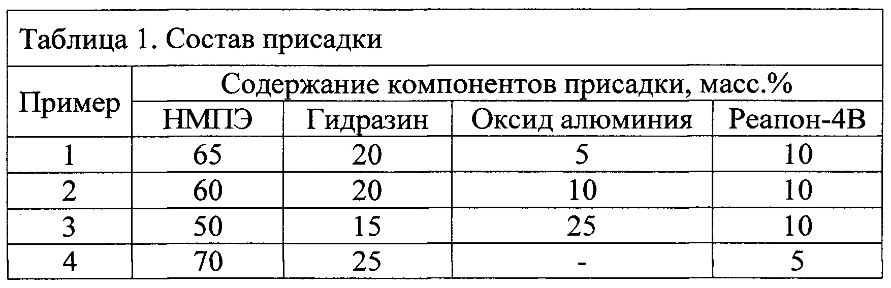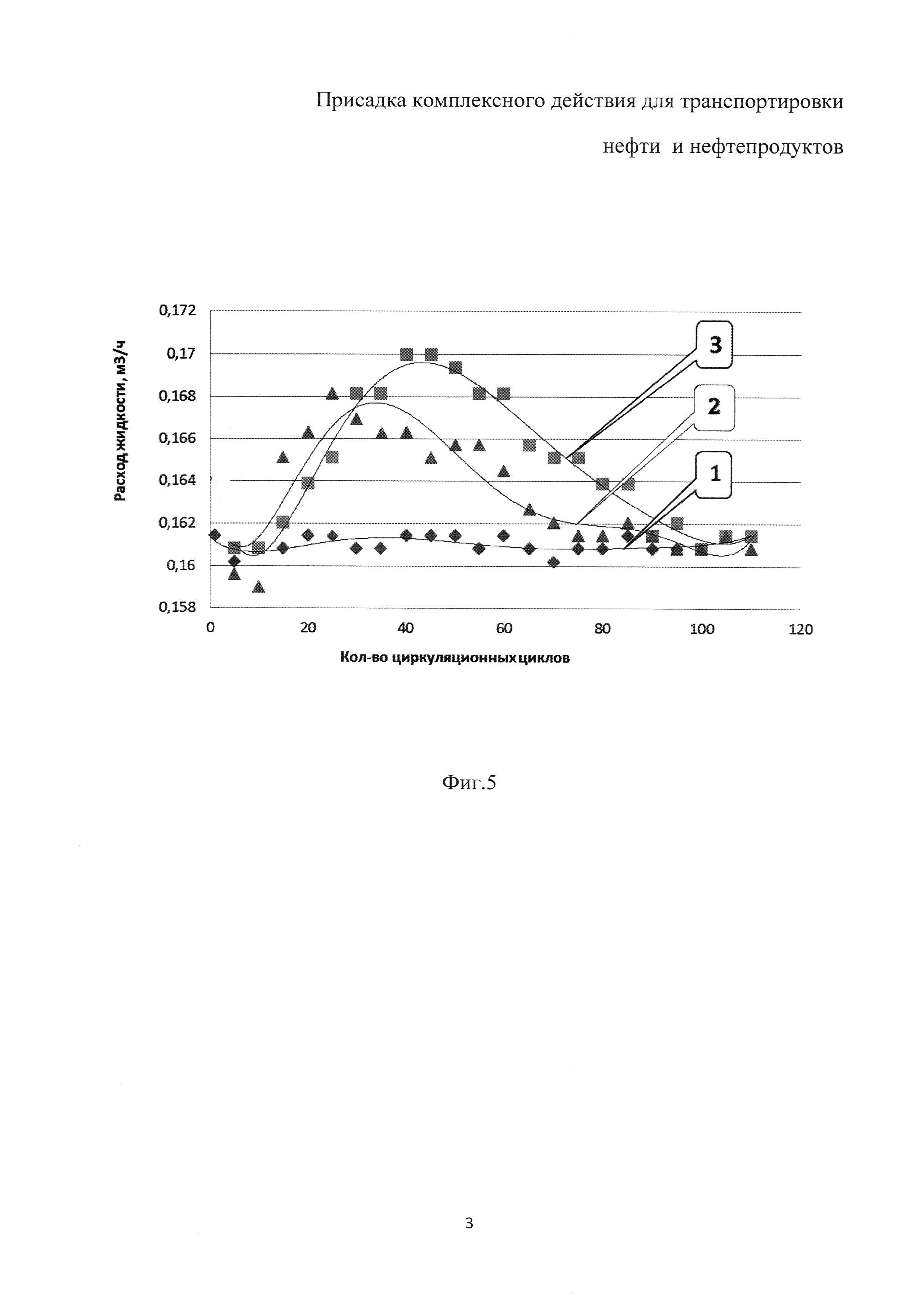 Изобретение относится к нефтяной промышленности, а именно к присадкам для транспортировки нефти и нефтепродуктов по промысловым трубопроводам, и может быть использовано для снижения гидродинамического сопротивления и регулирования реологических свойств вязких нефтей и нефтяных эмульсий. В нефтяной промышленности существует большое разнообразие добавок, основу которых составляет полимерный компонент. Наибольшее распространение среди них получили вязкостные и противотурбулентные присадки, которые нацелены либо на снижение вязкости, либо - на снижение гидравлического сопротивления. Эти присадки позволяют существенно снизить затраты на перекачку жидкостей по трубопроводу и нагрузку на перекачивающее оборудование. Однако они не способны решать обе эти задачи совместно. Поэтому актуальным направлением разработки такого рода присадок, снижающих эксплуатационные затраты на транспортировку нефти и нефтяных эмульсий, является формирование композиций, обладающих как вязкостным, так и противотурбулентным действиями. Известны полимерные присадки противотурбулентного действия на основе полисахарида (US №2007205392, С09K 5/10, 2007), полиакриламида (WO 2412395, МПК C10L 1/2383, 2008), полиолефинов (US №61722151, MПК C08L 33/26, 2001). Однако они не способны оказывать существенного влияния на изменение реологических свойств нефти и нефтяных эмульсий. Известны композиции, снижающие вязкость (например, патенты RU 1271375, RU 2285034, RU 1271375, RU 2453584, RU 2242503). Известные присадки нацелены на изменение реологических свойств нефтей и нефтепродуктов, однако они не обладают противотурбулентным действием по отношению к нефтям и нефтяным эмульсиям при их транспортировке трубопроводным транспортом. Кроме того, эти присадки теряют свою эффективность в условиях турбулентного режима течения жидкости. Полимерные присадки, обладающие как противотурбулентными, так и вязкостными свойствами, в источниках информации не были выявлены. В качестве прототипа выбрана композиционная депрессорная присадка, используемая для парафинистых и высокопарафинистых нефтей, включающая в свой состав сополимер этилена с винилацетатом, сукцинимид мочевины, триэтаноламин, неонол, сульфонат натрия (патент RU 2453584, МПК C10L 1/182, опубл. 20.06.2012). Однако данная присадка не способна снижать гидравлическое сопротивление прокачиваемой жидкости в трубопроводной системе. Задачей настоящего изобретения является создание присадки комплексного действия, предназначенной для снижения гидродинамического сопротивления и для регулирования реологических свойств вязких нефтей и нефтяных эмульсий при транспортировке трубопроводным транспортом. Поставленная задача решается тем, что присадка комплексного действия, для транспортировки нефти и нефтепродуктов, содержащая полимер, азотсодержащее соединение и поверхностно-активное вещество, согласно изобретению, дополнительно содержит наноразмерный оксид алюминия с размерами частиц 40 нм, а в качестве полимера содержит низкомолекулярный полиэтилен, в качестве азотсодержащего вещества - гидразин, в качестве поверхностно-активного вещества - неионогенное поверхностно-активное вещество Реапон-4В при следующем соотношении компонентов, мас.%: Техническим результатом изобретения является присадка комплексного действия, которая снижает вязкость и гидродинамическо