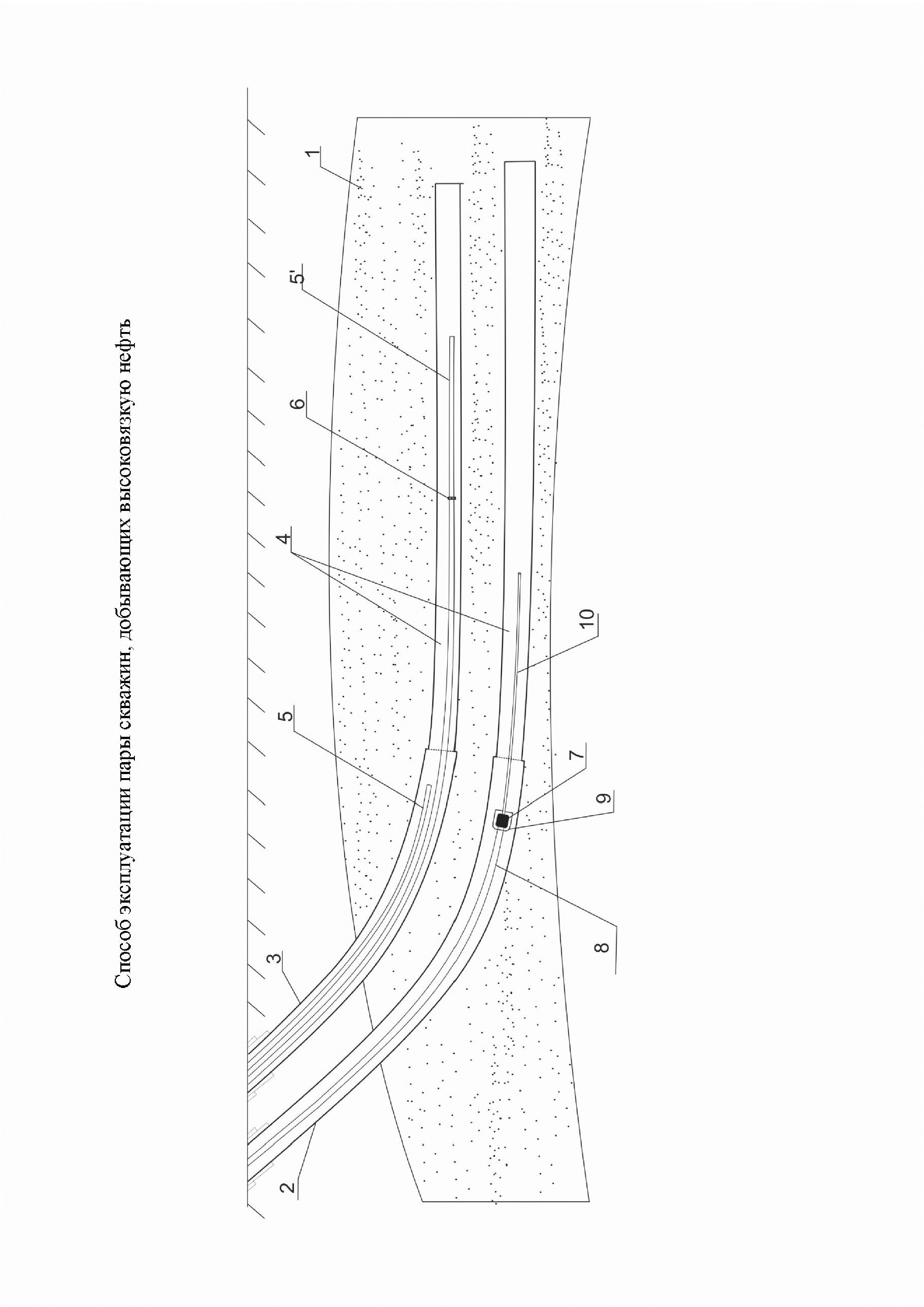 Способ эксплуатации пары скважин, добывающих высоковязкую нефть, включающий строительство с фильтровыми частями в соответствующих горизонтальных стволах добывающей скважины и нагнетательной скважины, расположенной ниже и параллельно добывающей скважины, проведение в горизонтальном стволе нагнетательной скважины геофизических исследований по определению нефтенасыщенности вдоль горизонтального ствола, размещение в нагнетательной скважине двух колонн насосно-компрессорных труб - НКТ, при этом конец колонны НКТ меньшего диаметра размещают в начале горизонтального ствола, а конец колонны НКТ большего диаметра в зоне с нефтенасыщенностью более 60%, регулируемую закачку пара в нагнетательную скважину через колонны НКТ различного диаметра, а посредством геофизических исследований в горизонтальном стволе добывающей скважины выявляют переходную зону с температурой между большим и меньшим прогревом, из которой осуществляют отбор электроцентробежным насосом, причем при снижении температуры жидкости ниже максимально допустимой на входе насоса увеличивают закачку пара через нагнетательную скважину, а при повышении температуры на входе насоса снижают закачку пара через нагнетательную скважину и/или переводят насос в периодический режим работы, отличающийся тем, что перед спуском в нагнетательную скважину в колонне НКТ большего диаметра оснащают одну или несколько муфт одним или двумя отверстиями, располагаемыми по периметру равномерно, отверстия во время спуска размещают в районе середины фильтровой части для создания дополнительной точки или нескольких точек закачки пара для равномерного прогрева вдоль всего горизонтального ствола скважины и большего охвата пласта, при этом муфты с 2-мя отверстиями используют при объеме закачки пара не менее 120 т/сут в НКТ большего диаметра, причем при длине фильтровой части менее 500 м спускают одну муфту с отверстием или 2-мя отверстиями примерно 6 мм, при длине 500-700 м спускают одну муфту с отверстием или 2-мя отверстиями примерно 8 мм, при длине фильтровой части более 700 м спускают 2 муфты с отверстием или 2-мя отверстиями 8 мм и расстоянием между данными муфтами не менее 100 м, в добывающую скважину спускают насос с хвостовиком, сообщенным с входом насоса, вход хвостовика размещают в переходной температурной зоне, а насос - за пределами фильтровой части горизонтального ствола добывающей скважины.