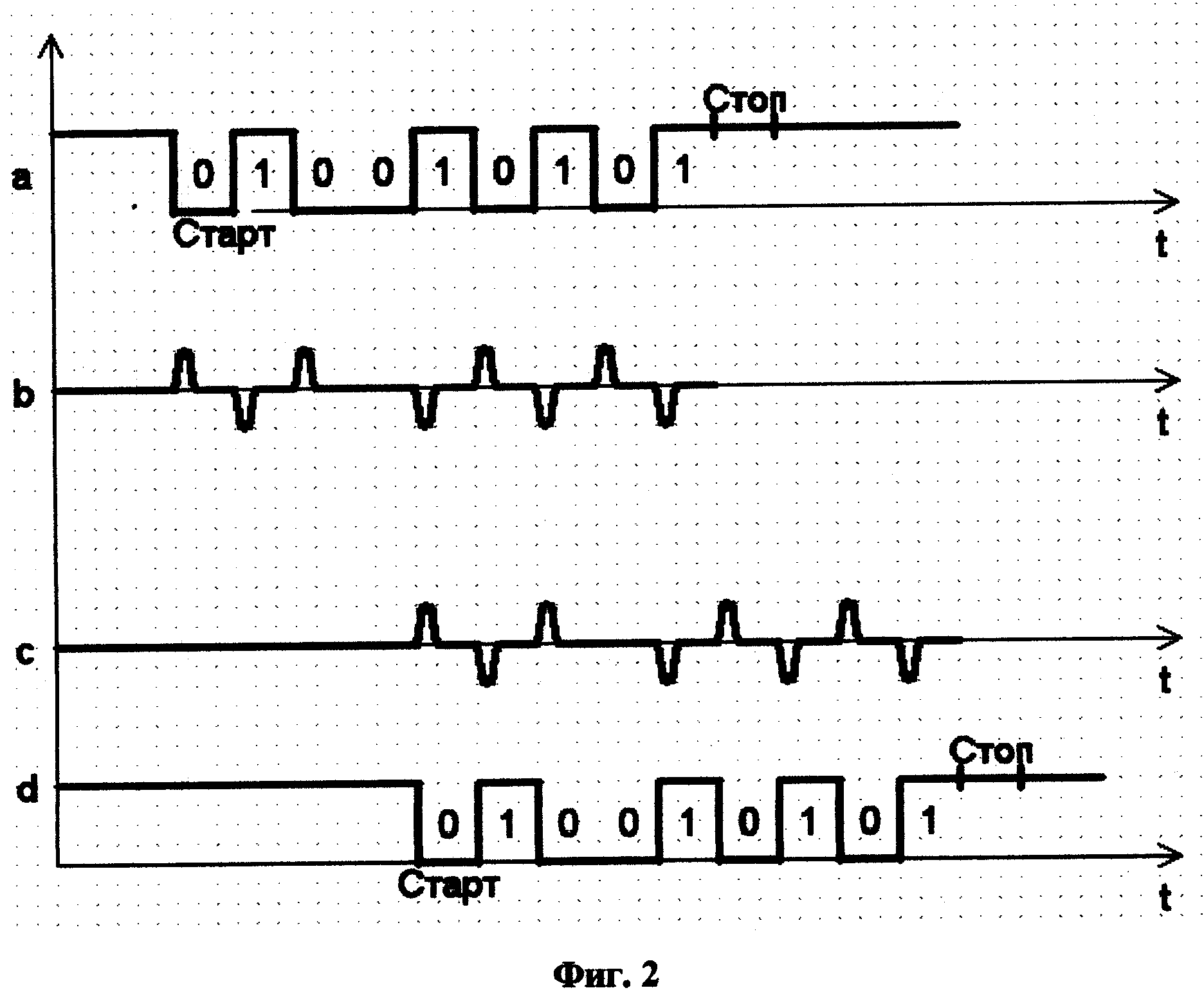1. Приемопередатчик последовательного интерфейса с элементом гальванической развязки, содержащий элемент гальванической развязки, последовательно включенные кодирующее устройство входной информации, формирователь длительности импульсов, оконечный усилитель передатчика, а также последовательно включенные входной усилитель приемника и декодирующее устройство, отличающийся тем, что элемент гальванической развязки включен между оконечным усилителем передатчика и линий связи, а вход усилителя приемника подключен к выходу оконечного усилителя передатчика, при этом входные сигналы, поступающие на элемент гальванической развязки, кодируются двумя разнополярными импульсами, соответствующими фронту и спаду входного сигнала. 2. Приемопередатчик по п.1, отличающийся тем, что декодирующее устройство имеет вход установки декодера в исходное состояние. 3. Приемопередатчик по п.1, отличающийся тем, что формирователь длительности импульсов имеет входы для установки оптимальной длительности выходных импульсов, поступающих в линию связи. 4. Приемопередатчик по п.1, отличающийся тем, что входной усилитель приемника имеет входы для установки оптимального порога срабатывания приемника.