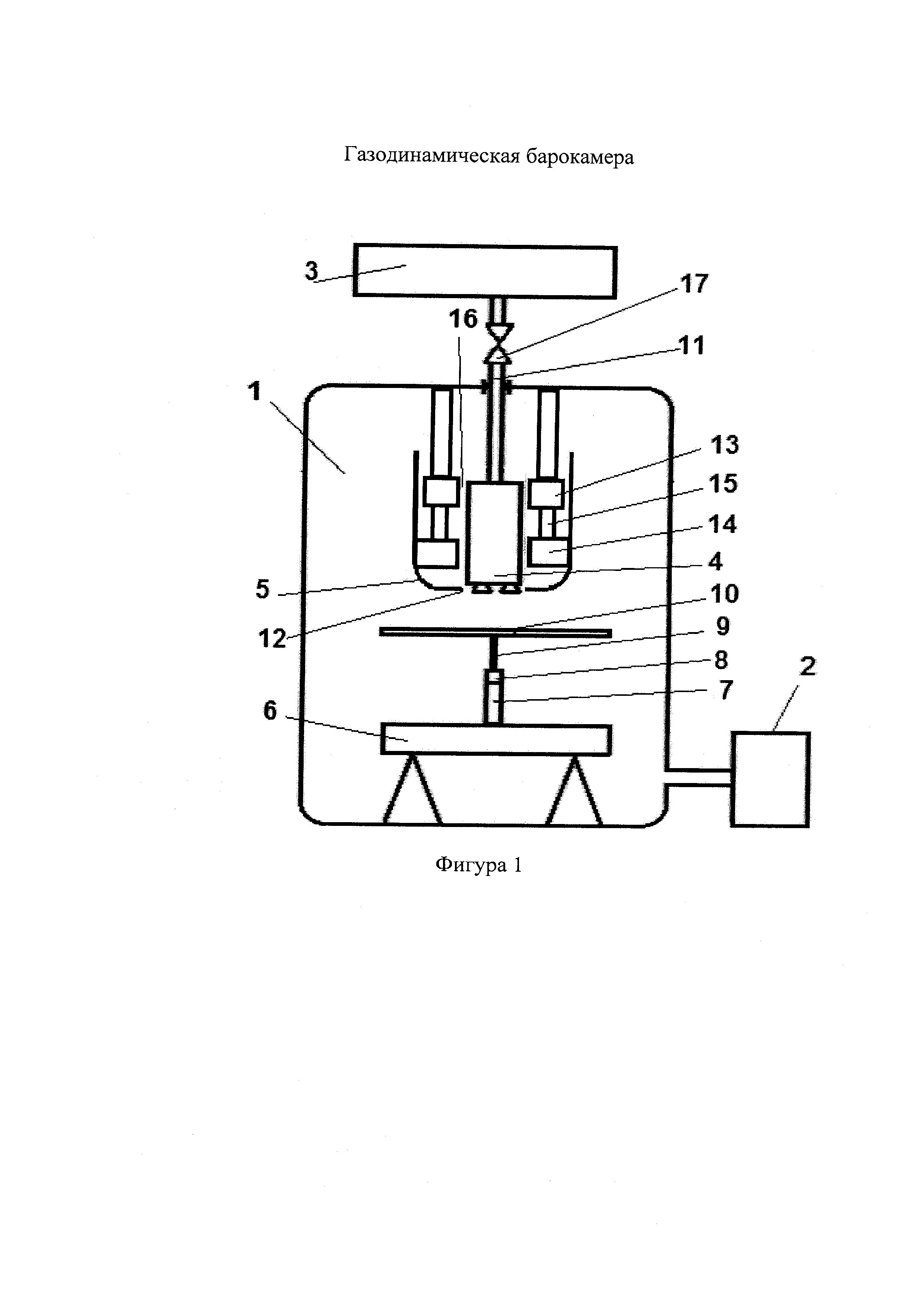 Предложение относится к области экспериментальной аэрогазодинамики и может быть использовано для определения газодинамических нагрузок на модели летательных аппаратов с работающими двигателями при моделировании и экспериментальном исследовании струйного взаимодействия в процессах разделения высотных ступеней ракет-носителей, отделения космических аппаратов от разгонных блоков, причаливания, стыковки и расстыковки космических аппаратов на орбите, посадки космических аппаратов на поверхность планет с разреженной атмосферой и старта с них. В газодинамической барокамере, содержащей вакуумную камеру, системы вакуумирования, газообеспечения, управления и измерений, подключенное к системе измерений силоизмерительное устройство, активную модель летательного аппарата с сопловым блоком, соединенным с трубопроводом системы газообеспечения, пассивную модель и установленный в рабочей зоне вакуумной камеры координатник, координатник снабжен установленным на его выходе и подключенным к системам управления и измерений быстродействующим сервомеханизмом линейного перемещения с встроенным датчиком перемещения его штока, на котором закреплена пассивная модель, а активная модель летательного аппарата снабжена выполненной по форме его кормовой части тонкостенной оболочкой, отделенной зазором от соплового блока и закрепленной на силоизмерительном устройстве, корпус которого выполнен в виде соосных колец, соединенных симметрично размещенными вокруг их оси измерительными элементами, при этом упомянутый корпус охватывает с зазором сопловой блок и трубопровод и установлен соосно сопловому блоку. Технический результат – обеспечение возможности при кратковременном эксперименте измерения силового воздействия на активную модель летательного аппарата струй собственной двигательной установки, отраженных от пассивной модели или от поверхности посадки (старта), моделирования скорости относительного перемещения активной и пассивной моделей летательного аппарата и получения экспериментальных данных для разных расстояний между активной и пассивной моделями. 1 з.п. ф-лы, 2 ил.
