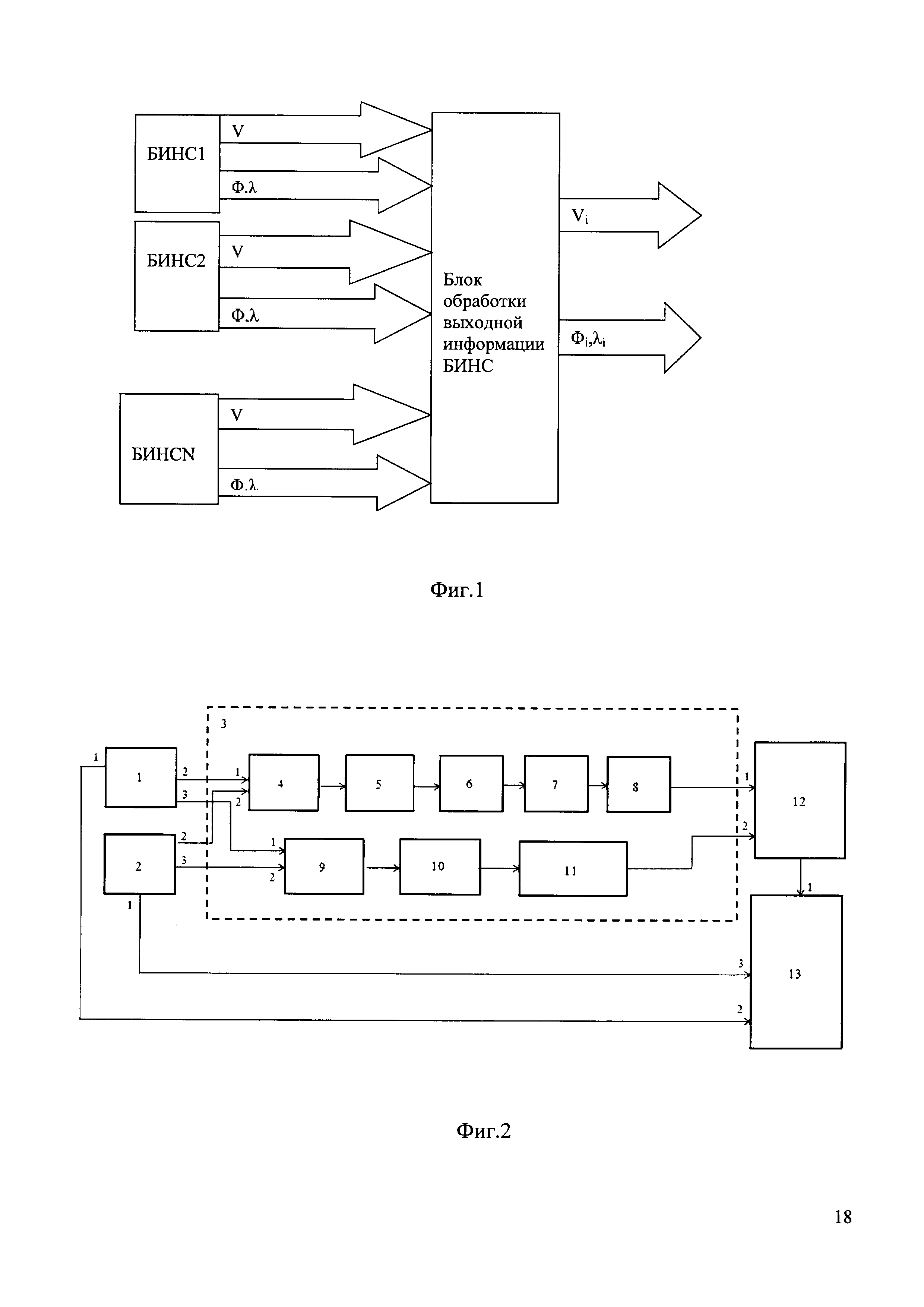 Изобретение относится к навигационно-пилотажным комплексам, объединяющим несколько инерциальных навигационных систем для формирования обобщенной выходной информации о местонахождении объекта, его ориентации в пространстве и его скоростях, а также использующим внешнюю информацию для коррекции систем, входящих в состав комплекса. Известный способ комплексирования инерциальных навигационных систем осуществляется посредством выбора выходной информации инерциальных навигационных систем (ИНС) по мажоритарному признаку, т.е. наиболее достоверной информацией, поступающей в комплекс от различных систем, считается та информация, которая имеет наименьшее расхождение, в частности, выбирается та система, для коррекции которой используется внешняя информация, обеспечивающая повышение точности выходных параметров системы. Другие системы, входящие в состав навигационного комплекса, выполняют функции не более как резервного канала, обеспечивающие повышение надежности всего комплекса. Примером комплекса, реализующего известный способ, является навигационно-пилотажный комплекс ВП-021 (см. Фиг. 1). Технической задачей предлагаемого способа комплексирования инерциальных навигационных систем является повышение точности выходной информации навигационно-пилотажного комплекса и глубины контроля систем, входящих в состав комплекса. Указанная техническая задача решается благодаря способу комплексирования бесплатформенных инерциальных навигационных систем, заключающемуся в том, что выходная информация, поступающая по меньшей мере с двух бесплатформенных инерциальных систем, сравнивается по мажоритарному признаку, после чего отбраковывается информация той бесплатформенной инерциальной системы, которая наиболее отклоняется от остальных, при этом согласно изобретению первичная информация в виде матриц ориентации и приращений линейных скоростей поступает с выходов бесплатформенных инерциальных систем на вход блока обработки первичной информации, в котором по заданному критерию формируется осредненное значение матрицы ориентации и приращения линейных скоростей, эти осредненные значения поступают на вход блока решения навигационных уравнений, а полученные в результате решения навигационных уравнений выходные параметры в виде текущих координат и курса объекта и его скоростей поступают на вход блока контроля, в котором производится сравнение выходных параметров бесплатформенных инерциальных систем с выходными параметрами блока решения навигационных уравнений и анализ отказных ситуаций узлов бесплатформенных инерциальных систем. Специфика решения задачи навигации с использованием БИНС заключается в отсутствии сигналов управления датчиками моментов (ДМ) системы. Поэтому для повышения точности выходной информации комплекса и повышения глубины контроля систем, входящих в состав комплекса, комплексирование нескольких БИНС предлагается выполнять путем предварительной обработки первичной информации, поступающей с систем - матрица ориентации и ускорения в осях акселерометров блока чувствительных элементов (БЧЭ) - с последующим решением навигационных уравнений на основе обработанной первичной информации, получаемой от систем, входящих в состав комплекса, с последующим контролем поступающей от систем 
