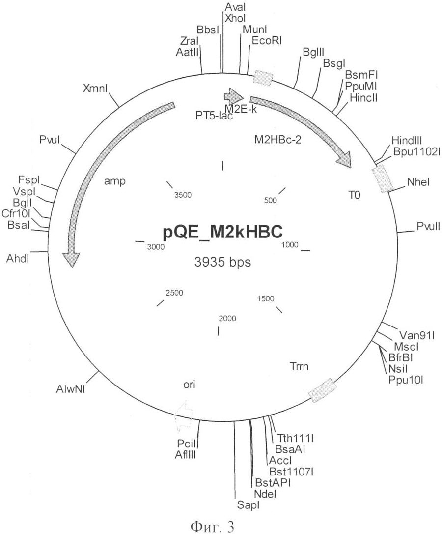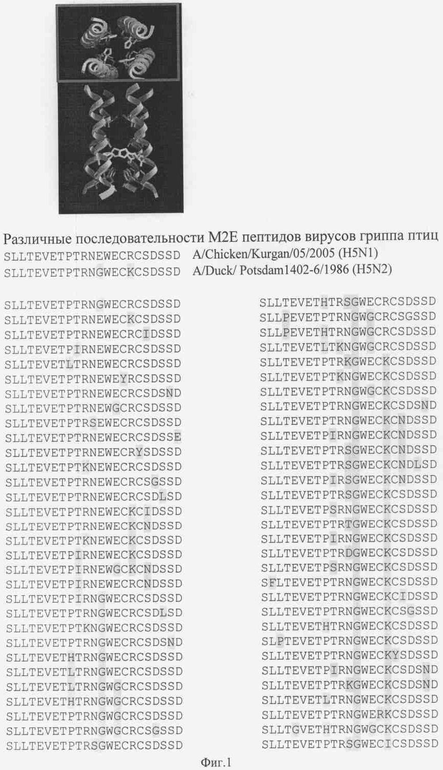 Область применения Настоящее изобретение относится к иммунологии и белковой инженерии и, в частности, к созданию иммуногенных препаратов и вакцин, которые могут быть использованы для профилактики птичьего гриппа. Актуальность Грипп является одним из наиболее распространенных вирусных заболеваний человека и животных. Гриппозная инфекция часто протекает тяжело и иногда приводит к смертельному исходу. Некоторые штаммы вируса, например «испанка» в 1918-1920 годах, способны вызывать пандемии в мировом масштабе, сопровождающиеся высокой смертностью. Высокая изменчивость поверхностных белков вируса, гемаглютинина и нейраминидазы приводит к возникновению нового эпидемического штамма каждые 1-2 года, с такой же частотой требуется изготовление «стандартных» штамм-специфических вакцин. Одним из потенциальных источников антигенной изменчивости вируса гриппа человека является его рекомбинация с вирусами гриппа животных, которая может привести к возникновению нового высокопатогенного рекомбинантного вируса, «неизвестного» иммунной системе человека и потому способного вызвать пандемию. Одним из наиболее потенциально опасных вариантов будет рекомбинация с вирусами гриппа птиц, смертельно опасными как для домашней птицы, так и для млекопитающих, но в настоящее время пока не передающегося от человека к человеку. В то же время создание традиционной вакцины от нового штамма требует длительного времени (от 6 до 9 месяцев), в течение которого появление нового пандемического штамма гриппа может привести к гибели миллионов людей. Одним из перспективных путей решения проблемы получения «пандемической» вакцины является создание «универсальных» вакцин, основанных на использовании консервативных иммунодоминантных пептидов, например внеклеточного домена М2 белка вируса гриппа, последовательность которого практически инвариантна у всех человеческих штаммов. Однако у вирусов птичьего гриппа эта последовательность заметно отличается от человеческой. Таким образом, задача создания «универсальных» вакцин против вирусов гриппа птиц, продолжает оставаться актуальной. Такая вакцина, с одной стороны, может быть использована для вакцинации домашней птицы, для предотвращения распространения птичьего гриппа в птицеводческих хозяйствах и уменьшения, тем самым, вероятности появления вирусов гриппа птиц, адаптированных к человеку. С другой стороны, такая вакцина может обеспечить защиту человека от нового «гибридного» вируса, если рекомбинация между птичьим и человеческим вирусами с образованием нового пандемического штамма все-таки произойдет. Эпидемическая обстановка в странах Юго-Восточной Азии свидетельствует о том, что вероятность этих событий и появления пандемического вируса возрастает с каждым днем циркуляции вируса H5N1. Уровень техники. 1) Современные противогриппозные вакцины В таблице 1 представлены перечень и характеристики противогриппозных вакцин, зарегистрированных и использующихся в России. Все вакцины могут быть разделены на следующие типы: 1. Живые 2. Инактивированные - цельновирионные - расщепленные (тоже цельновирионные) - субъединичные Из этого перечня видно, что для таких актуальных вакцин, как противогриппозные, вообще не разрабатывались рекомбинантные эпиотопные вакцины. Однако преимущество генно-инж