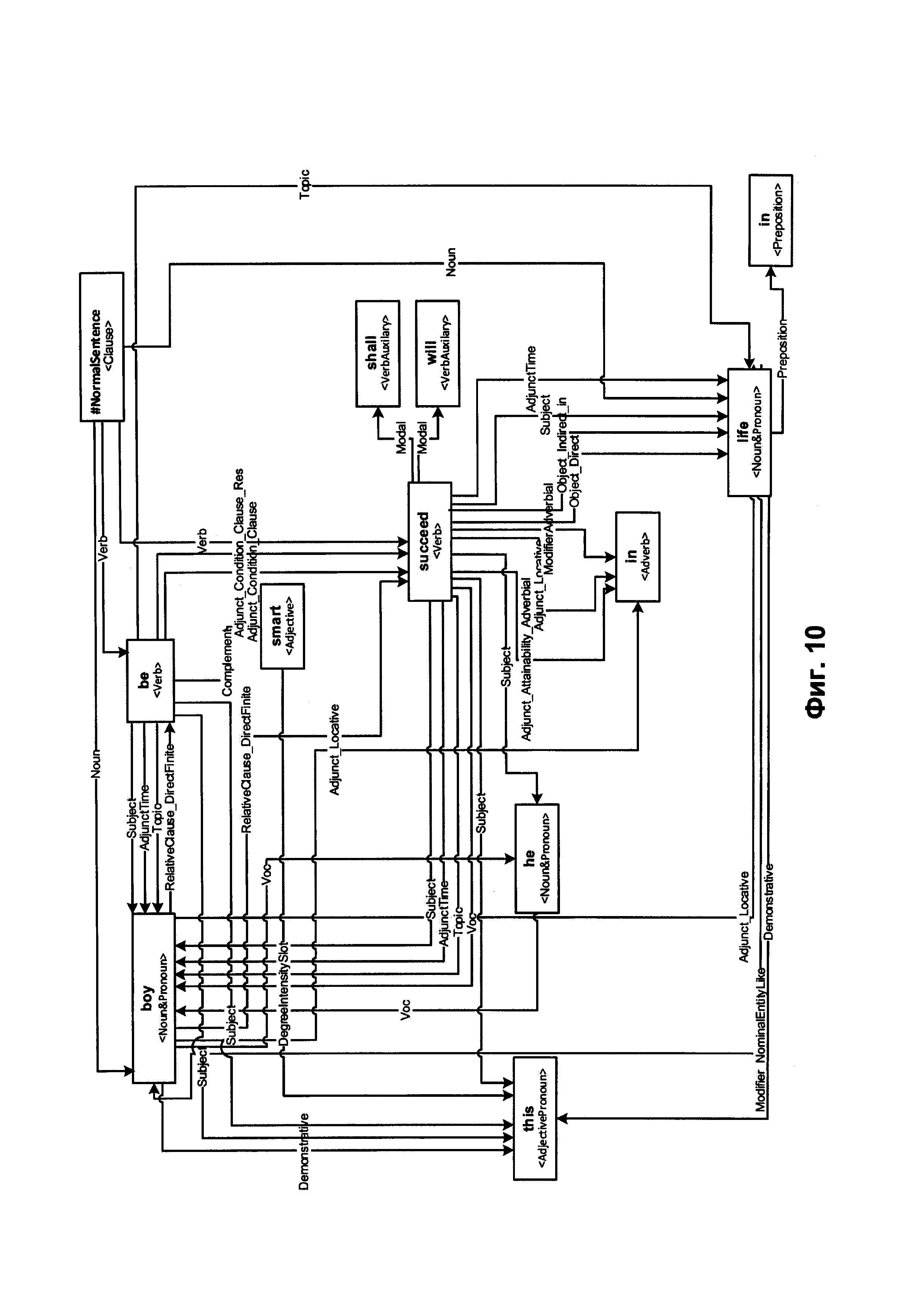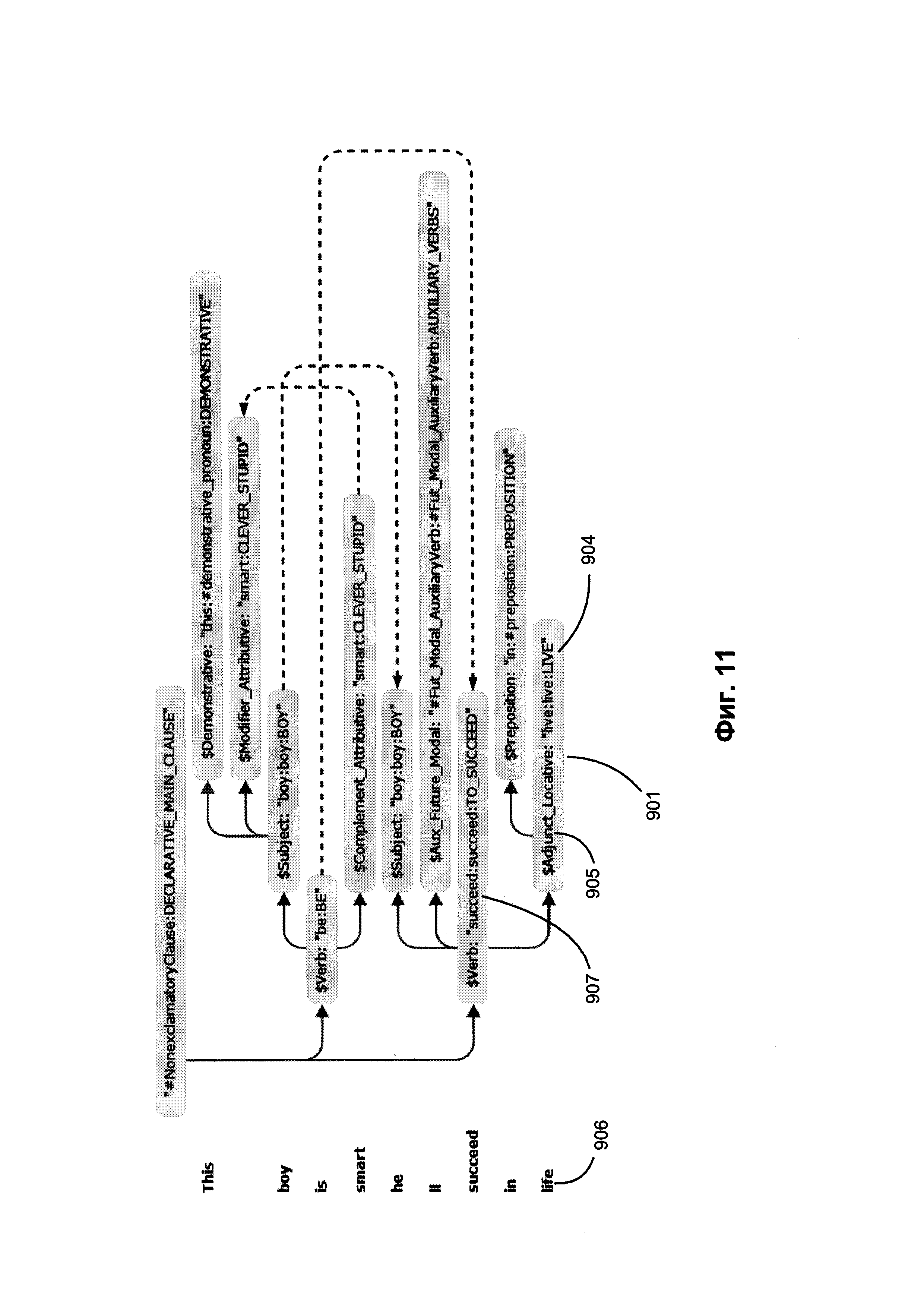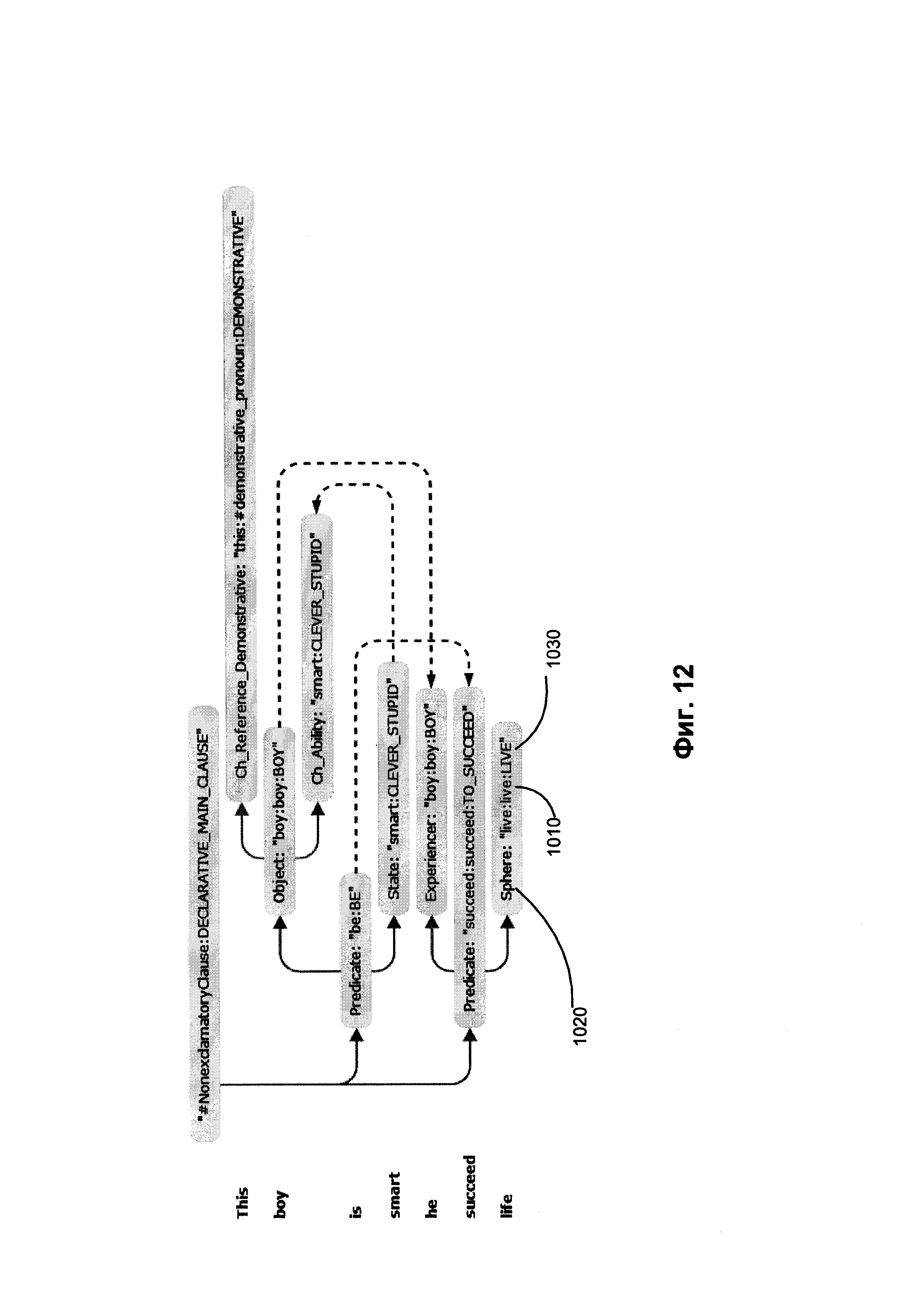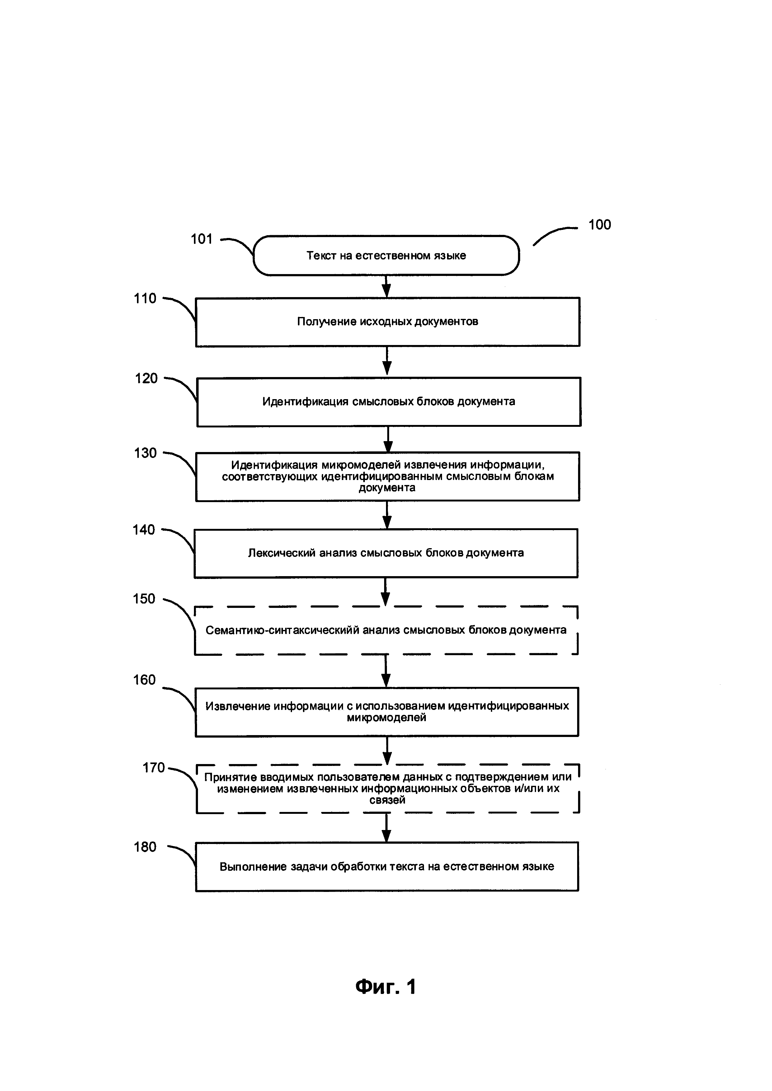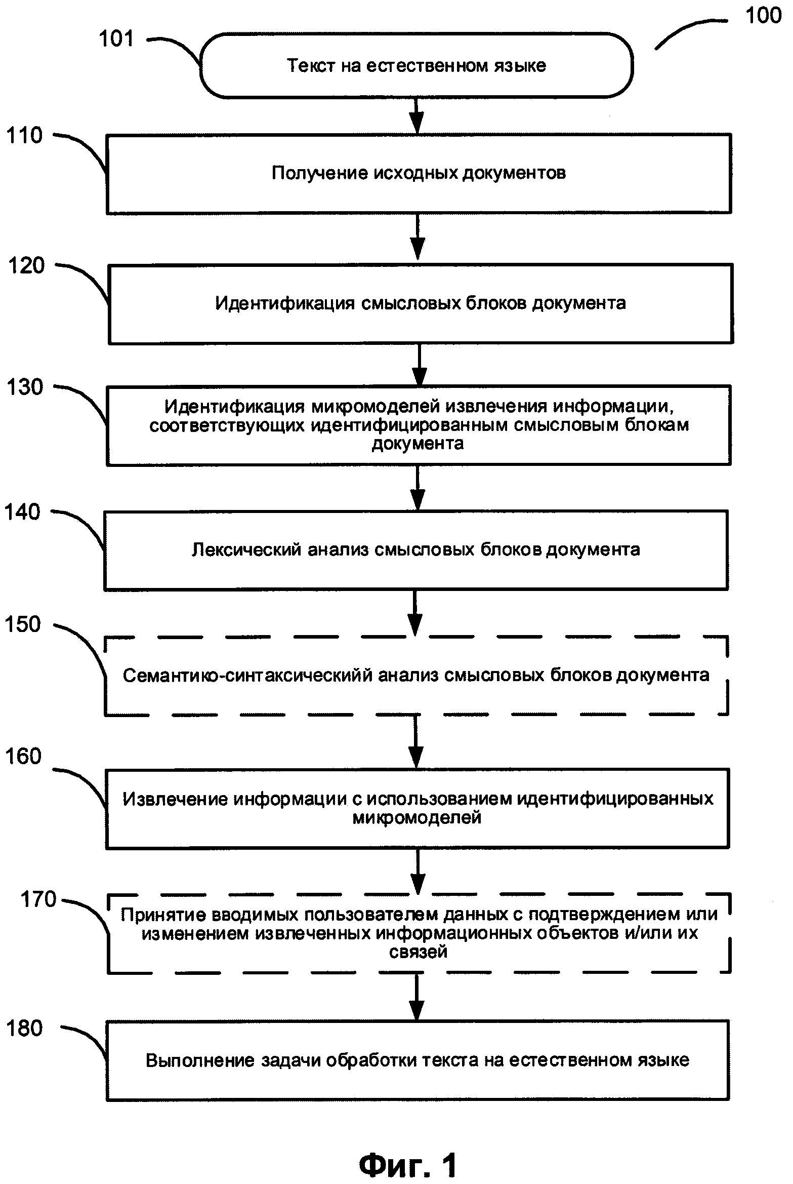 1. Способ извлечения информации из документов, содержащих текст на естественном языке, включающий: идентификацию в тексте на естественном языке смыслового блока, относящегося к заданной категории, где смысловой блок является частью документа, относящейся к определенной теме и/или описывающей определенные вопросы или проблемы и/или содержащей информационные объекты, имеющие определенные семантические связи; выполнение с помощью вычислительной системы лексического анализа множества слов смыслового блока текста на естественном языке с целью создания множества лексических структур, представляющих смысловой блок текста на естественном языке; идентификацию микромодели для извлечения информации, относящейся к заданной категории, при этом микромодель для извлечения информации включает множество продукционных правил, связанных с онтологией; применение продукционных правил идентифицированной микромодели с целью извлечения информационных объектов, каждый из которых связан с соответствующим семантическим классом, соответствующим концепту онтологии. 2. Способ по п. 1, дополнительно включающий: выполнение семантико-синтаксического анализа смыслового блока текста на естественном языке с целью построения множества семантико-синтаксических структур, представляющих смысловой блок текста на естественном языке. 3. Способ по п. 2, дополнительно включающий: интерпретацию множества семантико-синтаксических структур с помощью множества продукционных правил с целью извлечения информационных объектов, каждый из которых связан с соответствующим семантическим классом, соответствующим концепту онтологии. 4. Способ по п. 1, дополнительно включающий: использование извлеченных информационных объектов для выполнения задач обработки текстов на естественном языке, включая по меньшей мере одну из следующих задач: извлечение информации, информационный поиск, машинный перевод, семантический поиск, классификация или кластеризация документов или фильтрация текста. 5. Способ по п. 1, дополнительно включающий: представление определенных информационных объектов с помощью графа среды определения ресурса (RDF). 6. Способ по п. 1, отличающийся тем, что идентификация смысловых блоков, связанных с заданной категорией, дополнительно включает: идентификацию в тексте на естественном языке по меньшей мере одного заданного слова, или заданного пунктуатора, или заданного предложения, или заданного признака форматирования. 7. Способ по п. 1, дополнительно включающий: визуальное отображение идентифицированных информационных объектов, связанных со смысловым блоком текста на естественном языке; принятие вводимых пользователем данных для подтверждения идентифицированных информационных объектов или изменения идентифицированных информационных объектов или для выполнения сочетания этих действий. 8. Способ по п. 3, дополнительно включающий: визуальное отображение идентифицированных информационных объектов и связей между идентифицированными информационными объектами с визуальной связью со смысловым блоком текста на естественном языке; принятие вводимых пользователем данных для подтверждения идентифицированных информационных объектов и связей между идентифицированными информационными объектами или изменения идентифицированных информаци