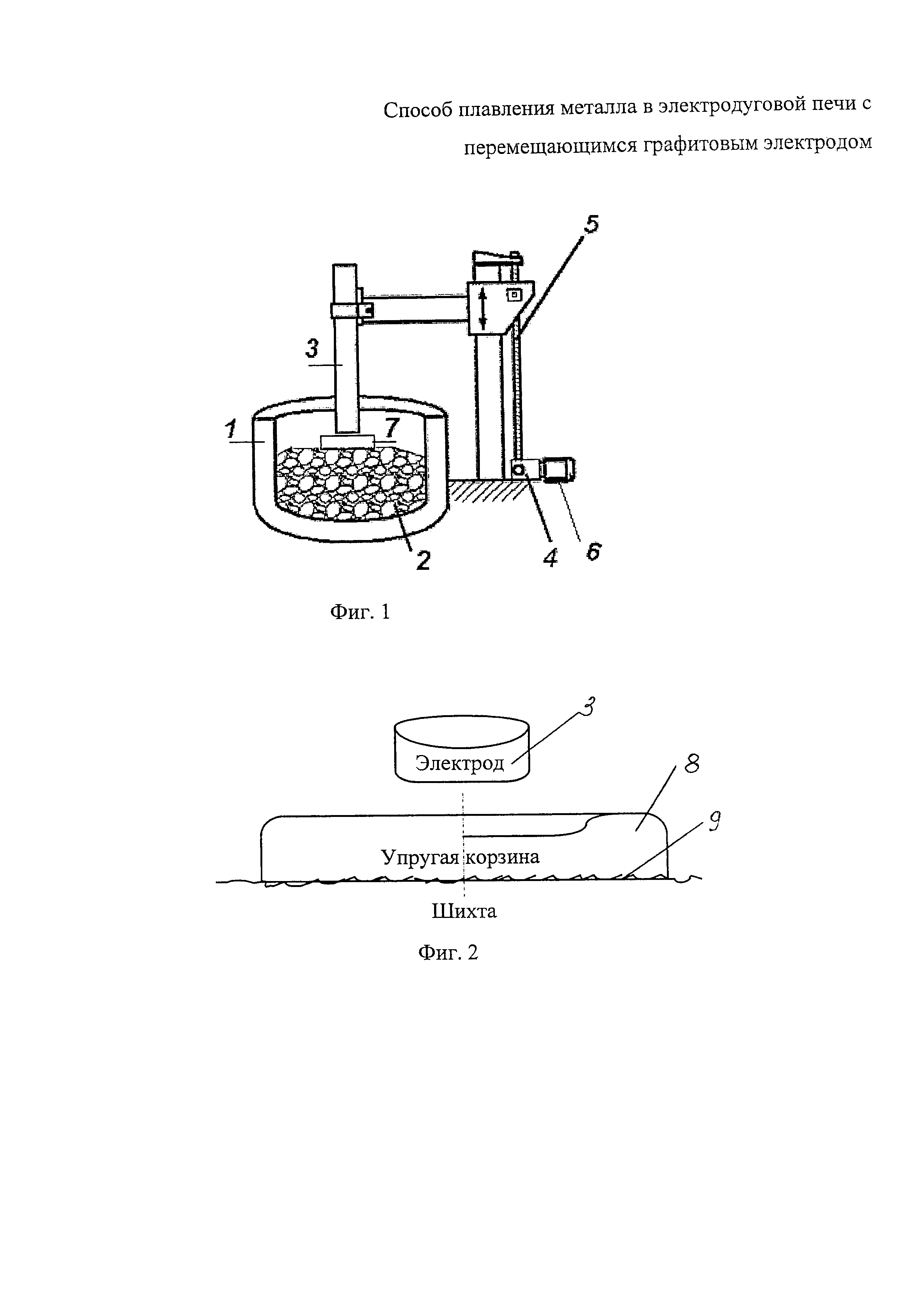 1. Способ плавления металла в электродуговой печи с перемещающимся графитовым электродом, включающий загрузку холодной шихты в футерованный огнеупором кожух и опускание с помощью привода и системы управления в него графитового электрода, подключенного к источнику питания, отличающийся тем, что перед началом плавки между холодной шихтой и торцом электрода устанавливают упругий токопроводящий элемент, опускают электрод до касания с упругим элементом, обеспечивают технологическое короткое замыкание, посредством системы управления осуществляют подъем электрода с формированием электрической дуги сначала между электродом и упругим элементом, а затем, по мере расплавления упругого элемента, между электродом и шихтой. 2. Способ по п. 1, отличающийся тем, что упругий элемент выполняют в виде корзины с профилированным под электрод дном, обращенным к торцу электрода, а краем - к шихте. 3. Способ по п. 1, отличающийся тем, что края корзины выполняют зубчатыми.