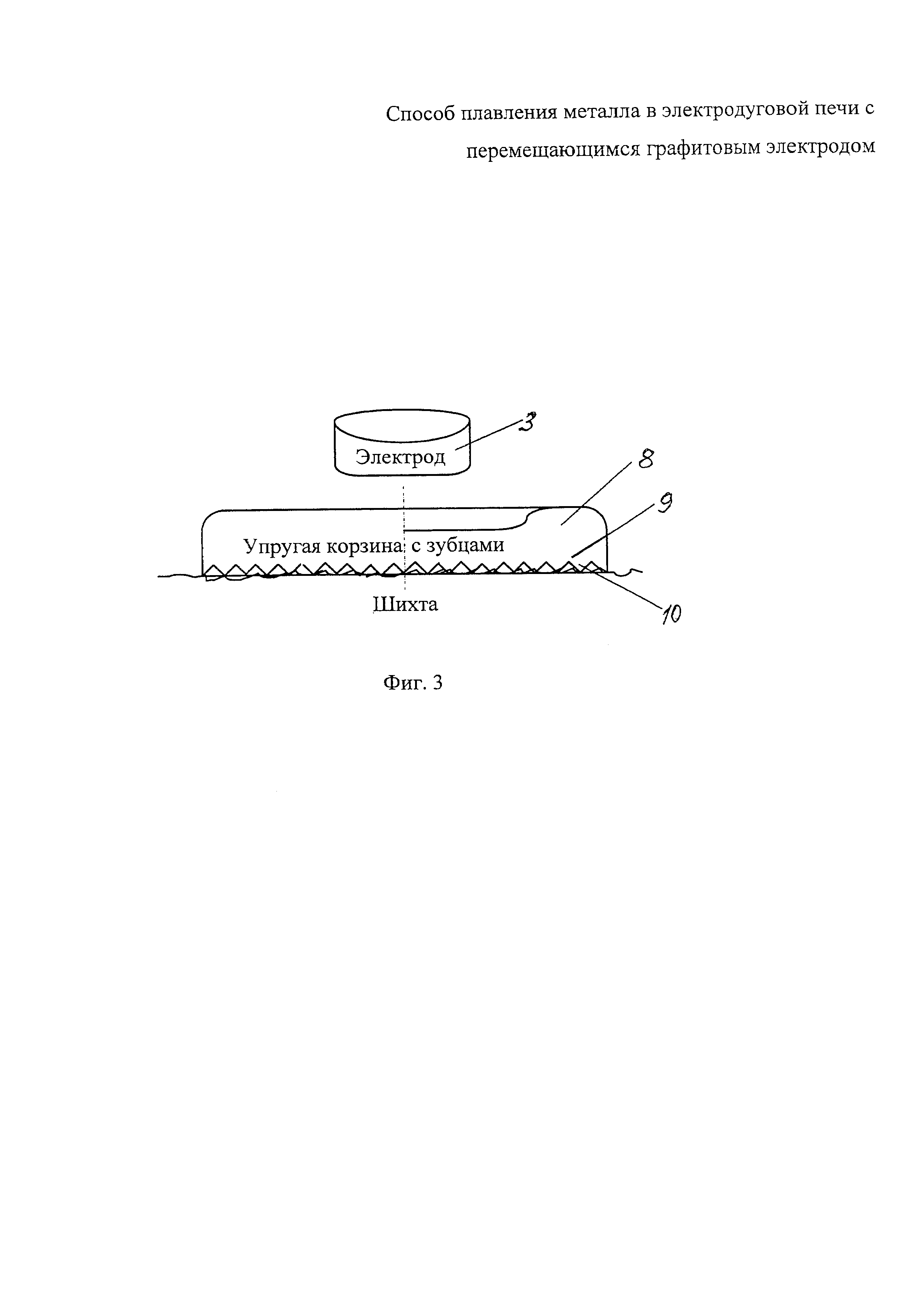 Способ относится к области электротехнологии и предназначен для управления процессом горения дуги в электрической дуговой печи с перемещающимся графитовым электродом, в частности при электродуговой плавке металлов. Наиболее близким является способ плавления металла в дуговой электрической печи, при котором в футерованный огнеупором кожух с расплавляемой шихтой опускают с помощью привода электрод, подключенный к источнику питания, зажигая дугу и осуществляя плавление шихты (см. «Электрические печи: Дуговые печи и установки спецнагрева». Учебник для вузов/А.Д. Свенчанский и др. Под ред. А.Д. Свенчанского. - 2-е изд. перераб. и доп. - М.: Энергоиздат, 1981, с. 51-70). Недостатком данного способа является то, что особенно при первом после загрузки печи зажигании дуги, которое осуществляется путем перемещения электрода вниз до соударения с шихтой и последующего подъема, часто происходит поломка электрода, вызванная его изгибом, обусловленным попаданием торца на наклонный по отношению к оси электрода твердый кусок шихты. Техническая задача, решаемая предлагаемым способом, состоит в обеспечении более «мягкого» соударения электрода с шихтой во избежание поломки электрода. Поставленная задача решается тем, что в известном способе плавления металла в электродуговой печи с перемещающимся графитовым электродом, при котором загружают шихту в футерованный огнеупором кожух и с помощью привода опускают в него графитовый электрод, подключенный к источнику питания, согласно изобретению между шихтой и торцом электрода устанавливают упругий токопроводящий элемент, опускают электрод до касания с шихтой, вызывая технологическое короткое замыкание, с помощью системы управления обеспечивают подъем электрода, вызывая формирование электрической дуги сначала между электродом и упругим элементом, а затем между электродом и шихтой. Кроме того, в предлагаемом способе плавления металла в электродуговой печи с перемещающимся графитовым электродом упругий элемент выполняют в виде корзины с профилированным под электрод дном, обращенным к торцу электрода, а краем - к шихте, при этом края корзины выполняют зубчатыми. Предлагаемый способ поясняется рисунками: на фиг. 1 приведена функциональная схема печи в разрезе; на фиг. 2 приведен вид сбоку на упругий элемент в виде упругой корзины; на фиг. 3 приведен вид сбоку на упругий элемент в виде упругой корзины, край которой выполнен зубчатым. Устройство, реализующее предлагаемый способ, содержит размещенные в футерованном корпусе 1 шихту 2 и вертикально перемещаемый электрод 3, кинематически связанный через редуктор 4 и преобразователь 5 вращательного движения в поступательное с электродвигателем 6. На поверхности шихты 2 размещен токопроводящий упругий элемент 7. Кроме того, упругий элемент может быть выполнен в виде упругой корзины 8, дно которой обращено к торцу электрода 3, а край - к шихте 2. Край корзины 9 может быть снабжен зубцами 10. Предлагаемый упругий элемент может быть реализован как в виде проволочной плетеной корзины, так и отштампованной из металлического листа, с невысоким бортиком, как показано на фиг. 2, с профилированным под электрод дном. Край упругой корзины 9 может быть снабжен зубцами 10, как это показано на фиг. 3. Способ осуществляют следующим образом. Перед началом плавки на загруженную 