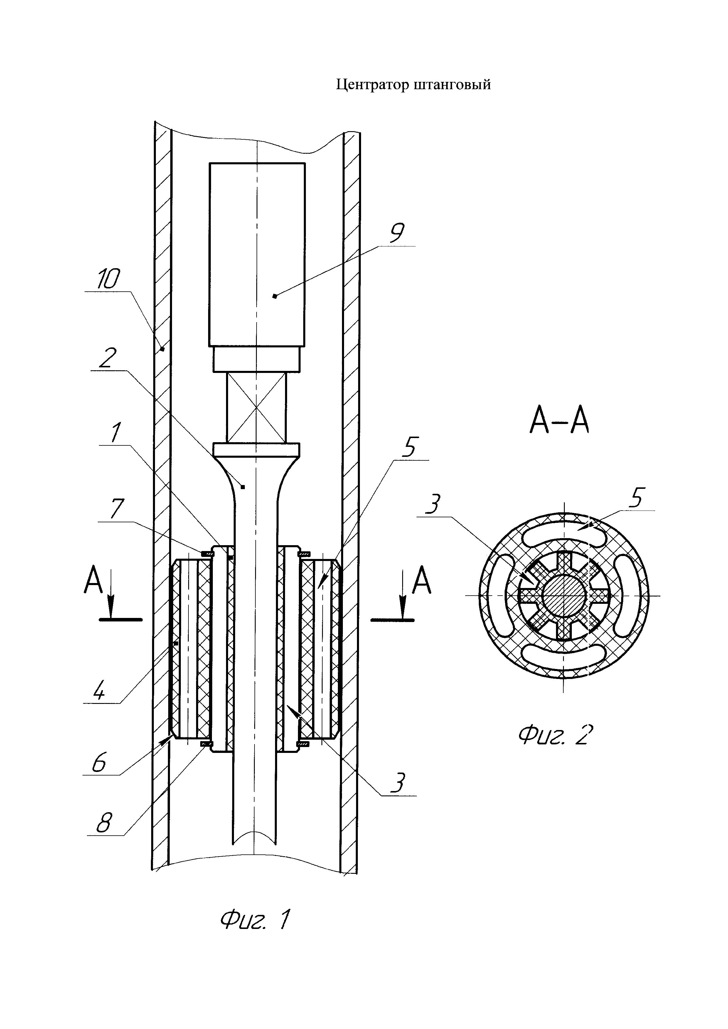 Изобретение относится к нефтедобывающей промышленности и может быть использовано для эксплуатации добывающих скважин, оборудованных установками штанговых насосов, в том числе винтовых для центрирования штанг и защиты труб. Технический результат – расширение области применения за счет возможности использования в скважинах с наклонно направленными, искривленными и горизонтальными участками и повышение надежности работы. Центратор штанговый включает неподвижную относительно штанги наплавленную по ее наружной поверхности бандажную втулку с концевыми наружными упорами и подвижный элемент в виде центратора с конусными фасками по концам. Наружный диаметр бандажной втулки выполнен не меньше диаметра муфты штанги, а на ее наружной поверхности равномерно выполнены проходные продольные или спиральные проточки. Центратор изготовлен в виде полого цилиндра с продольными проходными каналами, располагаемыми равномерно по диаметру. Центратор устанавливается на бандажную втулку с возможностью вращения и ограниченного продольного перемещения между упорами, при этом минимум один из упоров выполнен съемным. 2 ил.