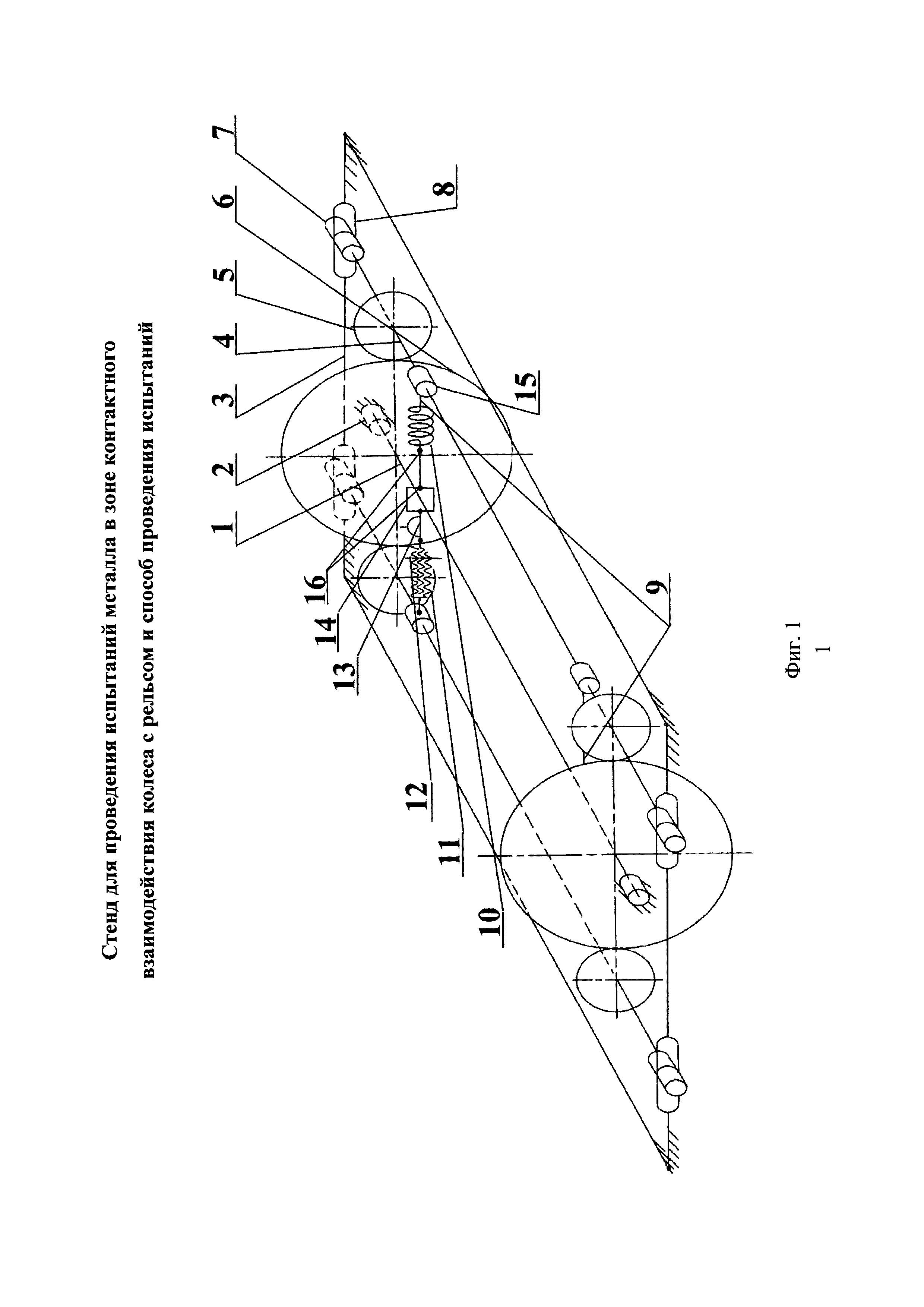 1. Стенд для испытания зоны контактного взаимодействия колеса с рельсом, содержащий устройство для установки и крепления в нем через буксовые подшипники испытываемой колесной пары, механизм, приводящий колесную пару во вращение, раму с установленным на ней катком, форма поперечного сечения профильных колес которого в зоне контакта с колесами колесной пары выполнена в форме рельса, отличающийся тем, что на раме, состоящей из одной или нескольких плоских рам, жестко закрепленных относительно испытываемой колесной пары, установлено четное количество катков, профильные колеса которых закреплены на оси каждого из катков с возможностью перемещения вдоль осей катков, причем оси каждой пары катков расположены в одной плоскости с осью испытываемой колесной пары по обе стороны от нее, катки установлены в раме посредством подшипников, наружные корпуса которых крепятся в раме через скользуны, обеспечивающие возможность перемещения катков в направлении, перпендикулярном оси испытываемой колесной пары, заданная величина контактного давления на колеса со стороны катков создается двумя одинаковыми силовыми устройствами, расположенными на равном расстоянии от плоскости симметрии испытываемой колесной пары, перпендикулярной к ее оси, причем каждое из этих силовых устройств включает в себя пружину, механизм натяжения пружины, устройство для фиксации механизма натяжения пружины в заданном положении, устройство для замера величины натяжения пружины, разъемную рамку, позволяющую обвести указанное силовое устройство вокруг оси испытываемой колесной пары, и два подшипниковых узла, посредством которых сила натяжения пружины передается на оси вращающихся катков. 2. Стенд по п. 1, отличающийся тем, что хотя бы одно из профильных колес катка может быть посажено на его ось через подшипник для исключения возможности проскальзывания профильных колес катка относительно колес испытываемой колесной пары. 3. Стенд по п. 1, отличающийся тем, что к колесам испытываемой колесной пары могут быть подведены колодочные тормоза, с целью имитации их воздействия на контактную поверхность колеса при эксплуатации. 4. Стенд по п. 1, отличающийся тем, что к одному или нескольким каткам могут быть подведены дисковые тормоза с целью имитации дополнительного проскальзывания колес испытываемой колесной пары относительно рельсов при торможении состава или при пробуксовке обмоторенной колесной пары. 5. Стенд по п. 1, отличающийся тем, что крепление испытываемой колесной пары и рамы, в которой установлены катки, может осуществляться с возможностью их взаимного поворота вокруг вертикальной оси симметрии, перпендикулярной по отношению к оси колесной пары, а управление этим поворотом может осуществляться посредством дополнительно установленного в стенде гидравлического цилиндра с контролируемым положением штока, приводимого в движение по заданной программе гидронасосной станцией с блоком управления. 6. Способ проведения испытаний металла в зоне контактного взаимодействия колеса с рельсом на стенде по п. 1, заключающийся в испытании металла в зоне контактного взаимодействия колес испытываемой колесной пары и профильных колес катков, которые имитируют собою поверхность катания рельсов, отличающийся тем, что заданную величину контактного взаимодействи