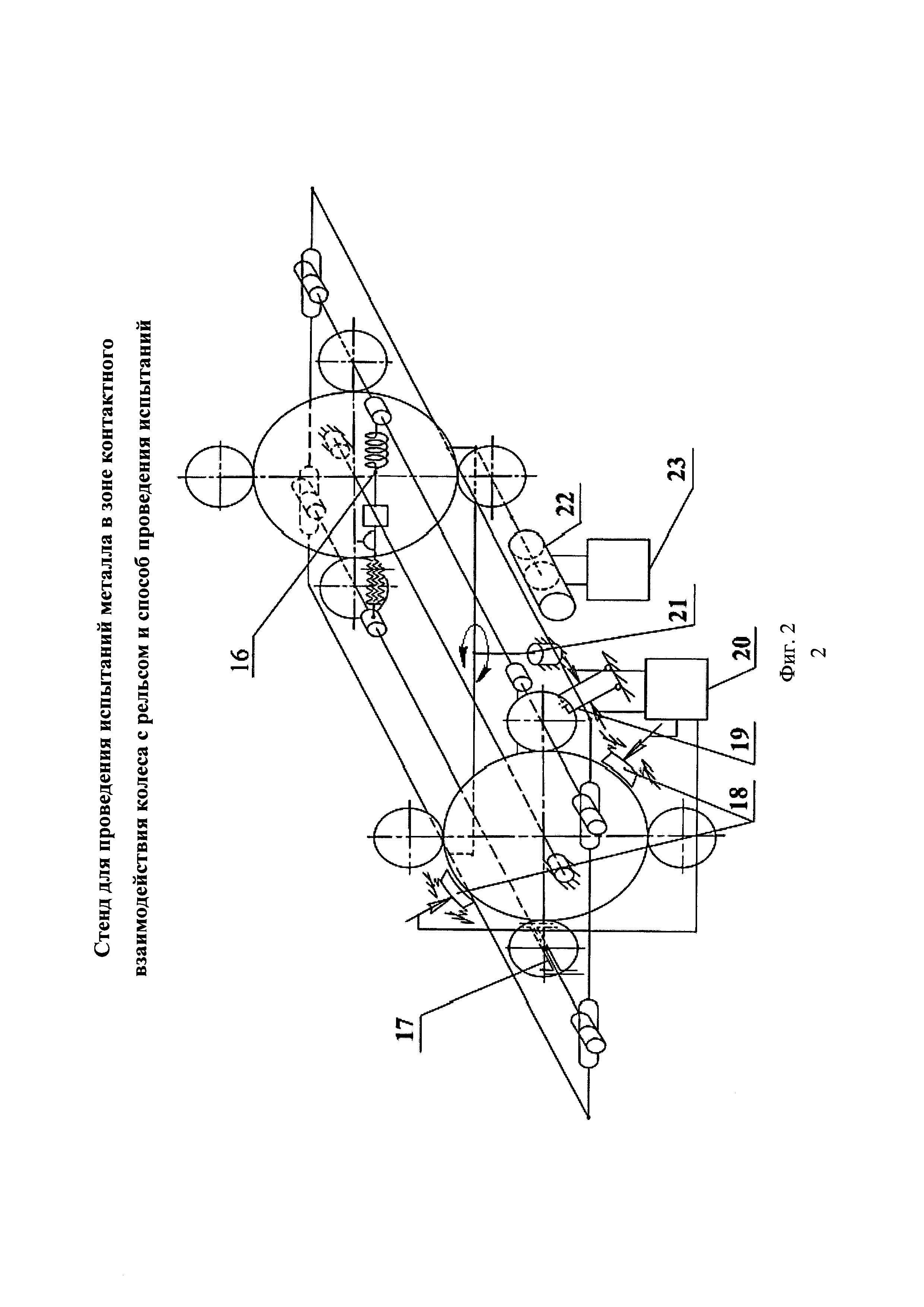 Изобретения относятся к области исследования прочностных свойств твердых материалов путем приложения к ним повторяющихся механических усилий, в частности к исследованию прочности металла в зоне контактного взаимодействия колеса с рельсом. Стенд содержит устройство для установки и крепления в нем через буксовые подшипники испытываемой колесной пары, механизм, приводящий колесную пару во вращение, раму с установленным на ней катком, форма поперечного сечения профильных колес которого в зоне контакта с колесами колесной пары выполнена в форме рельса. На раме, состоящей из одной или нескольких плоских рам, жестко закрепленных относительно испытываемой колесной пары, установлено четное количество катков, у которых форма поперечного сечения профильных колес в зоне контакта с колесами испытываемой колесной пары выполнена в форме рельса. Катки в раме стенда установлены посредством подшипников, наружные корпуса которых крепятся через скользуны, обеспечивающие возможность перемещения катков в направлении, перпендикулярном оси испытываемой колесной пары. Заданная величина контактного давления на колеса со стороны катков создается силовыми устройствами, которые включают в себя пружину, механизм натяжения пружины, устройство для фиксации механизма натяжения пружины в заданном положении, устройство для замера величины натяжения пружины, разъемную рамку, позволяющую обвести указанное силовое устройство вокруг оси испытываемой колесной пары, и два подшипниковых узла, посредством которых сила натяжения пружины передается на оси вращающихся катков. Меняя положение профильных колес на оси катков, можно задавать положение и ширину зоны, на которой будут проводиться испытания металла в зоне контактного взаимодействия колеса с рельсом, а также величину проскальзывания этой зоны относительно поверхности колеса. Способ проведения испытаний, использующий описанный стенд, заключается в испытании металла в зоне контактного взаимодействия колес испытываемой колесной пары и профильных колес катков, которые имитируют собою поверхность катания рельсов. Технический результат заключается в сокращении сроков стендовых испытаний зоны контактного взаимодействия колеса с рельсом, снижении общей массы стенда, упрощение процесса управления работой стенда. 3 н. и 10 з.п. ф-лы, 2 ил.