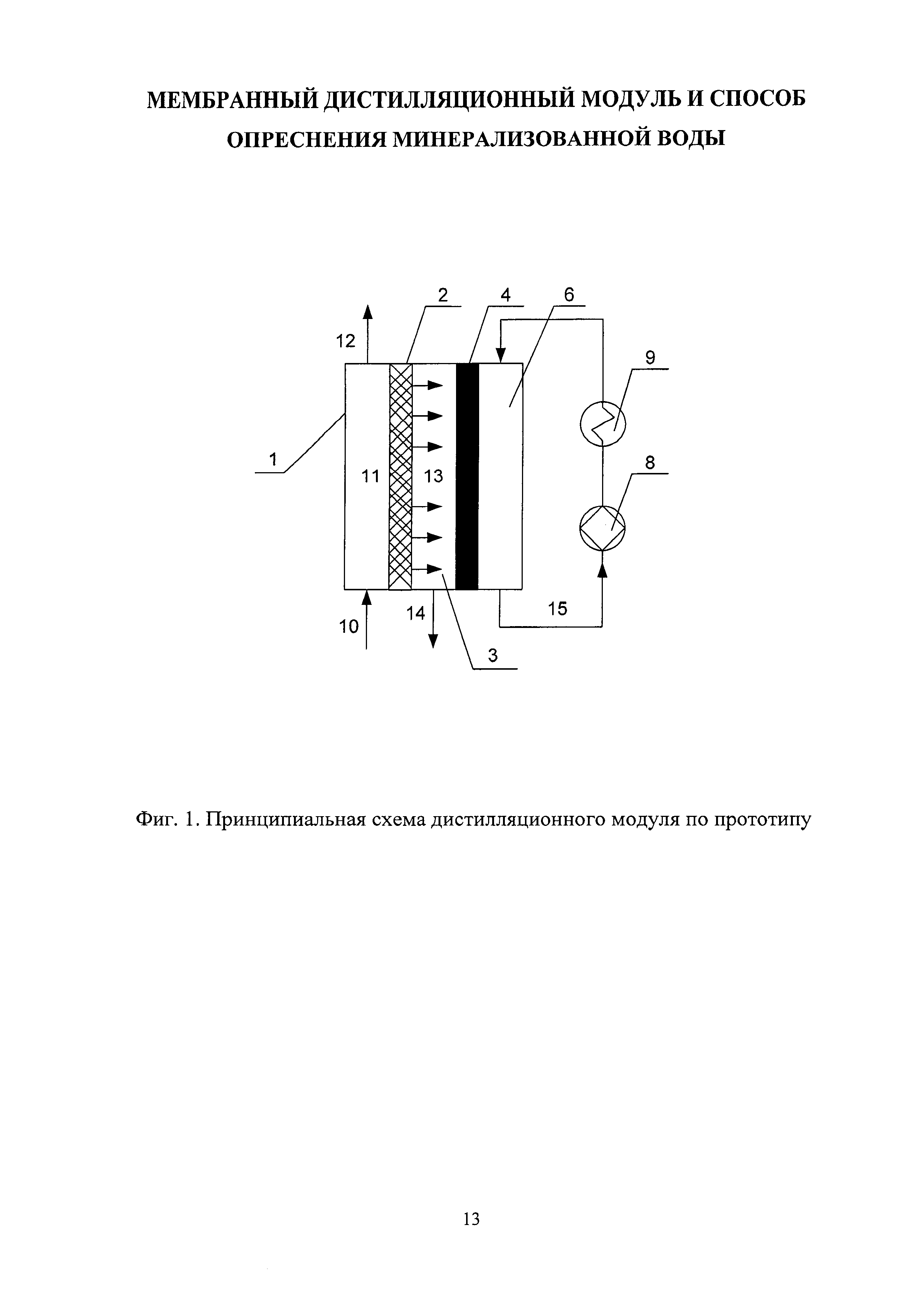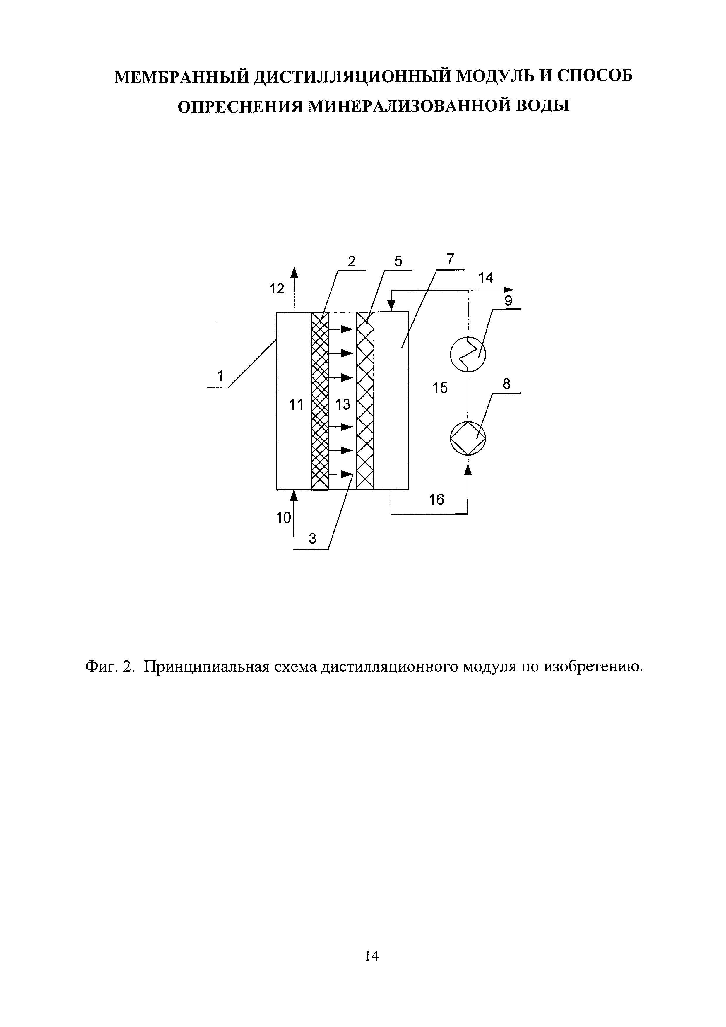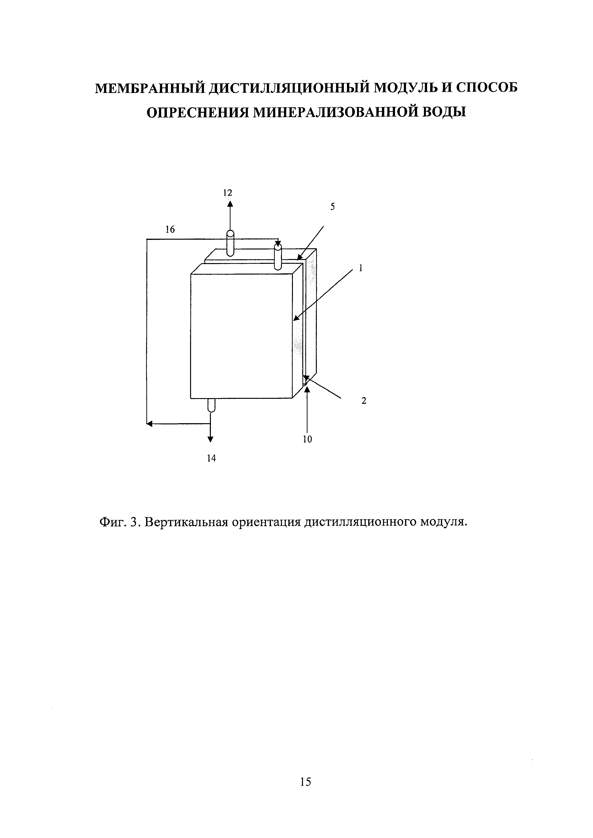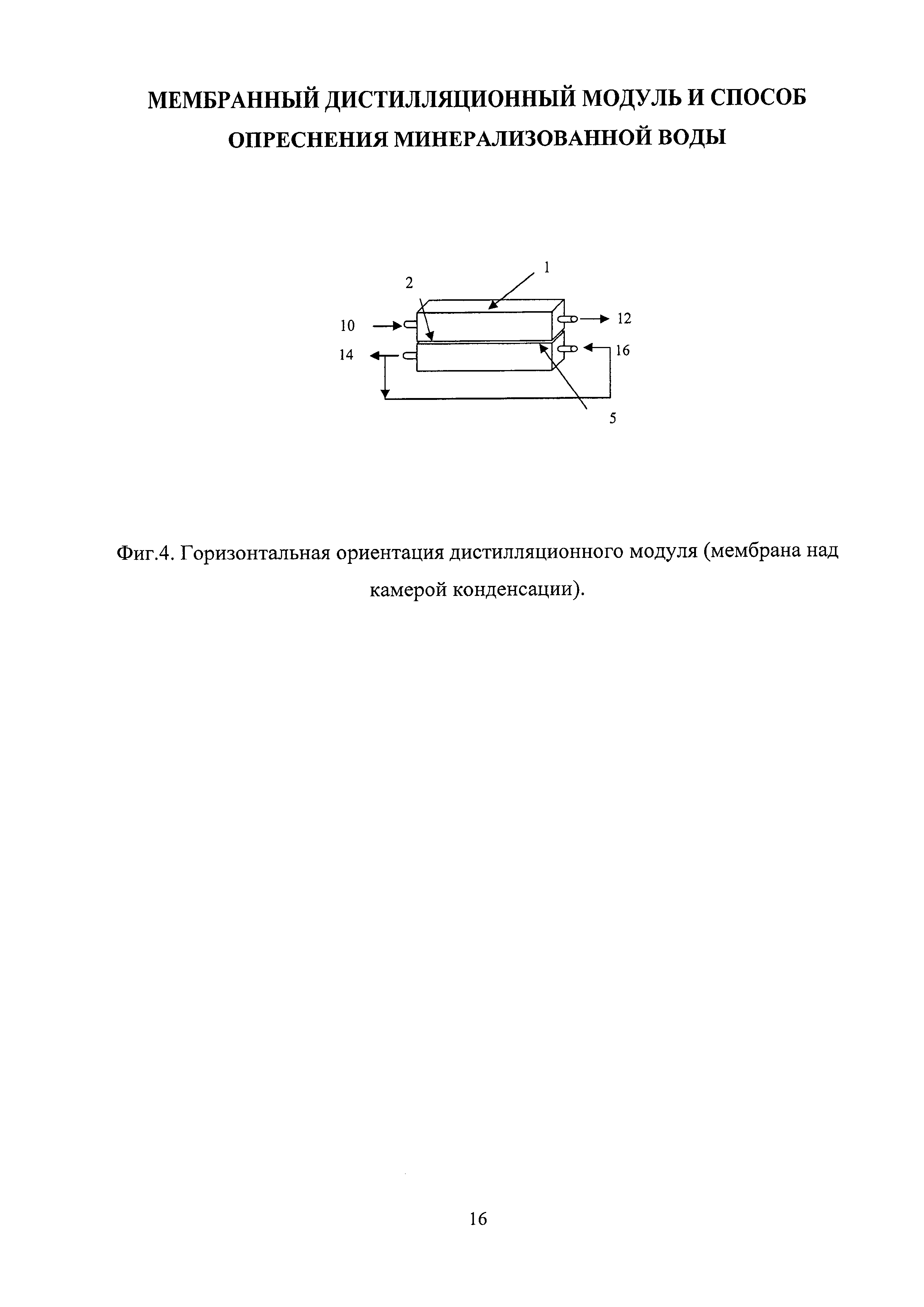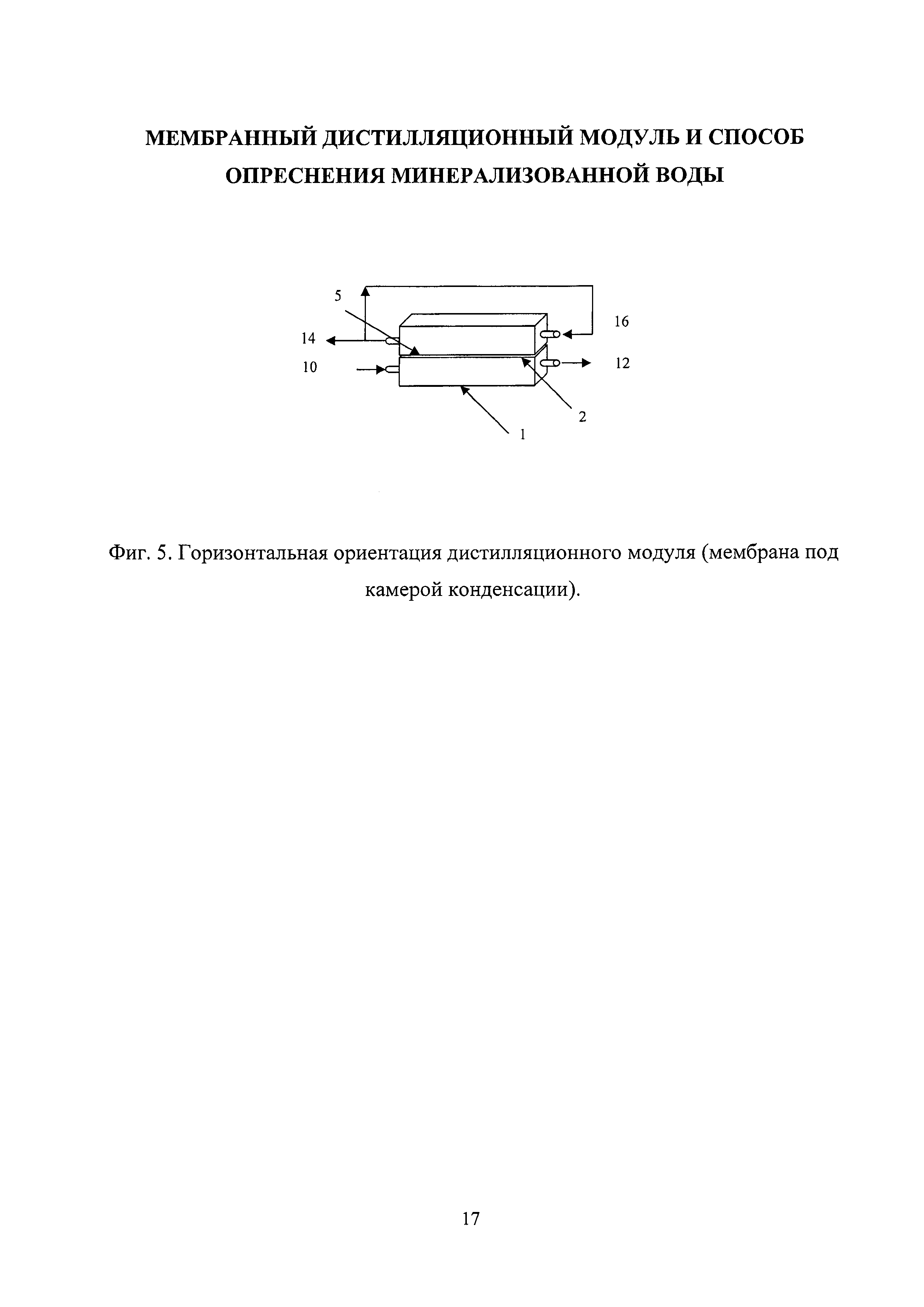 Изобретение относится к области разделения или концентрирования водных растворов различных веществ, в частности получения пресной воды из солоноватых или морских вод методом мембранной дистилляции, и может быть использовано для создания малогабаритных и малоэнергоемких опреснителей коллективного пользования, например, для маломерных морских судов. К настоящему времени мембранная дистилляция является хорошо изученным процессом разделения водных растворов. Согласно общепринятой классификации все известные конфигурации дистилляционных модулей разделяют на четыре типа: мембранный дистиллятор прямого контакта, мембранный дистиллятор со сдувкой конденсата потоком газа, вакуумный мембранный дистиллятор и мембранный дистиллятор с воздушным зазором. В последней конфигурации единичного дистилляционного модуля в подмембранном пространстве между обратной поверхностью мембраны и дополнительно устанавливаемой перегородкой образуется непродуваемый воздушный зазор. В этот зазор попадают прошедшие через мембрану пары, которые конденсируются при контакте с охлаждаемой поверхностью этой перегородки, являющейся конструктивным элементом модуля. Каждая из конфигураций дистилляционных модулей имеет свои достоинства и недостатки, но главным является общее требование к основному рабочему органу таких аппаратов - применяемые мембраны должны быть гидрофобными и обладать высокой пористостью. Мембранные дистилляционные аппараты производительностью 5-20 кг/ч пресной воды могут быть использованы для оснащения маломерных судов или групп потребителей на изолированных островах морской акватории. Такие аппараты могут быть компактными, малоэнергоемкими, с применением в качестве источников энергии, в том числе солнечной, или рекуперированных тепловых потоков от энергетических установок, обеспечивающих движение судов. Для этих целей дистилляционные аппараты должны сохранять устойчивую работоспособность в условиях эксплуатации (например, при сильном волнении морской поверхности в штормовую погоду). Наибольший интерес для этих целей представляют дистилляционные модули с воздушным зазором (камерой), где прошедшие через мембрану пары конденсируются на специально установленной в модуле на некотором расстоянии от мембраны охлаждаемой перегородке. Подобное устройство мембранного дистилляционного модуля обеспечивает существенное снижение теплопотерь. Аппараты с воздушным зазором позволяют оптимально комбинировать направление всех потоков для оптимизации расхода тепла. Например, трубопровод с исходным холодным потоком проходит через воздушный зазор, где предварительно подогревается конденсируемым паром (скрытая теплота испарения), а это, в свою очередь, позволяет охладить продукт - пресную воду. Но у всех этих конструкций есть общий недостаток - сток и сбор конденсата, образующегося в воздушном зазоре, осуществляются за счет силы земного тяготения. Это определяет необходимость вертикального расположения мембран, охлаждающих перегородок и т.д., что приводит к увеличению габаритов модулей, поскольку охлаждаемая пластина должна отстоять от поверхности мембраны на расстояние более 1 мм, чтобы исключить образование сплошного слоя конденсата, который препятствует переносу паров и тем самым снижает производительн