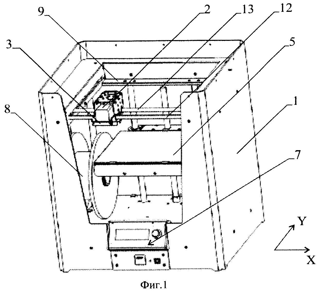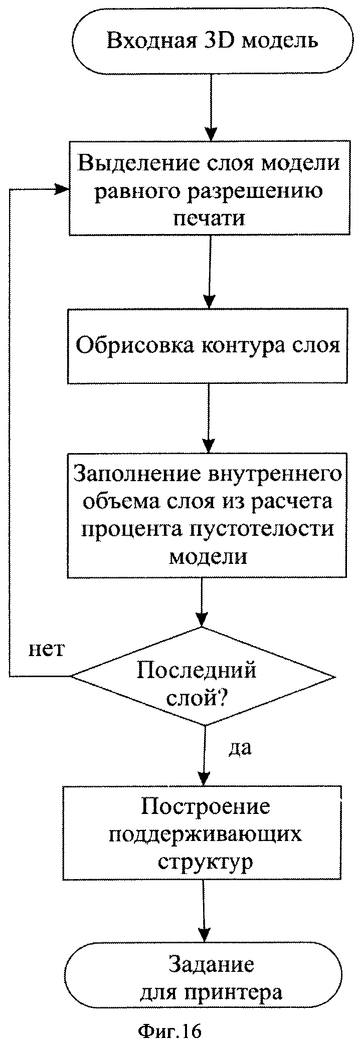 Область техники, к которой относится изобретение. Изобретение относится к технологии изготовления трехмерного (объемного) изделия (физического объекта, или макета, или модели) по цифровой 3D-модели методами быстрого прототипирования, которое может быть реализовано экструзионным осаждением последовательности слоев в сечении изделия. Экструзионные 3D-принтеры могут быть использованы в различных областях человеческой деятельности, например, при производстве и освоении новой продукции - для быстрого изготовления прототипов моделей, в т.ч корпусов экспериментальной техники - автомобилей, телефонов, радиоэлектронного оборудования; в промышленности, например, для быстрого производства (преимущественно, единичного или мелкосерийного) готовых деталей из материалов, поддерживаемых 3D-принтерами, например, моделей и форм для литейного производства, тары и упаковки, и т.д.; в медицине, например, при протезировании и производстве имплантатов, а также при производстве различных изделий в домашних условиях, и др. Уровень техники. 3D-печать может осуществляться разными способами и с использованием различных материалов, в основе которых лежит принцип послойного создания (выращивания) твердого объекта, в частности, с использованием технологии FDM (Fused Deposition Modeling) - послойной печати расплавленной полимерной нитью (или метода послойного наплавления или моделирования методом наплавления), в результате которой объект формируется путем послойной укладки на поверхность рабочего стола (рабочую поверхность) слоя, формируемого расплавленной нитью из плавкого строительного материала (расходного или моделирующего материала), например, пластика, с пошаговым перемещением рабочего стола вниз на высоту сформированного слоя. Технология FDM печати заключается в следующем: печатающая головка (или экструдер) с контролируемой температурой разогревает до текучего состояния нить из плавкого материала, и с высокой точностью подает расплавленный материал тонкими слоями на рабочую поверхность 3D принтера. Слои наносятся друг на друга, соединяются между собой и отвердевают, постепенно формируя готовое изделие. Печатающая головка выдавливает жидкий материал слой за слоем, перемещаясь свободно как в плоскости слоя, так и по вертикали. Для позиционирования печатающей головки используют декартовую систему координат, согласно которой в конструкции принтера печатающая головка, либо рабочий стол, на котором формируются изделие, перемещаются вдоль трех взаимно-перпендикулярных направляющих. Технология была изобретена в конце 80-х годов Скоттом Крампом (компания Stratasys). В частности, из патентов US 5121329, US 5340433, US 5738817, US 5764521, US 6022207 компании Стратасис (Stratasys, Inc), известна технология построения 3D-объекта по модели для автоматизированного проектирования (CAD) методом «слой за слоем» путем экструзионного осаждения текучего строительного материала (моделирующего материала). При этом строительный материал подается через наконечник (сопло) печатающей (экструзионной) головки и осаждается в виде последовательности дорожек на подложке в XY-плоскости. Затем печатающая головка поднимается относительно подложки по оси Z (перпендикулярной XY-плоскости) на один шаг, и процесс повторяется для формирования 3D-объекта, подобного CAD-модели. Строительный материал обычно загружаетс