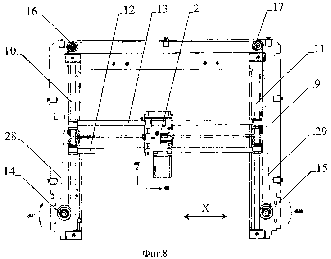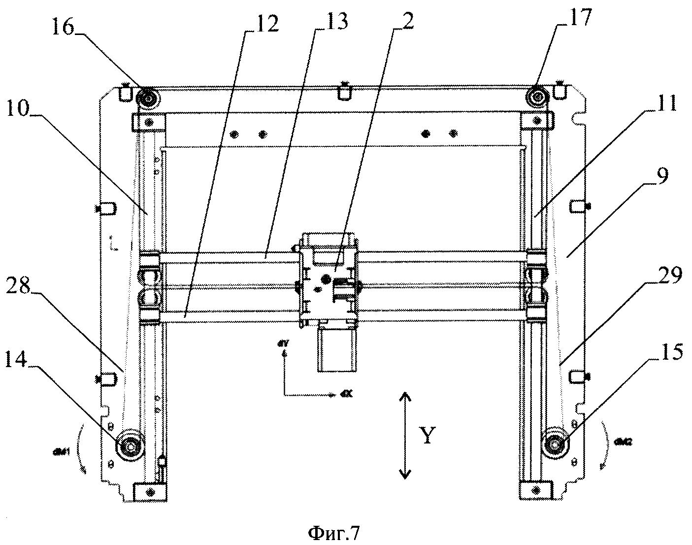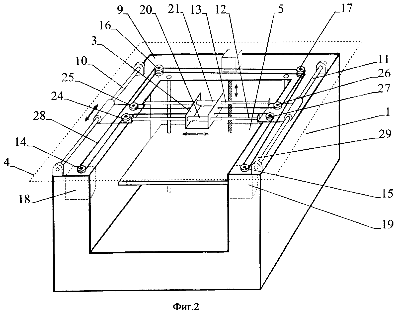 1. Устройство перемещения печатающей головки 3D-принтера в плоскости XY, характеризующееся тем, что оно включает две продольные и, по крайней мере, одну поперечную направляющие для перемещения печатающей головки в плоскости XY, где продольные направляющие расположены по оси Y и жестко закреплены на основании, а поперечная направляющая расположена по оси X между двумя продольными направляющими с возможностью перемещения по ним; каретку, на которой закреплена печатающая головка, выполненную с возможностью перемещения по поперечной направляющей; два приводных ремня, концы которых закреплены на каретке с образованием двух связанных между собой контуров, предназначенных для перемещения каретки с печатающей головкой в плоскости XY посредством двух ведущих шкивов, соединенных с их приводами с возможностью независимого вращения шкивов в одном или противоположном направлениях, один из которых передает тяговое усилие на первый приводной ремень, а второй - на второй приводной ремень, при этом один из контуров образован P-образным расположением первого ремня, а второй контур образован вторым ремнем, расположенным симметрично относительно расположения первого ремня с осью симметрии, расположенной параллельно продольным направляющим и на равноудаленном расстоянии от них, при этом рабочие части ремней двух контуров, проходящие вдоль поперечной направляющей, расположены в одной плоскости XY. 2. Устройство по п.1, характеризующееся тем, что однонаправленное вращение шкивов обеспечивает перемещение каретки с печатающей головкой по оси X, противонаправленное по оси Y, вращение одного из шкивов обеспечивает перемещение каретки с печатающей головкой в диагональном направлении. 3. Устройство по п.1, характеризующееся тем, что для перемещения поперечной направляющей по продольным направляющим концы поперечной направляющей закреплены на продольных направляющих через подвижные соединительные узлы, при этом каждый из подвижных соединительных узлов снабжен парой роликов, расположенных по оси Y в плоскости размещения рабочей части ремней, через которые проходят ремни первого и второго контуров. 4. Устройство по п.1, характеризующееся тем, что оно содержит датчики нулевой координаты по оси X и оси Y, задающие начальное положение печатающей головки в плоскости XY, при этом датчик нулевой координаты по оси X закреплен на каретке с печатающей головкой, а датчик нулевой координаты по оси Y закреплен на конце одной из продольных направляющих со стороны размещения шкива. 5. Устройство по п.1, характеризующееся тем, что перемещение печатающей головки в плоскости XY осуществляется по алгоритму, определяемому из соотношений: 6. Устройство по п.3, характеризующееся тем, что оно содержит два узла из опорных роликов, служащих в качестве направляющих для приводных ремней связанных контуров, при этом узлы закреплены на основании с противоположных от ведущих шкивов сторон продольных направляющих, а узел из опорных роликов образован двумя роликами, расположенными один над другим на одной вертикальной оси, при этом верхние ролики узлов являются направляющими для приводного ремня одного контура, нижние - другого. 7. Устройство по п.6, характеризующееся тем, что в первом контуре, образованном P-образным расположением первого ремня, один конец ремня закреплен на 