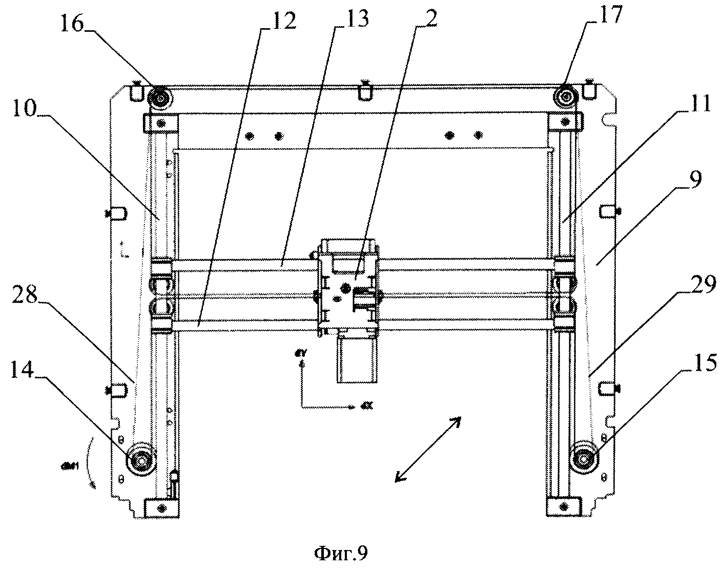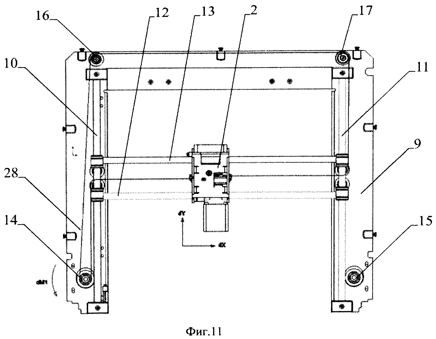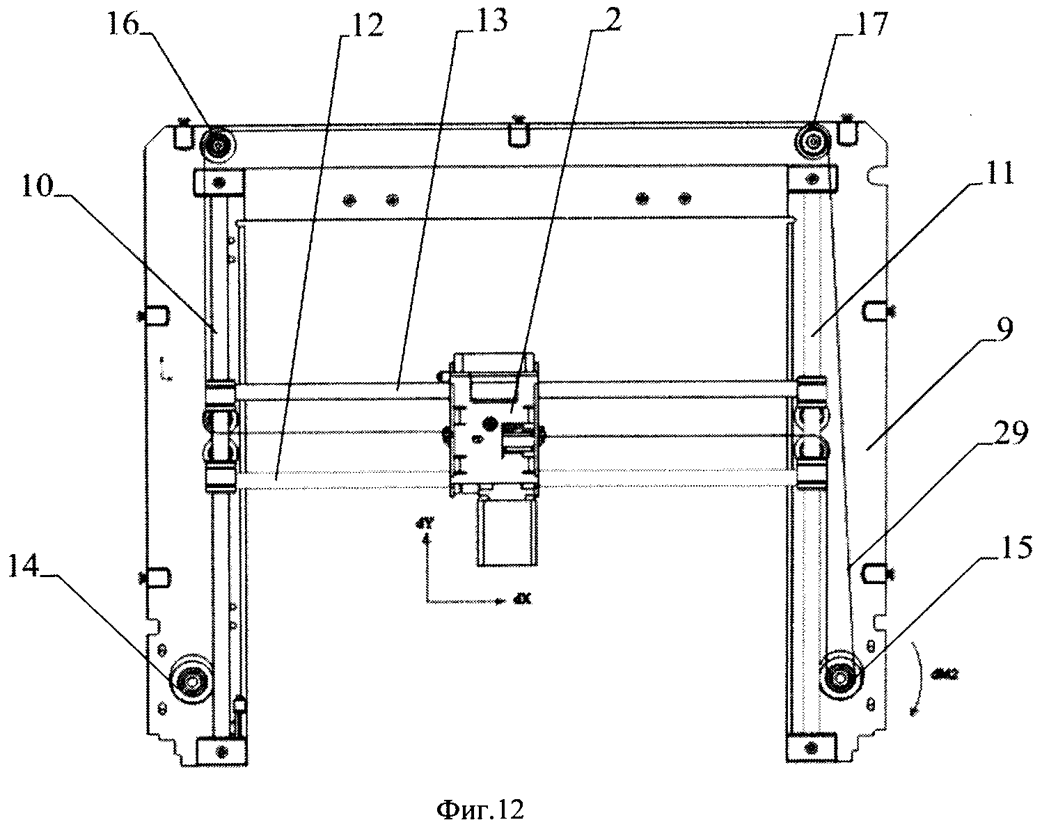 Изобретение относится к технологии изготовления объемного изделия по цифровой 3D-модели методом послойной печати расплавленной полимерной нитью (FDM). Заявляемое устройство перемещения печатающей головки 3D-принтера в плоскости XY включает две продольные и, по крайней мере, одну поперечную направляющие для перемещения печатающей головки в плоскости XY, где продольные направляющие расположены по оси Y и жестко закреплены на основании, а поперечная направляющая расположена по оси X между двумя продольными направляющими с возможностью перемещения по ним; каретку, на которой закреплена печатающая головка, выполненную с возможностью перемещения по поперечной направляющей; два приводных ремня, концы которых закреплены на каретке с образованием двух связанных между собой контуров, предназначенных для перемещения каретки с печатающей головкой в плоскости XY посредством двух ведущих шкивов, соединенных с их приводами с возможностью независимого вращения шкивов в одном или противоположном направлениях, один из которых передает тяговое усилие на первый приводной ремень, а второй - на второй приводной ремень, при этом один из контуров образован P-образным расположением первого ремня, а второй контур образован вторым ремнем, расположенным симметрично относительно расположения первого ремня с осью симметрии, расположенной параллельно продольным направляющим и на равноудаленном расстоянии от них, при этом рабочие части ремней двух контуров, проходящие вдоль поперечной направляющей, расположены в одной плоскости XY. 2 н. и 12 з.п. ф-лы, 1 табл., 16 ил.