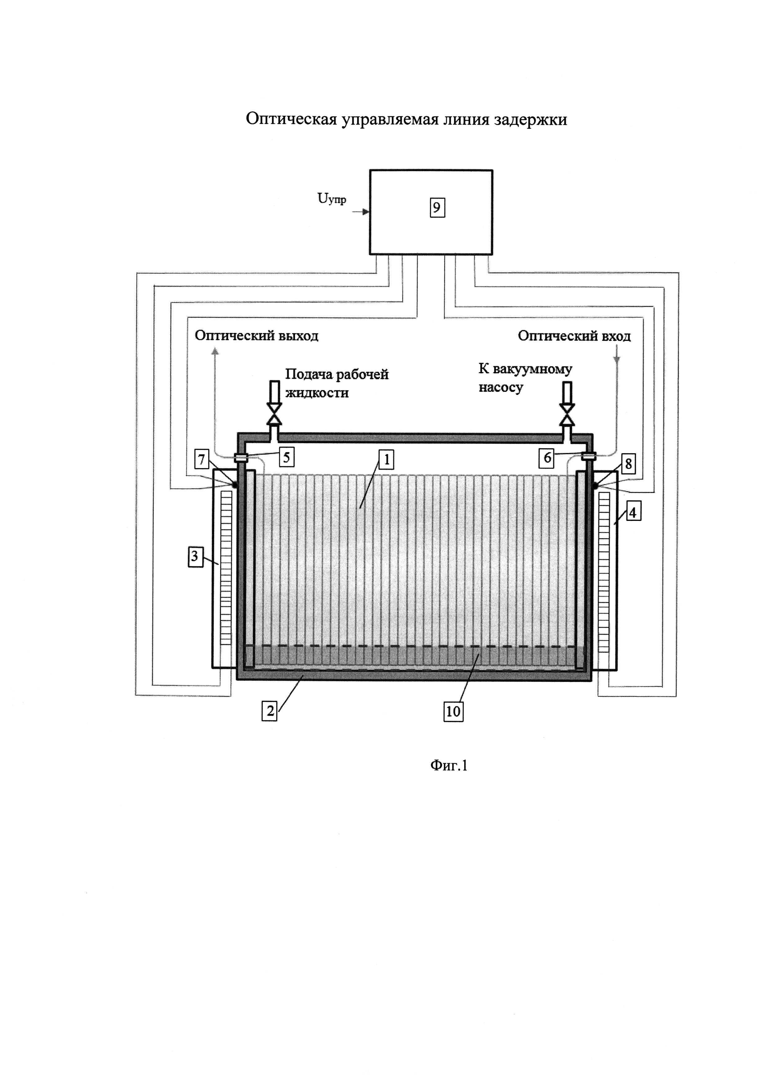 Изобретение относится к устройствам волоконно-оптической связи и может быть использовано, в частности, в устройствах компенсации вариаций временной задержки информационных сигналов, переданных на конец многокилометровой волоконно-оптической линии. Заявленная оптическая управляемая линия задержки выполнена в виде намотанного на катушку световода из оптического волокна, изменением температуры которого осуществляется регулирование времени распространения в нем оптического сигнала, катушка при этом размещена внутри герметичной тепловой трубы с рабочей жидкостью. Световод одновременно является фитилем тепловой трубы. Для управления температурой катушки оптического волокна используется электронная система терморегулирования с нагревательными элементами в виде плат Пельтье. Технический результат – увеличение быстродействия волоконно-оптической управляемой линии задержки. 7 з.п. ф-лы, 1 ил.