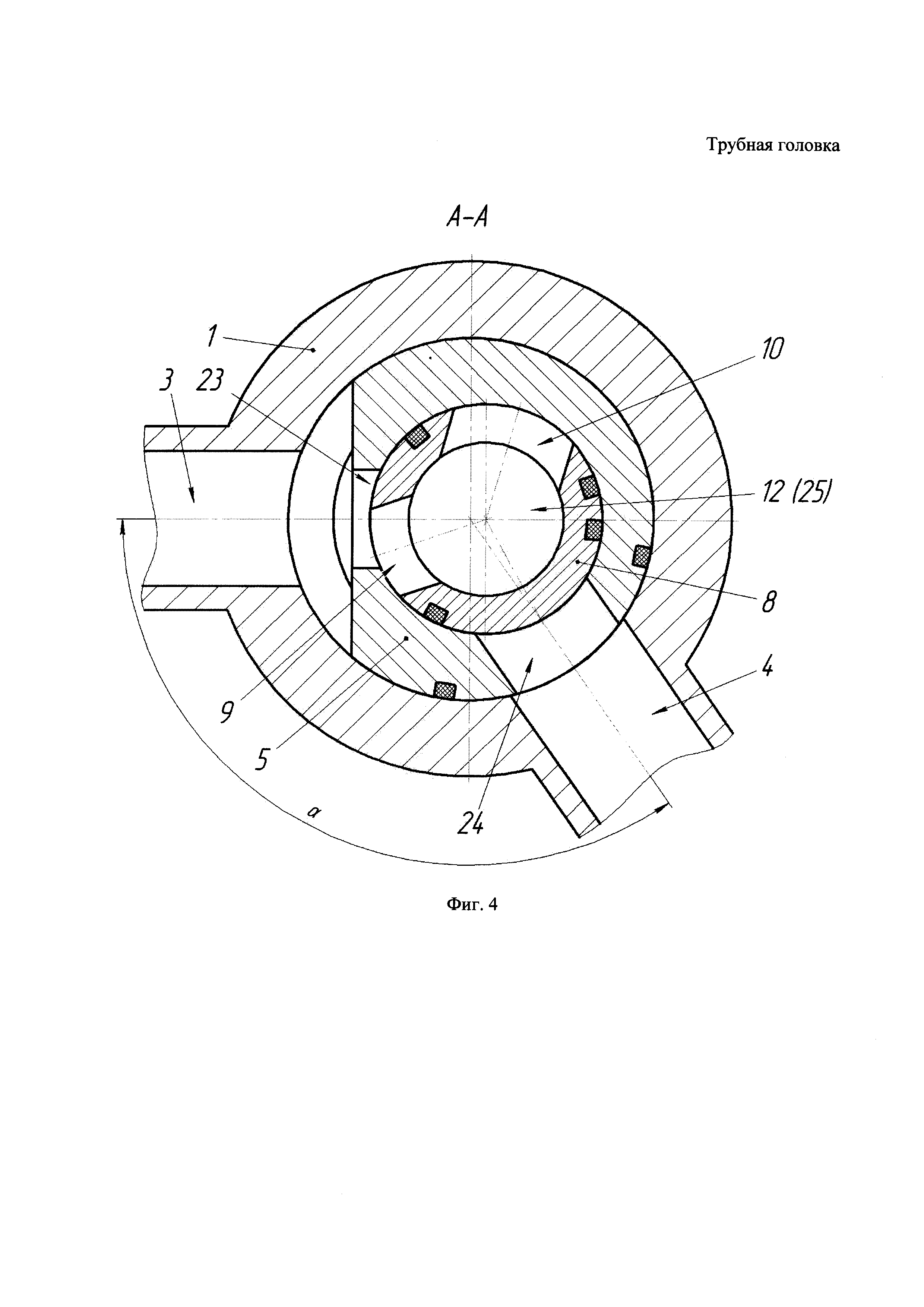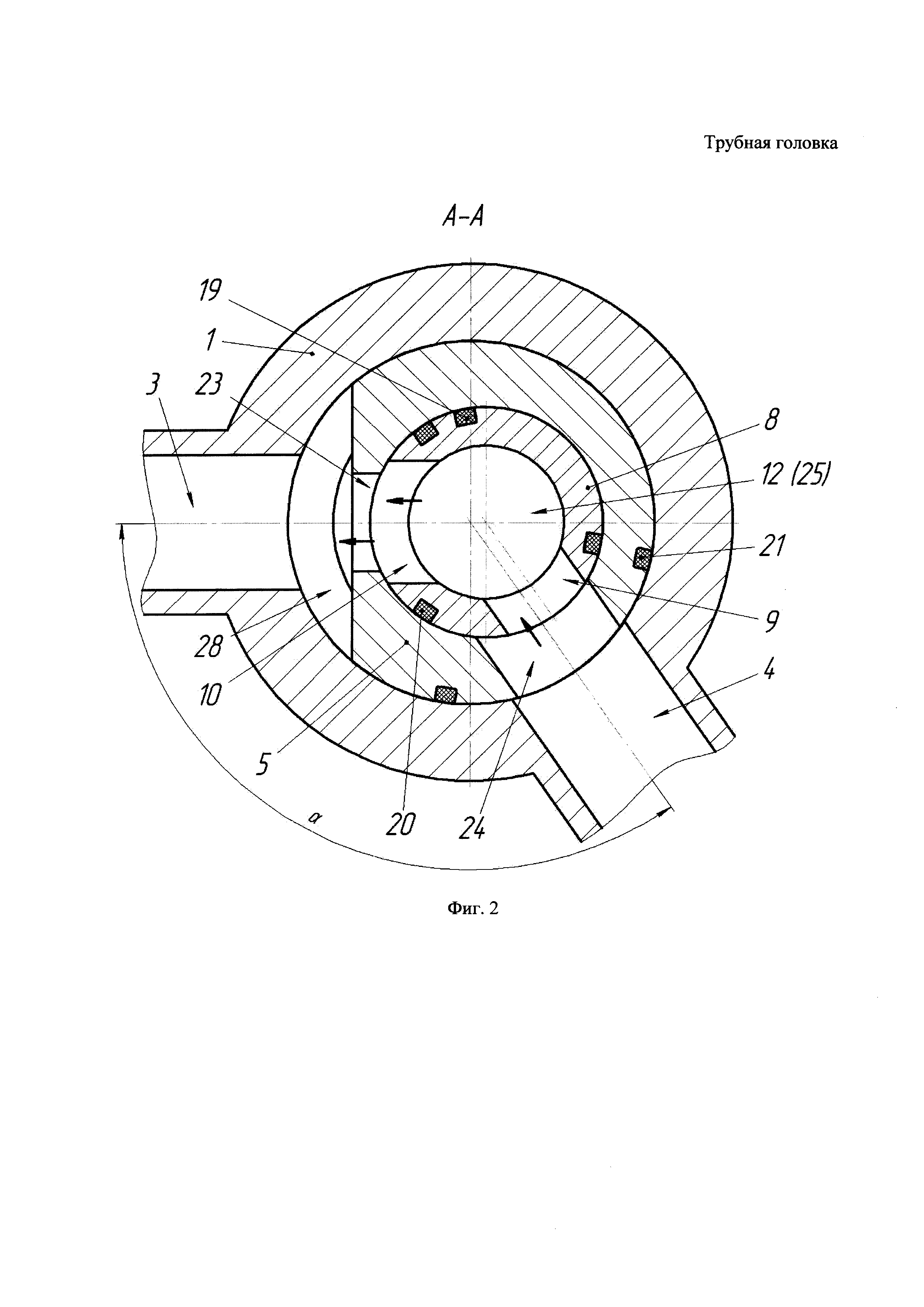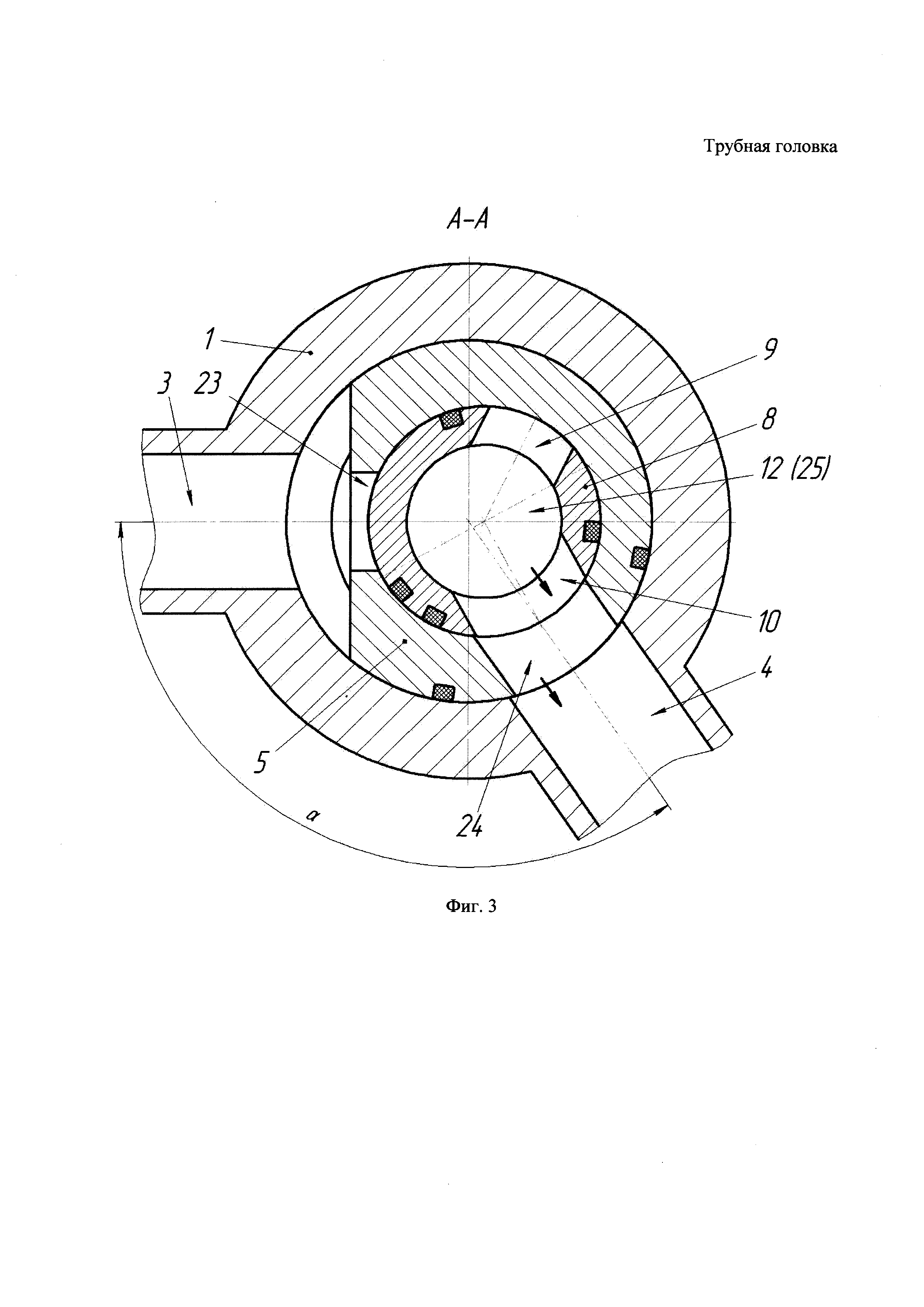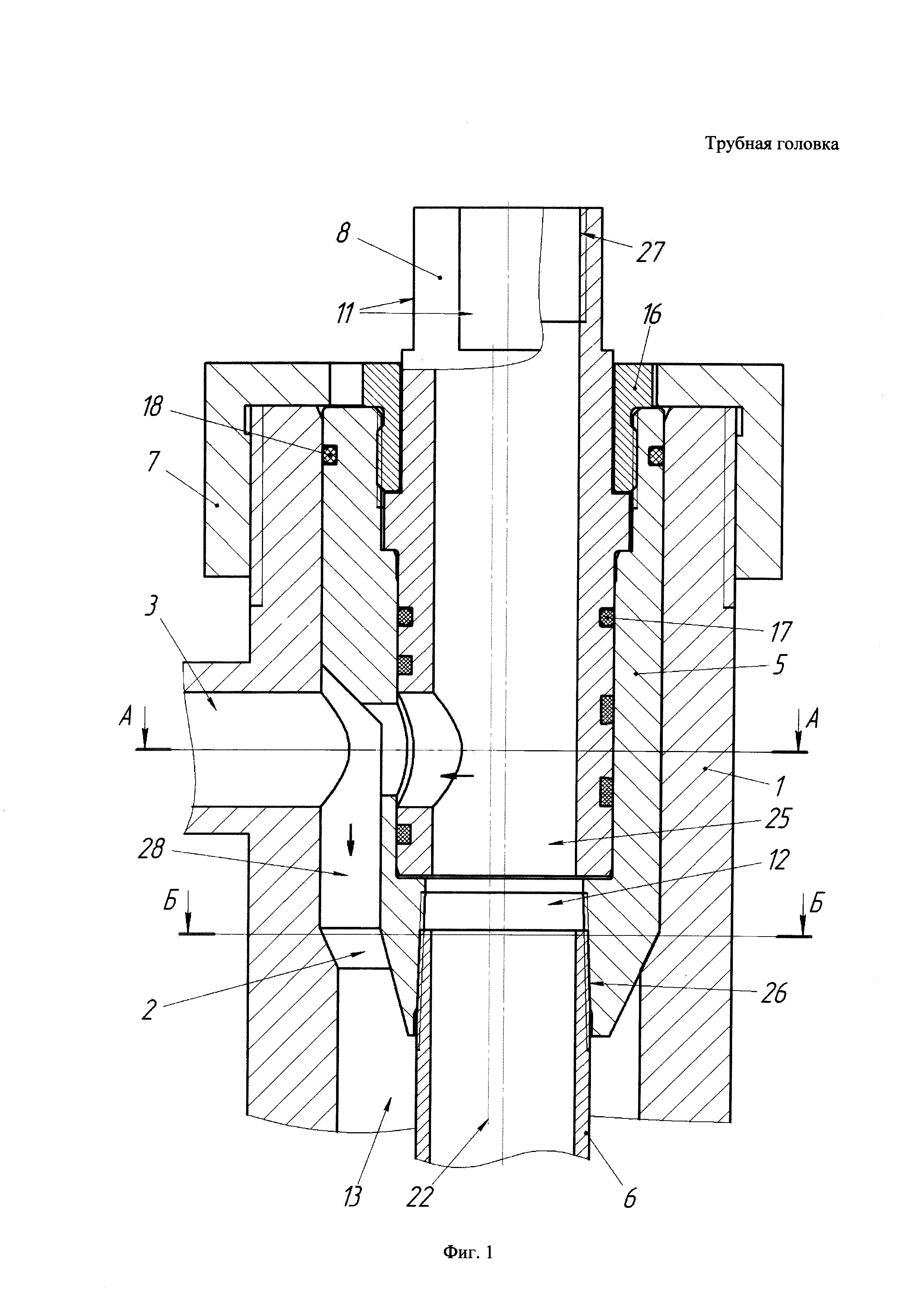 Трубная головка, включающая корпус со ступенчатым осевым каналом, боковыми исследовательским каналом и линией сбора, трубодержатель, установленный в осевом канале корпуса, для подвески лифтовой колонны, крышку, втулку с радиальными каналами, узел поворота, причем трубодержатель и втулка установлены в корпусе так, что линия сбора корпуса при определенном повороте втулки выполнена с возможностью сообщения через радиальные каналы втулки с продольным каналом трубодержателя, а исследовательский канал корпуса выполнен с возможностью сообщения со скважинным пространством снаружи трубодержателя, причем снизу трубодержателя выполнены выступы или пазы, взаимодействующие с соответствующими внутренними пазами или выступами корпуса для исключения поворота, отличающаяся тем, что втулка установлена в продольный канал трубодержателя с возможностью поворота при помощи узла поворота, расположенного сверху втулки и выше крышки, а исследовательский канал и линия сбора размещены на одном уровне перпендикулярно оси корпуса под углом по его периметру, позволяющим обеспечить сообщение с каналами трубодержателя так, чтобы при повороте втулки каналы последовательно и поочередно или вместе открывались и герметично закрывались для сообщения с продольным каналом втулки.