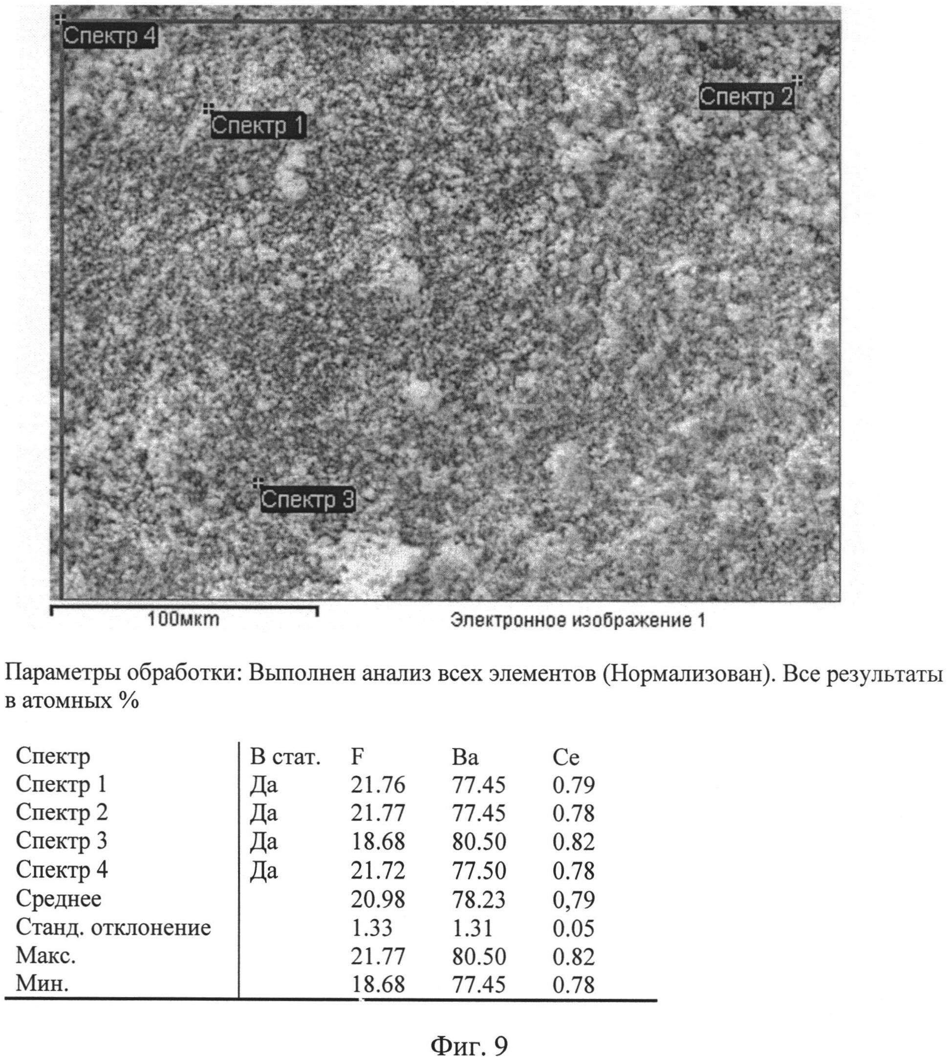 Изобретение может быть использовано в производстве сцинтилляционной керамики с повышенным световыходом. Способ получения порошка фторида бария, активированного фторидом церия, включает взаимодействие раствора фторида аммония с раствором, содержащим нитрат бария и нитрат церия. Для взаимодействия используют раствор, содержащий ионы бария и церия при их мольном соотношении от 99,999:0,001 до 99,990:0,010, соответственно. Затем осадок отделяют, промывают, сушат и подвергают термической обработке при температуре 550-600°С. Отмытый осадок повторно обрабатывают фтористоводородной кислотой высокой чистоты. Изобретение позволяет получить тонкодисперсный безводный порошок фторида бария, активированного фторидом церия, с однородным химическим и фазовым составом и низким содержанием активатора, кислородных и углеродных примесей. 2 з.п. ф-лы, 9 ил., 2 табл., 5 пр.
