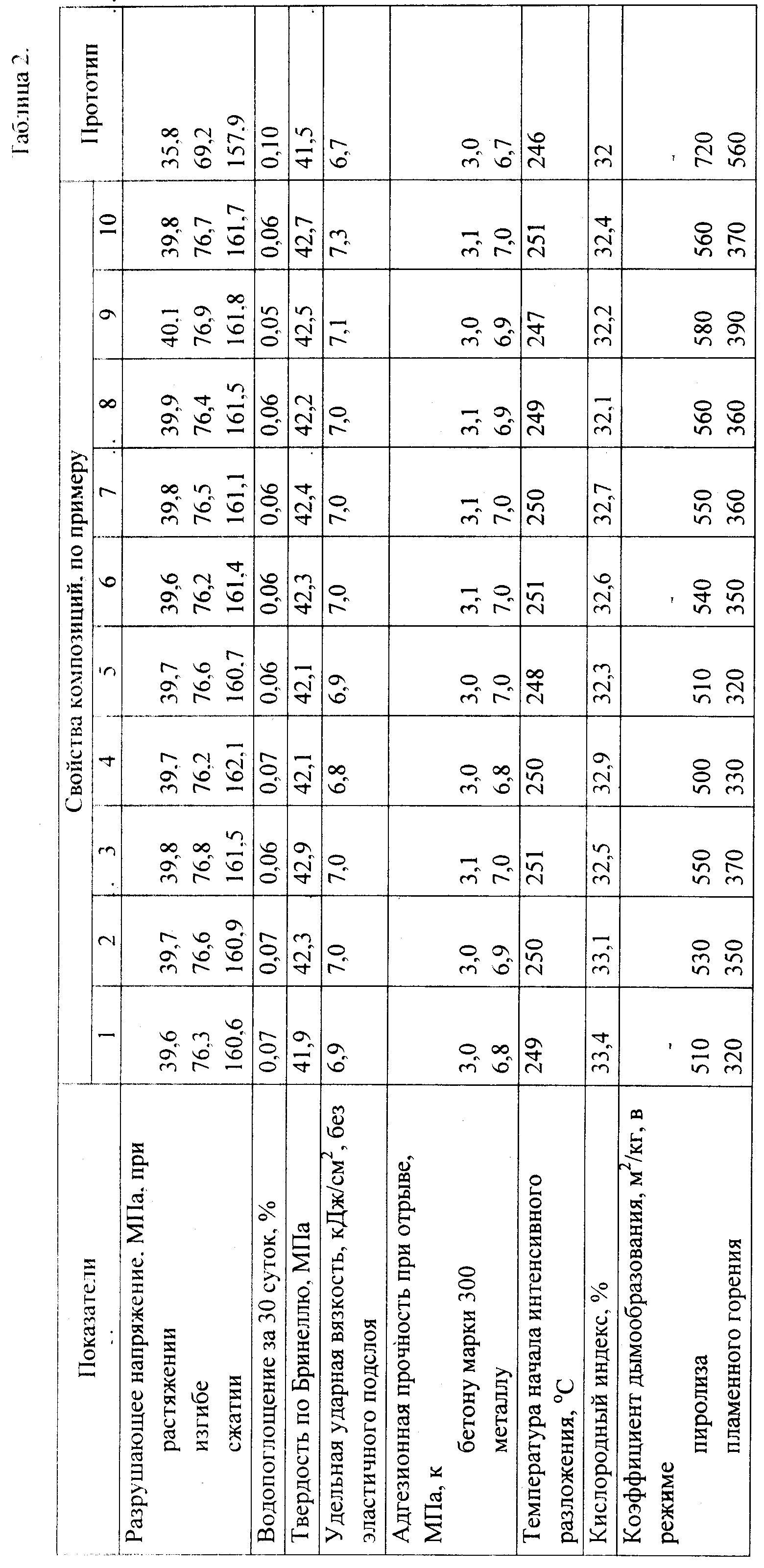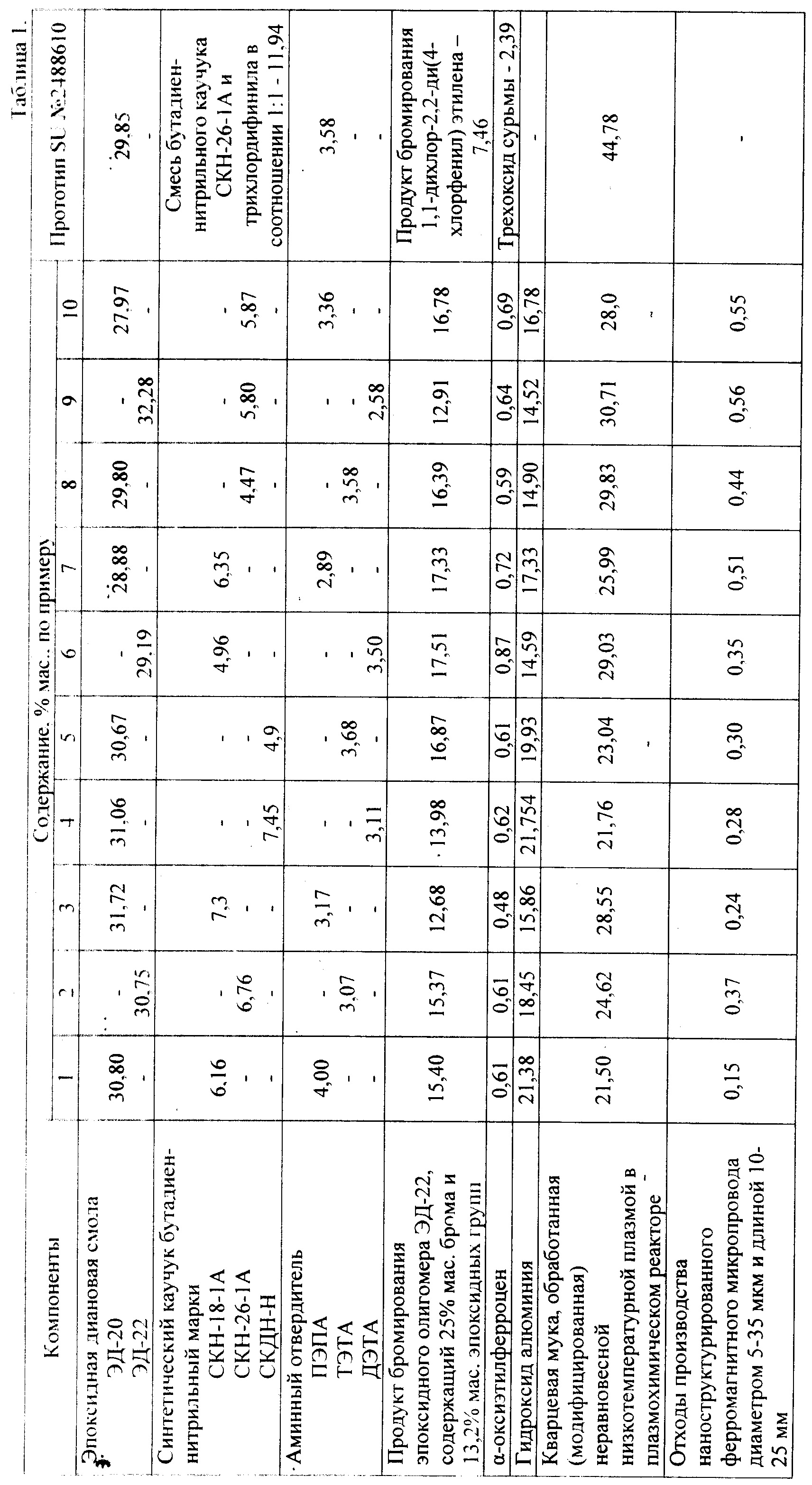 Изобретение относится к промышленности строительных материалов, а именно к получению химически стойких, слабогорючих (Г1) эпоксидно-каучуковых композиций, которые могут быть использованы для восстановления, ремонта и усиления бетонных и железобетонных конструкций. Композиция содержит, мас.%: 27,97-32,28 - эпоксидной диановой смолы, 2,58-4,00 - аминного отвердителя, 4,47-7,45 - бутадиен-нитрильного каучука, 14,52-21,74 - гидроксида алюминия, 21,50-30,71 - кварцевой муки, обработанной низкотемпературной неравновесной плазмой в плазмохимическом реакторе, 0,48-0,87 - α-оксиэтилферроцена, 12,68-17,51 - продукта бромирования эпоксидной смолы ЭД-22, содержащего 25 мас.% брома и 13,2 мас.% эпоксидных групп, и 0,15-0,56 - отходов производства наноструктурированного ферромагнитного микропровода диаметром 5-35 мкм и длиной 10-25 мм. Изобретение позволяет повысить прочность при изгибе и растяжении химически стойких слабогорючих эпоксидно-каучуковых композиций. 2 табл., 10 пр.