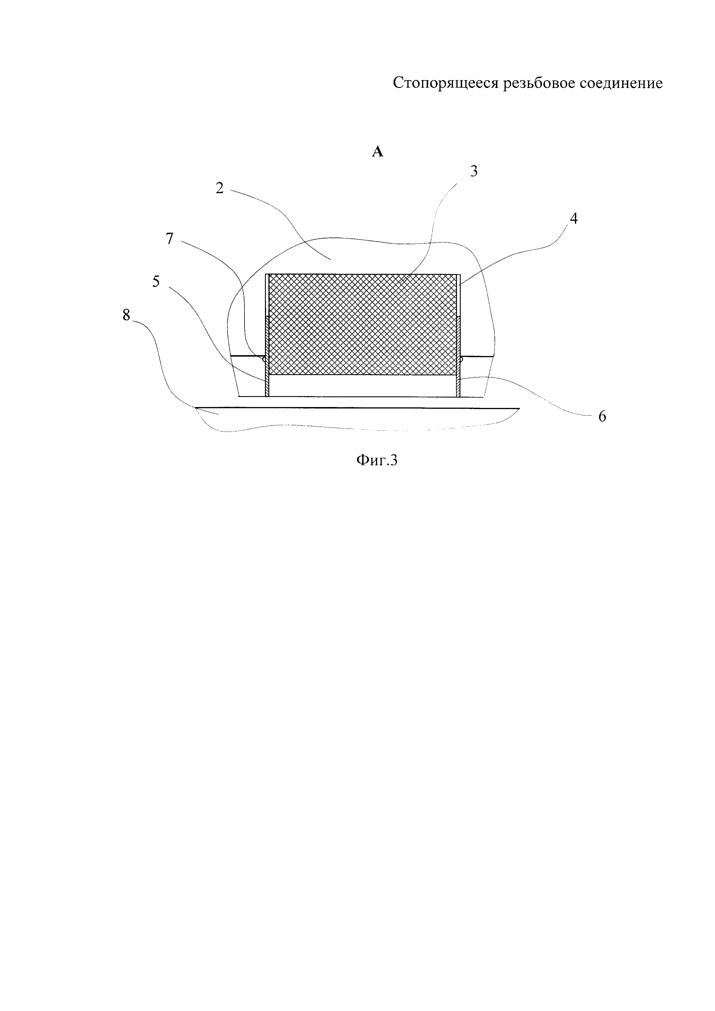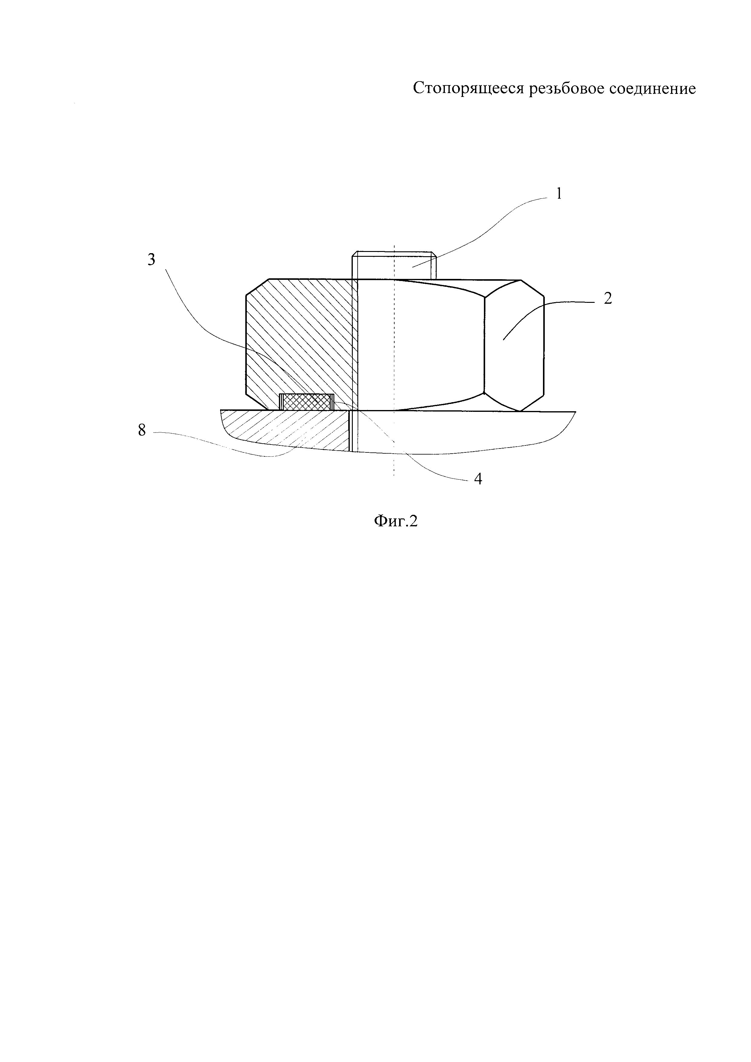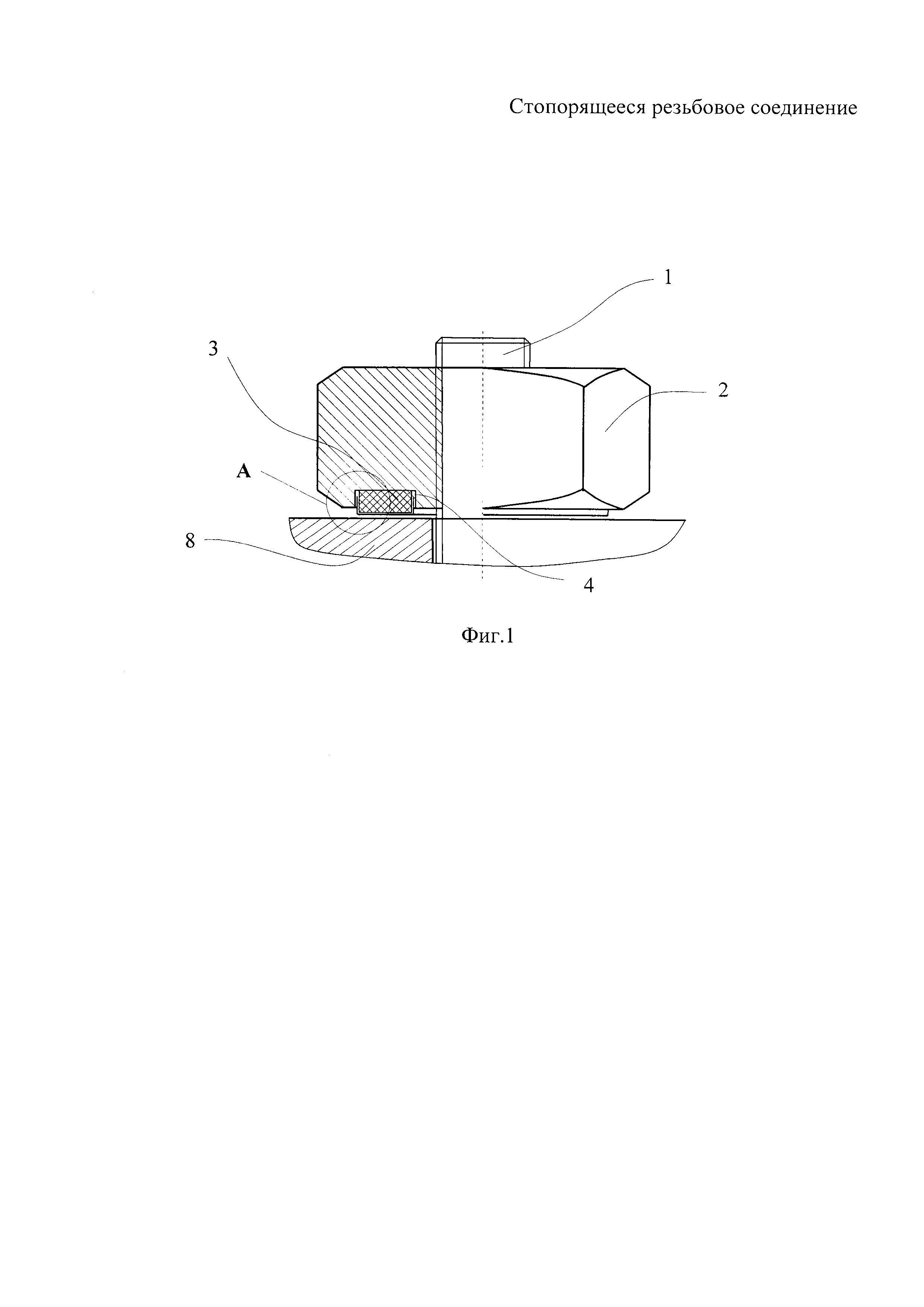 Изобретение относится к крепежным изделиям и может быть использовано в механизмах, испытывающих вибрационные, ударные нагрузки и тепловое воздействие. Изобретение преимущественно предназначено для использования в энергетических машинах и установках автомобильной, авиационной, машиностроительной, железнодорожной и других отраслях промышленности. Известно стопорящееся крепежное соединение, включающее болт (шпильку) с гайкой и шайбой Гровера, см. книгу Орлова П.И. Основы конструирования: Справочно-методическое пособие. В 2-х кн. Кн. 2. - М.: Машиностроение, 1988. С. 145-146, рис. 315. Недостатком крепежного соединения с шайбой Гровера является ограниченность использования при знакопеременных нагрузках вибрационного ударного действия. Это объясняется тем, что после завинчивания и затяжки гайки шайба Гровера обеспечивает только локальное стопорение гайки и детали. Известна самоконтрящаяся гайка с отверстиями и вставленными в них пластмассовыми штифтами. При завинчивании гайки происходит нарезка резьбы в пластмассовых штифтах, материалом которых заполняется резьбовое соединение, см. RU Патент 2347119, МПК F16B 39/34, F16B 39/06, 2009. Недостатком самоконтрящейся гайки является ненадежность стопорения резьбового соединения от самопроизвольного отвинчивания гайки, что ограничивает ее использование при воздействии нагрузок вибрационного и ударного характера, в том числе в условиях термического воздействия. Указанный недостаток обусловлен тем, что пластмасса, из которых изготовлены штифты, теряет свои свойства при воздействии тепла, света, химических веществ и т.п. Наиболее близким по технической сущности является стопорящееся резьбовое соединение, включающее болт (шпильку) с резьбовым стержнем, гайку, контактирующую по торцу с шайбой из деформируемого материала, в качестве которого используют пластмассу (найлон, капрон, акрилон). При затяжке гайки шайба деформируется, материал шайбы заполняет витки резьбы, см. Книга Орлова П.И. Основы конструирования: Справочно-методическое пособие в 2-х кн., Кн. 2. - М.: Машиностроение, 1988. С. 148, рис. 338. Недостатком данного объекта является ненадежность стопорения резьбового соединения от самопроизвольного отвинчивания гайки, что ограничивает ее использование в энергетических машинах и установках автомобильной, авиационной, машиностроительной, железнодорожной отраслях промышленности. Под действием тепла, выделяемого энергетическими машинами и установками, в пластических массах наблюдаются деструктивные реакции, при которых полимер радикально меняет свои свойства: изменяется молекулярная масса, строение и химические свойства. Наложение вибрационных воздействий на резьбовое соединение приводит к возникновению момента сил раскручивания превышающего момент сил трения в месте резьбового соединения. Технической задачей изобретения является повышение надежности стопорения резьбового соединения при воздействии нагрузок вибрационного и ударного характера, в том числе в условиях термического воздействия. Техническая задача решается тем, что стопорящееся резьбовое соединение, включающее болт (шпильку) с резьбовым стержнем, гайку, контактирующую по торцу с шайбой из деформируемого материала, согласно изобретению гайка выполнена с кольцевой канавкой, в которую установлены направляющие по внутренн