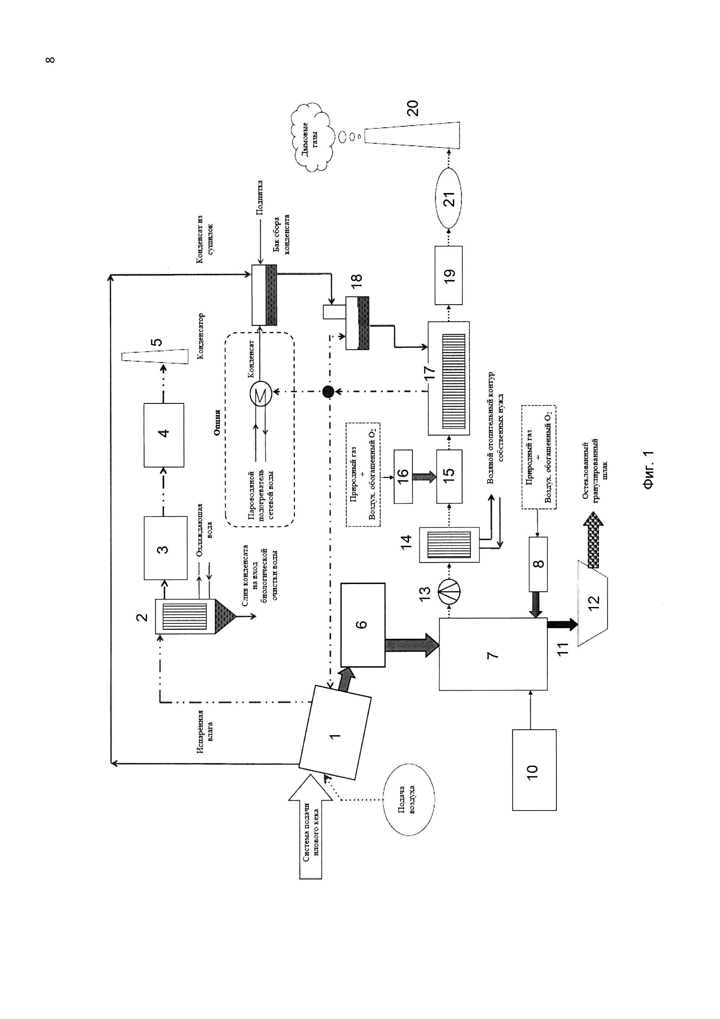 1. Способ термической переработки кека иловых осадков в шлаковом расплаве, характеризующийся тем, что кек подают на систему сушильных установок с нагревом кека и получением испаренной влаги и осушенного кека, после чего осушенный кек подают в бункер-накопитель, из которого кек направляют в печь-газификатор, оснащенную горелкой и блоком молибденовых электродов, а также блоком слива жидкого шлака, через который жидкий шлак подают в гранулятор, в печи-газификаторе органическую составляющую кека преобразуют в продуктовый газ, который через контактный теплообменник подают в водяной теплообменник, где продуктовый газ охлаждают и направляют в камеру полного сжигания с тангенциальным входом, где летучие органические соединения газа полностью сжигают в избытке кислорода, при этом камера полного сжигания выполнена суженной в области между входом и выходом для газа, продукты сгорания после камеры полного сжигания через газоход подают в паровой котел-утилизатор тепла, из которого отходящий газ подается через систему газоочистки в дымовую трубу. 2. Способ термической переработки по п. 1, характеризующийся тем, что система очистки нагретого воздуха после сушильных установок и перед дымовой трубой включает теплообменник охлаждения и конденсации воды, циклон очистки выпара и систему биологической очистки воздуха. 3. Способ термической переработки по п. 1, характеризующийся тем, что продуктовый газ, полученный из органической составляющей кека, представляет собой синтез-газ процесса газификации высушенного кека при подаче определенного расхода кислорода. 4. Способ термической переработки по п. 1, характеризующийся тем, что продуктовый газ, полученный из органической составляющей кека, представляет собой пирогаз процесса пиролиза высушенного кека в отсутствие кислорода. 5. Способ термической переработки по п. 1, характеризующийся тем, что подача отходящего газа в дымовую трубу и разрежение в линии от печи-газификатора до котла-утилизатора обеспечивается дымососом.