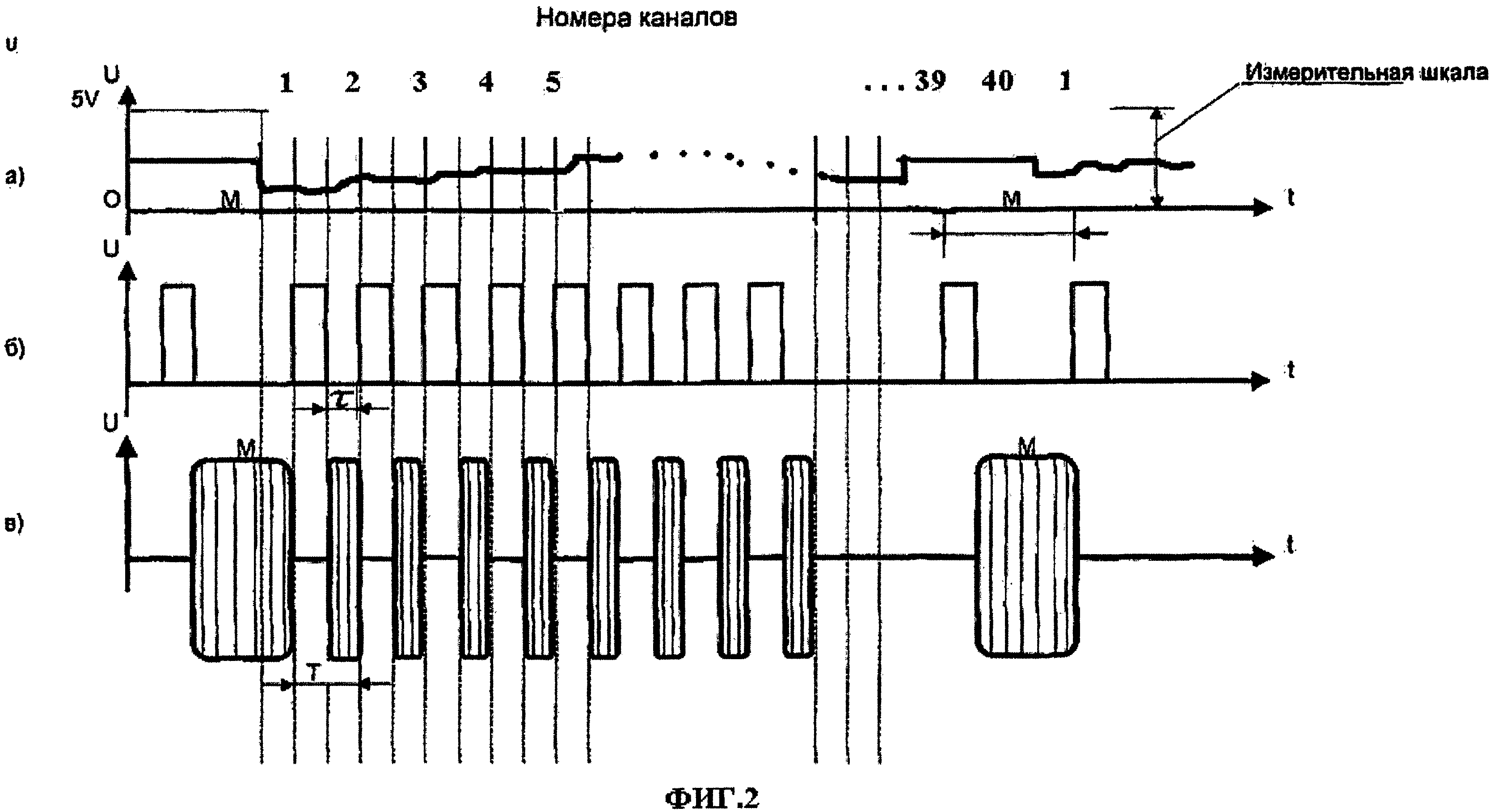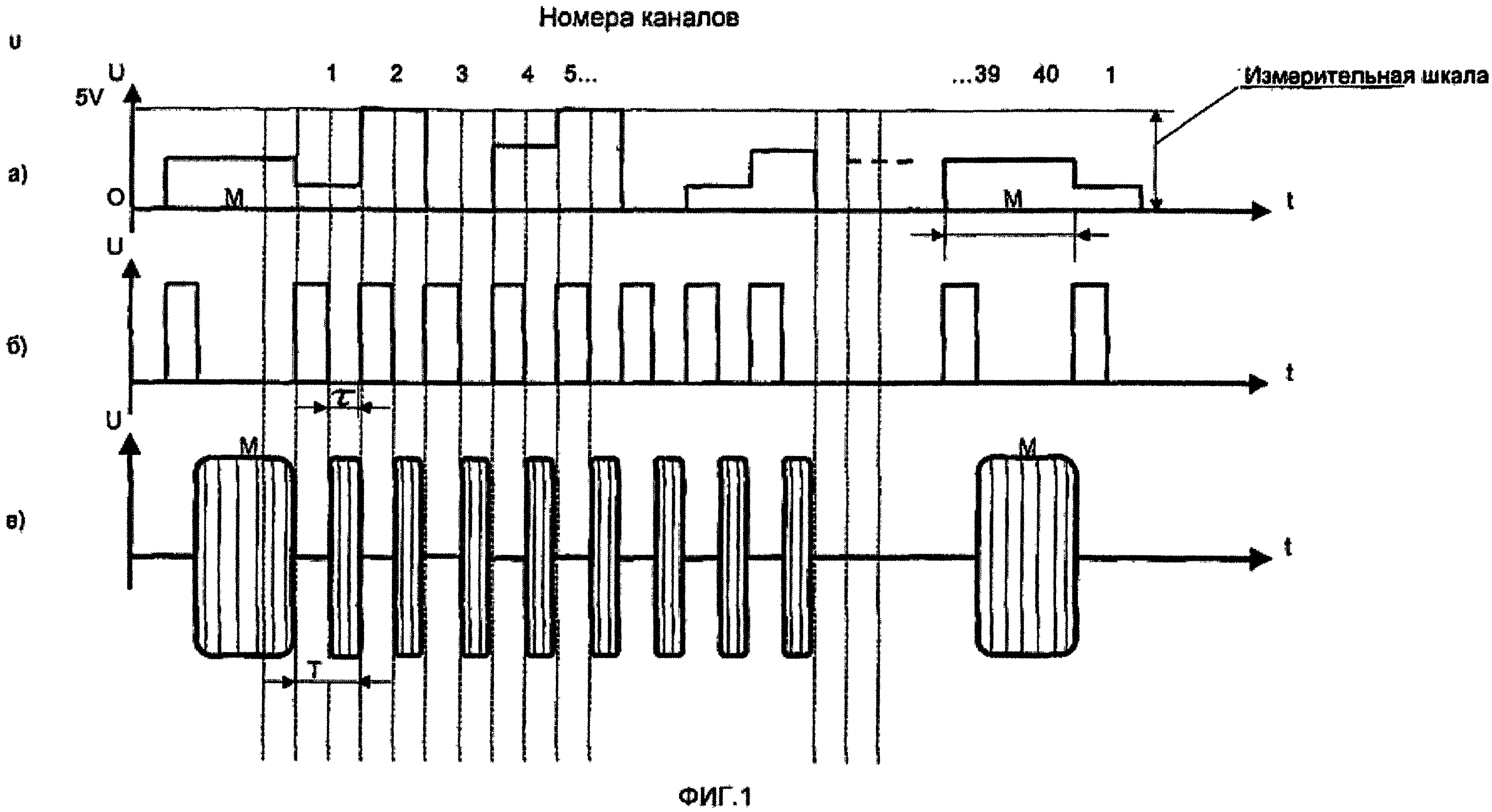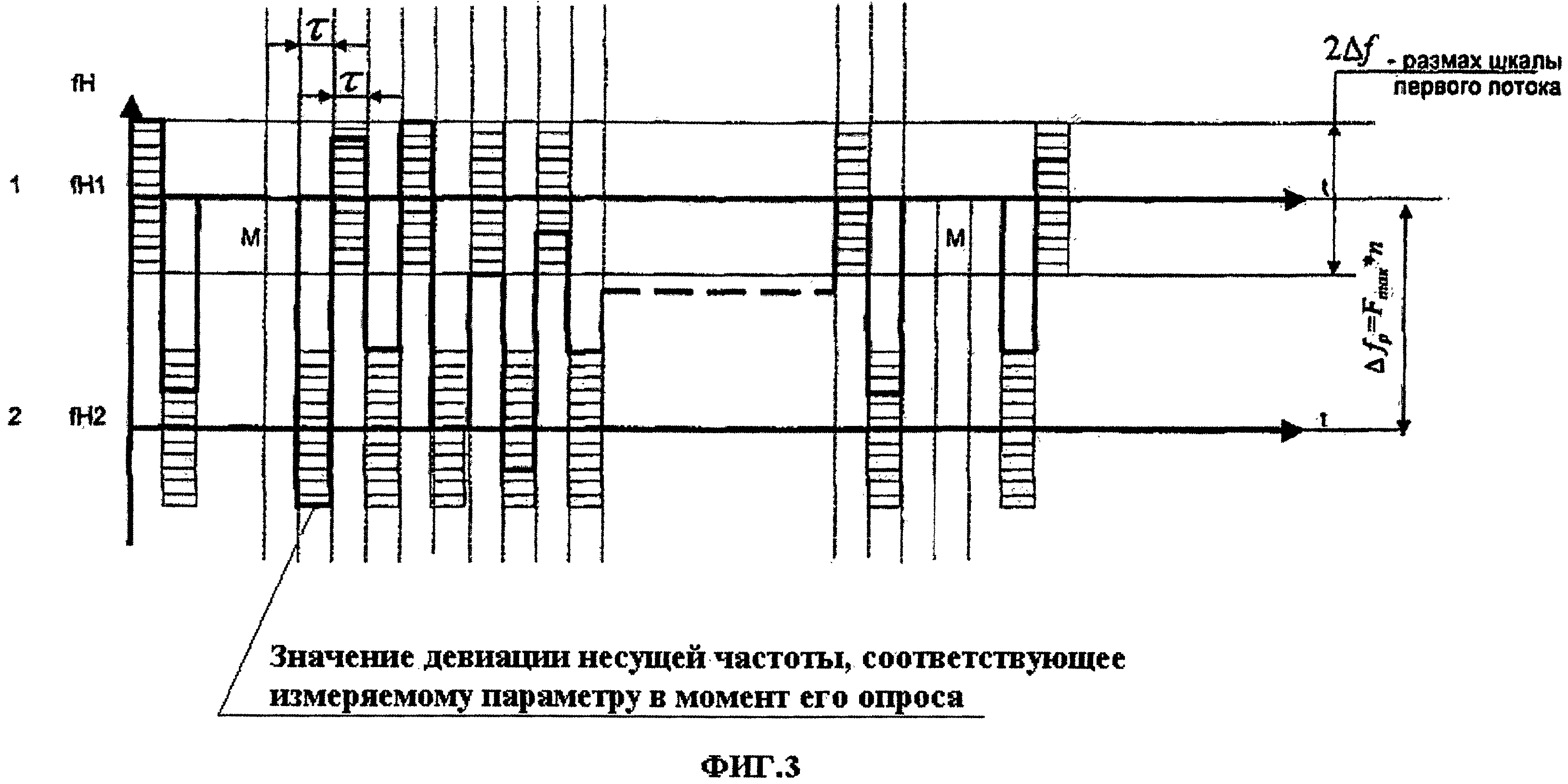 1. Способ передачи информации с частотно-временным уплотнением радиоканала и аналого-цифровым методом модуляции несущей частоты N (где N=2, 4, 8…) синхронными видеопотоками, в каждом из которых на тактовой частоте Fтак осуществляется разделение каналов во времени со скважностью Q=2, при этом каждый поток разнесен от соседнего по несущей частоте на частотный интервал Δfp=Fтак×n (где n=5, 6, 7…) и сдвинут по времени на половину такта 2. Устройство для осуществления способа по п. 1, содержащее последовательно соединенные генератор тактовых частот (1), делитель частоты (2), формирователь маркерного импульса (3), фазовый детектор (4), частотный модулятор (5), управляемый генератор (6) и усилитель мощности (7), опорный генератор несущих частот (8), выход которого подключен ко второму входу фазового детектора (4), к третьему входу которого подключен второй выход управляемого генератора (6), первый коммутатор (9), вход которого подключен ко второму выходу генератора тактовых частот (1), сумматор (10), включенный между выходом первого коммутатора (9) и вторым входом частотного модулятора (5), второй коммутатор (11), включенный между третьим выходом генератора тактовых частот (1) и вторым входом сумматора (10), формирователь частотной «подставки» (12), включенный между третьим выходом генератора тактовых частот (1) и третьим входом частотного модулятора (5), отличающееся тем, что в него введены последовательно соединенные видеокамера (13), селектор видеосинхроимпульсов (14) и формирователь видеомаркера (15), подключенный выходом ко второму входу второго коммутатора (11), дискретизатор видеоинформации (16), включенный между третьим выходом генератора тактовых частот (1) и третьим входом второго коммутатора (11), выход видеокамеры (13) соединен со вторым входом дискретизатора видеоинформации (16), третий вход которого соединен с первым входом формирователя видеомаркера (15), второй вход которого соединен с первым входом второго коммутатора (11).