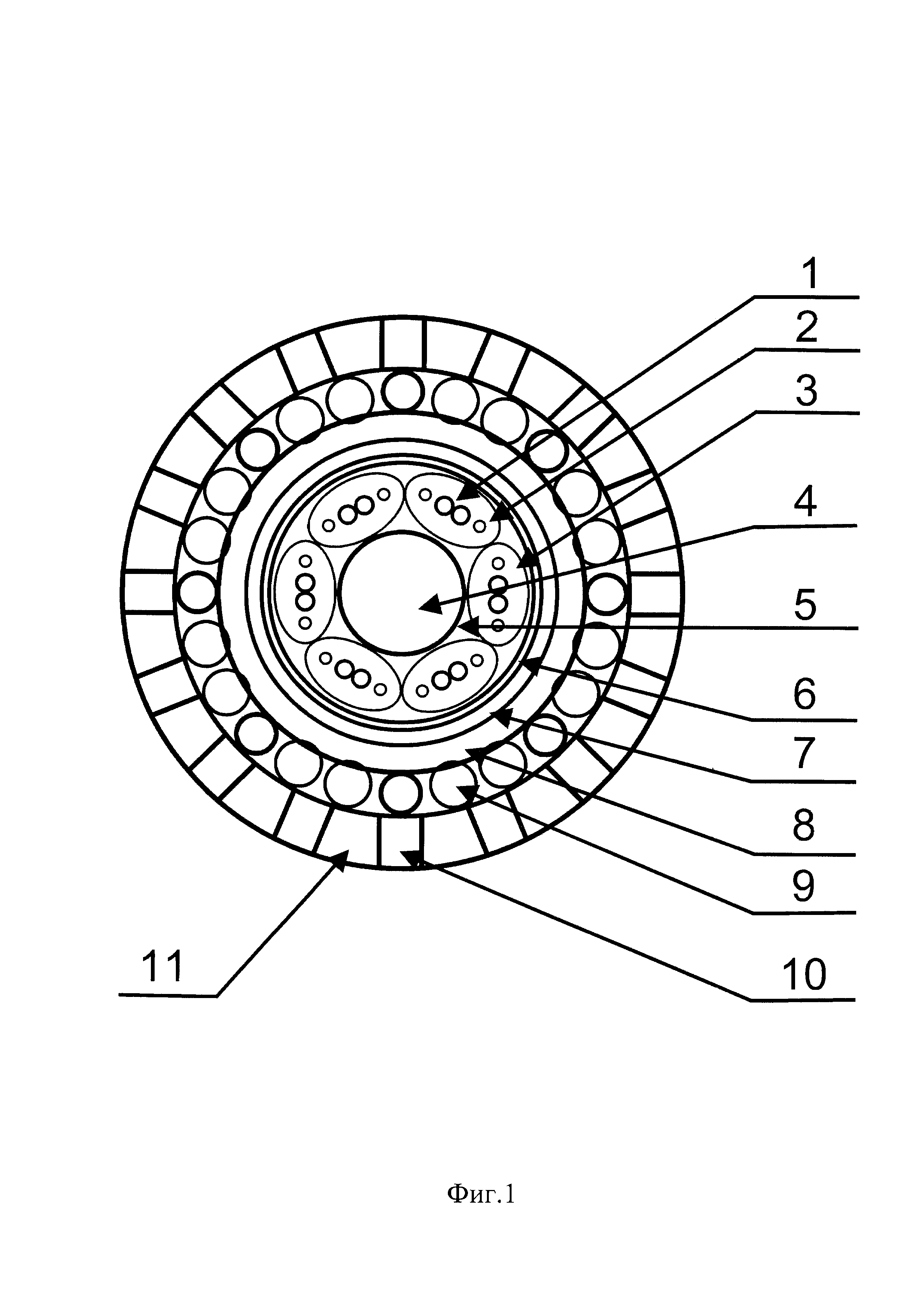 Область техники Изобретение относится к области электротехники и может быть использовано в конструкциях оптических кабелей связи при прокладке волоконно-оптических линий связи по руслу рек и переходах через реки и озера. Уровень техники Известна конструкция оптического кабеля связи для речных переходов с двойной круглопроволочной броней (Д. Шарле «Хет-трик в матче с Атлантикой»), Серия изданий: «История электросвязи и радиотехники», вып. 2, М. 2002; рис 21.10 стр. 208). Кабель содержит центральный силовой элемент. Оптические волокна в свободной трубке, поясную изоляцию, внутреннюю полиэтиленовую оболочку, гофрированную стальную ленту, промежуточную полиэтиленовую оболочку, джутовую подушку, броню из круглых стальных проволок и наружный полиэтиленовый шланг или битумный защитный покров. Недостатком конструкции является наличие экологически опасного гидрофобного заполнителя и сложность прокладки такой конструкции по руслу рек и закапывания такого кабеля в речной грунт. Известна конструкция глубоководного оптического кабеля (Д. Шарле «Хет-трик в матче с Атлантикой», Серия изданий: «История электросвязи и радиотехники», вып. 2, М. 2002; рис. 21.11, стр. 208). Основу ее составляет профильный модуль, в пазы которого укладываются оптические волокна. Пазы заполнены гидрофобным гелем. В центре модуля проходит стальная проволока, окружен модуль тонкой пластмассовой оболочкой, двумя повивами из круглых проволок, медной трубкой, полиэтиленовой оболочкой, второй медной трубкой, внешней полиэтиленовой оболочкой. Недостатком данной конструкции является также наличие экологически опасного гидрофобного заполнителя, трудность доступа к оптическим волокнам без доступа к ним воды, организация дистанционного питания по системе «провод-вода», что наносит вред окружающей среде, кабель подвергается самокоррозии, сложность закапывания данной конструкции в речной грунт. Известна конструкция подводного оптического кабеля (ОК); марки ПОК-400 производства ЗАО «Севкабель-оптик» с медными жилами для дистанционного питания для прокладки в морях и океанах. Она содержит центральную полимерную трубку со свободно уложенными оптическими волокнами (ОВ), заполненную, гидрофобным компаундом медную круглую проволоку поверх полимерной трубки (токопроводящая жила дистанционного электропитания) водоблокирующую ленту, медную ленту, промежуточную полимерную оболочку из полиэтилена высокой плотности, круглопроволочную броню поверх оболочки из оцинкованной стальной проволоки в гидрофобном заполнителе, наружную полимерную оболочку из полиэтилена высокой плотности (Э.Л. Портнов Оптические кабели связи их монтаж и измерение, стр. 189, рис 5.29, М. Горячая линия-Телеком 2012. 448 стр.). Недостатком данной конструкции является по конструктивному решению организация электропитания промежуточных усилителей только по системе «провод-вода»,что наносит вред экологии водной среды, трудность доступа к ОВ при повреждении ОК и его эксплуатации, трудность заиливания кабеля в морской грунт. Известны конструкции подводных оптических кабелей для, разных глубин прокладки, конструкция которых создана таким образом, что организация дистанционного питания осуществляется только по системе «провод-вода» (С.Л. Денисов, И.Э. Самарцев Общее рассмотрение подводных оптоволоконных линий