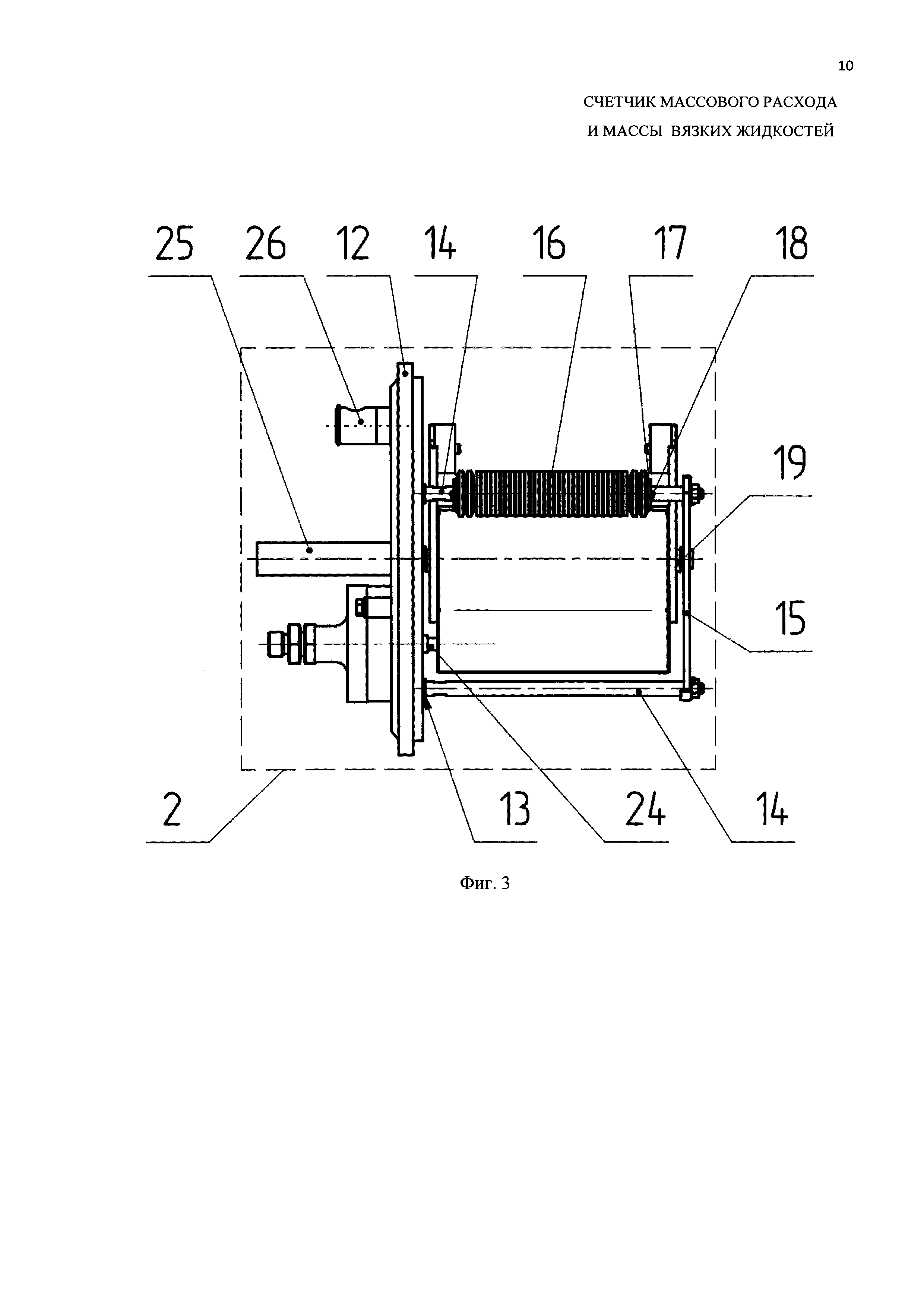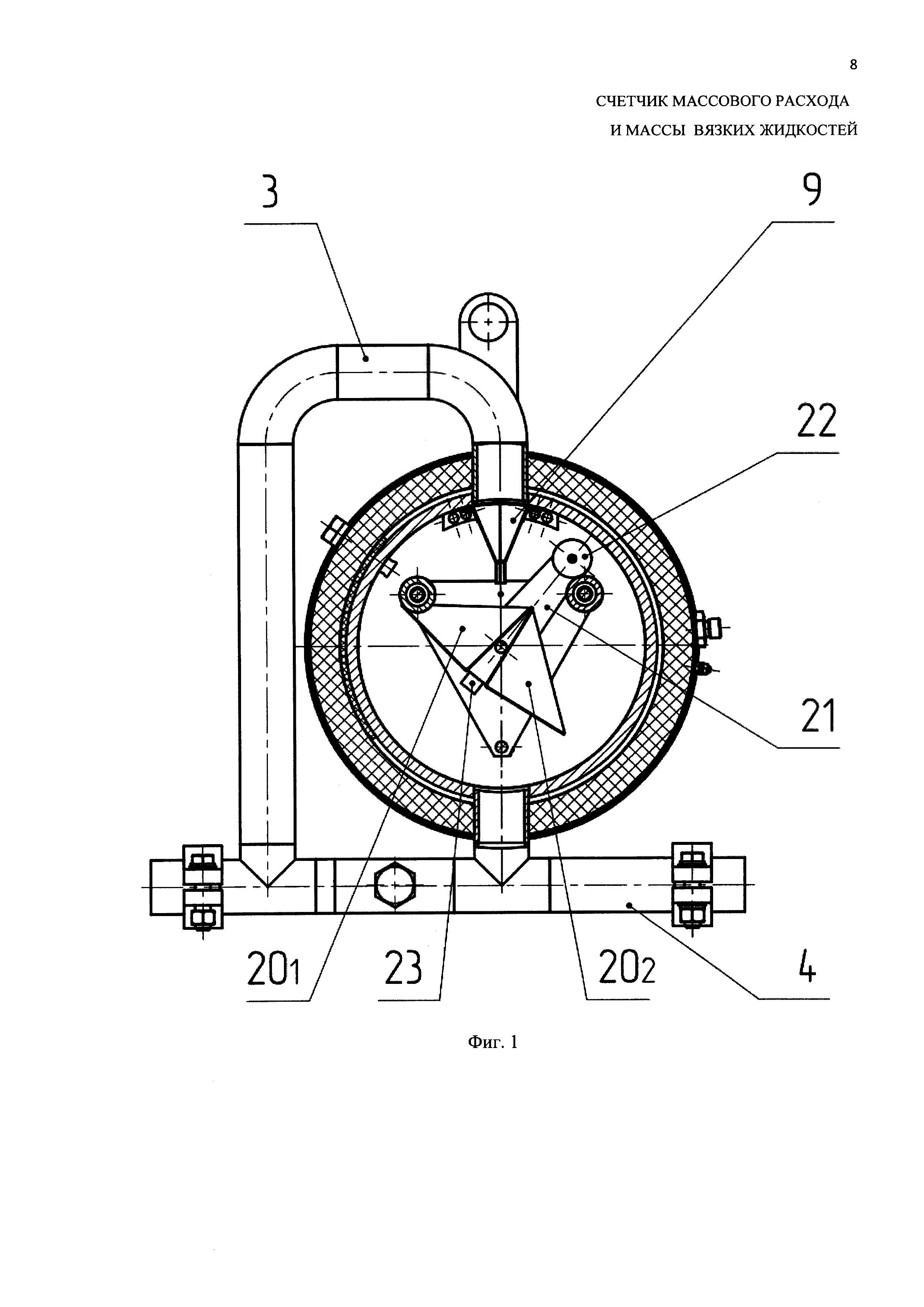 Изобретение относится к области измерительной техники и может быть использовано для измерений массового расхода и массы вязких жидких сред. Счетчик содержит корпус 1, размещенный в нем измерительный блок 2, на корпусе - входной коллектор 3, выходной коллектор 4, устройство 5 электрического обогрева. Корпус 1 представляет собой горизонтально расположенный цилиндрический сосуд, на обечайке 6 которого перпендикулярно оси выполнены два соосных отверстия 7 и 8 для входа/выхода измеряемой среды посредством герметично присоединенных входного и выходного коллекторов 3 и 4 соответственно. На входном отверстии 7 установлено устройство 9 моделирования формы потока жидкости. К корпусу 1 через фланец 10 при помощи кольца 11 прикреплена крышка 12 измерительного блока 2. Для придания герметичности соединения используется прокладка из резины. На внутреннем торце крышки 12 выполнены три отверстия 13 с резьбой, в которые устанавливаются шпильки 14, служащие осями для крепления опоры 15. На осях 14 установлены ударогасители 16, перемещение которых ограничивается шайбой 17 и шплинтом 18. На торце крышки 12 и опоры 15 имеются соосные отверстия и прокладка с подшипниками, в которых установлена ось 19 измерительного блока 2. Измерительный блок 2 является подвижной системой из двух призматических ковшей 201, 202 треугольного сечения и боковых пластин 21, к которым крепится груз 22, причем на нижней плоскости посередине между ковшей 201, 202 установлен постоянный магнит 23. На наружном торце крышки 12 измерительного блока 2 выполнены отверстия для крепления электромагнитного датчика 24, ручек 25 и уровня 26. Отверстие для крепления электромагнитного датчика выполнено таким образом, что его центр совпадает с