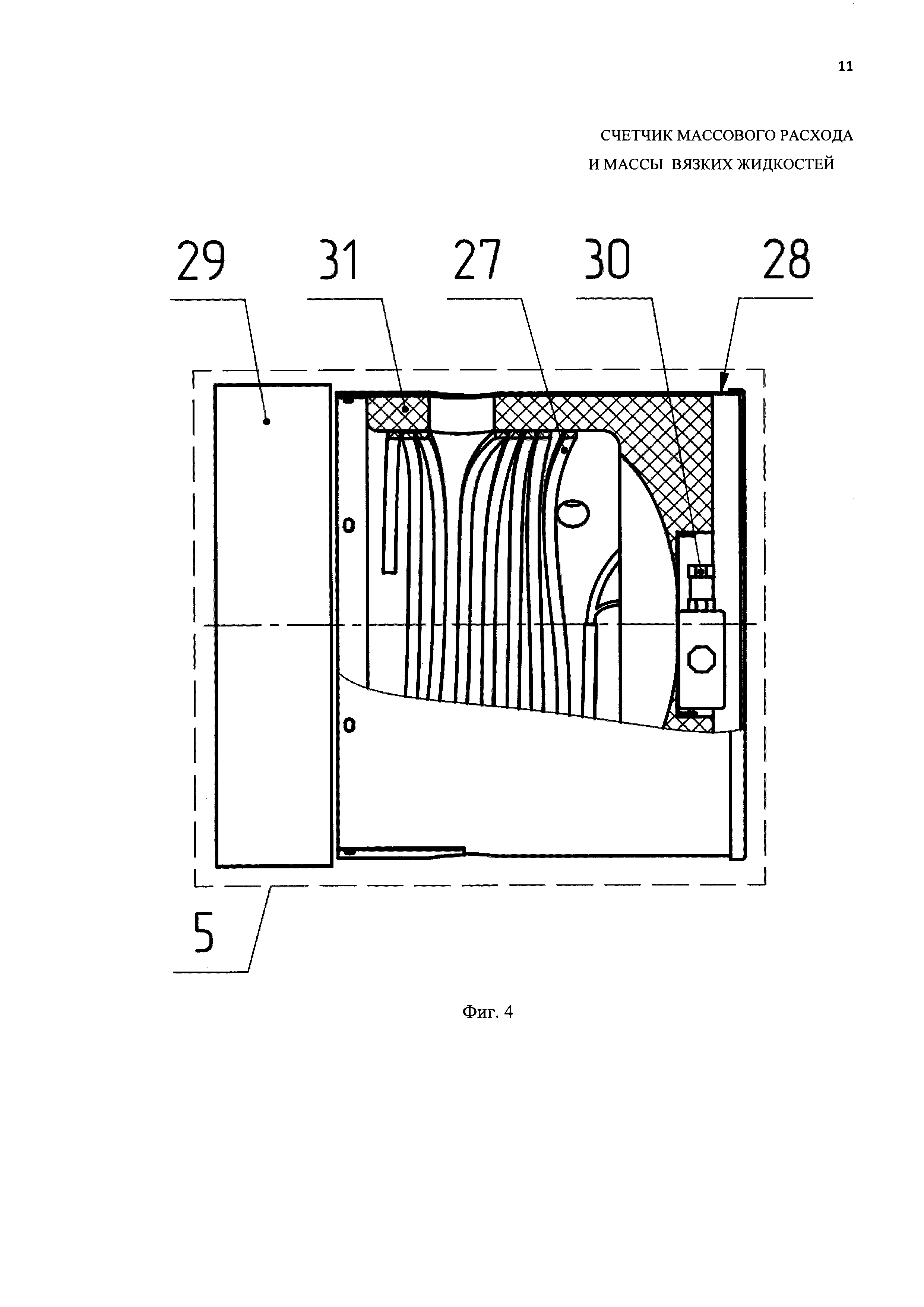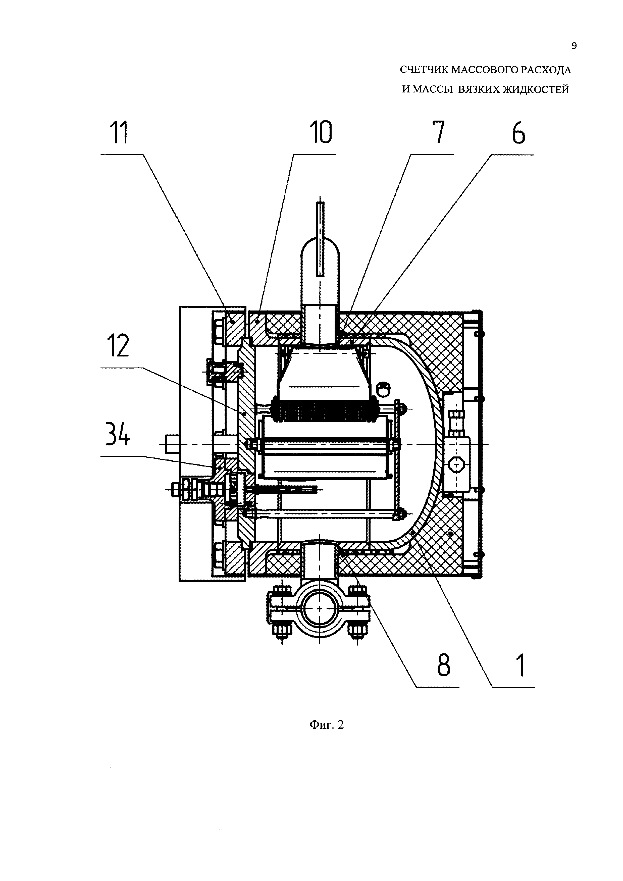 Счетчик массового расхода и массы вязких жидкостей, состоящий из корпуса, измерительного блока, входного и выходного коллекторов, при этом корпус представляет собой горизонтально расположенный цилиндрический сосуд, на обечайке которого перпендикулярно оси выполнены два соосных отверстия для входа/выхода вязкой жидкости посредством герметично присоединенных входного и выходного коллекторов, а на входном отверстии установлено устройство моделирования формы потока, к корпусу через фланец прикреплена крышка измерительного блока с герметизацией соединения с помощью резиновой прокладки, причем на внутреннем торце крышки выполнены три отверстия с резьбой, в которые установлены шпильки, служащие осями для крепления опоры и установки на них ударогасителей, перемещение которых ограничено шайбой и шплинтом, а на торце крышки и опоры имеются соосные отверстия с подшипниками и в них установлена ось измерительного блока, который является подвижной системой и состоит из двух призматических ковшей треугольного сечения и боковых пластин, к которым прикреплены грузы, при этом измерительный блок снабжен по меньшей мере одним постоянным магнитом, на наружном торце крышки измерительного блока выполнены отверстия для крепления по меньшей мере одного электромагнитного датчика, ручек и уровня, причем отверстие для крепления электромагнитного датчика выполнено таким образом, что его центр совпадает с траекторией движения постоянного магнита измерительного блока, при этом электромагнитный датчик связан с вычислителем, отличающийся тем, что он содержит устройство электрического обогрева, состоящее из закрепленного на внешней поверхности корпуса электрического греющего кабеля, размещенного в теплоизоляционном кожухе с теплоизоляционной крышкой, в котором закреплена взрывозащищенная клеммная коробка для подвода питания к этому кабелю, при этом пространство между кабелем, крышкой и кожухом заполнено теплоизоляционным объемным наполнителем, постоянный магнит в измерительном блоке установлен на нижней плоскости посредине между призматическими ковшами, электромагнитный датчик содержит дополнительно помещенную во взрывобезопасный корпус плату электронного корректора, представляющего собой программируемое устройство, а выходной коллектор выполнен в виде прямолинейного участка трубы.
