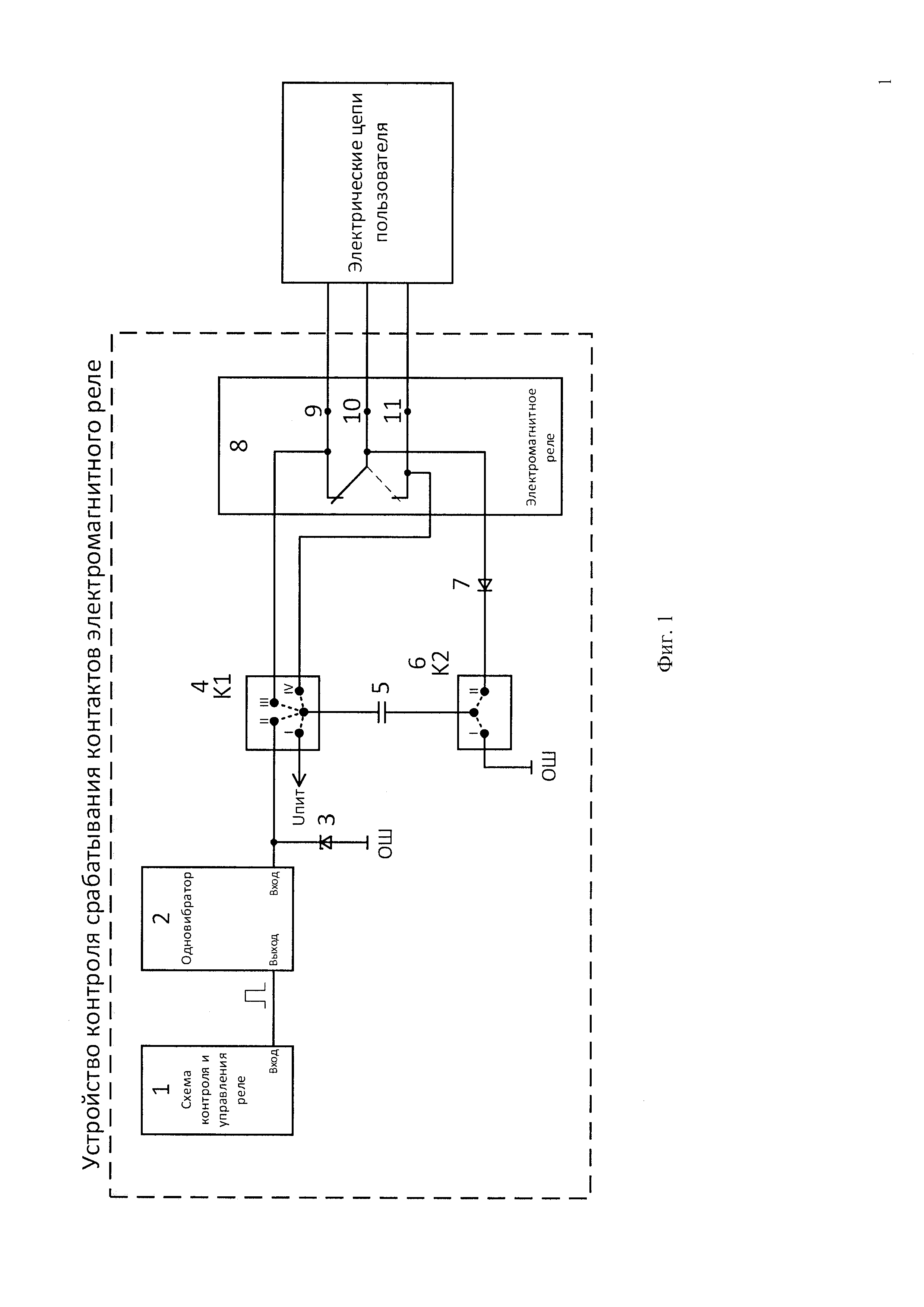 Изобретение относится к области приборостроения и может быть использовано при построении коммутационных устройств на основе электромагнитных реле. Известно устройство для дистанционного контроля электромагнитного реле (патент на изобретение RU 2073269), которое предназначено для контроля реле, подключенного к коммутируемым электрическим цепям пользователя, и содержит источник электропитания, соединенный посредством выключателя с обмоткой контролируемого реле, датчик срабатывания реле, выполненный в виде дросселя, включенного последовательно в цепь выключателя и шунтированного диодом, и последовательно включенным с датчиком срабатывания входным элементом индикатора срабатывания, а также комплект электроизмерительных приборов, подключенных к обмотке контролируемого реле. Недостатком указанного устройства является отсутствие контроля непосредственного включения и выключения контактов электромагнитного реле, т.е. состояния замкнутости/разомкнутости контактов электромагнитного реле, которые могут выгореть или, наоборот, «спаяться», контролируется только факт возбуждения обмотки реле. Прототипом является устройство для контроля электромагнитных реле (патент на изобретение RU 2017197), которое предназначено для диагностического контроля реле и контакторов и содержит источник питания, коммутатор, индикаторы контроля, два конденсатора, соединенные через коммутатор с источником питания и через диод с выводами, предназначенными для подключения контактов и обмотки испытуемого электромагнитного реле. Недостатком указанного устройства является невозможность проведения контроля реле, подключенного при эксплуатации к коммутируемым электрическим цепям пользователя, без изъятия реле из эксплуатационной электрической схемы. Задачей изобретения является создание способа и устройства для контроля состояния замкнутости контактов электромагнитного реле, подключенных при эксплуатации к коммутируемым электрическим цепям пользователя, без изъятия реле из эксплуатационной электрической схемы. Схема устройства контроля срабатывания контактов электромагнитного реле приведена на фиг. 1. Uпит - напряжение питания; ОШ - общая шина схемы; 1. схема контроля и управления реле; 2. одновибратор; 3. диод-ограничитель напряжения; 4. первый коммутатор (К1); 5. конденсатор; 6. второй коммутатор (К2); 7. диод; 8. электромагнитное реле; 9. первый контакт электромагнитного реле (КЭР1); 10. второй контакт электромагнитного реле (КЭР2); 11. третий контакт электромагнитного реле (КЭР3). Устройство контроля срабатывания контактов электромагнитного реле содержит следующие элементы и связи между ними. Схема контроля и управления реле (1) и выход одновибратора (2) связаны между собой. Между К1 (4) и К2 (6) подключается конденсатор (5). К1 связан контактом I с Uпит, контактом II - с входом одновибратора (2) и катодом диода-ограничителя напряжения (3), контактом III - с первым контактом электромагнитного реле (КЭР1) (9), контактом IV - с третьим контактом электромагнитного реле (КЭР3) (11). К2 связан контактом I с общей шиной схемы (ОШ), контактом II - диодом (7), который соединен с КЭР2 (10). Анод диода-ограничителя напряжения (3) соединен с ОШ. КЭР1, КЭР2 и КЭР3 соединяют электромагнитное реле (8) с электрическими цепями пользователя. Полярность включения диода (7) в схему не имеет значения и н