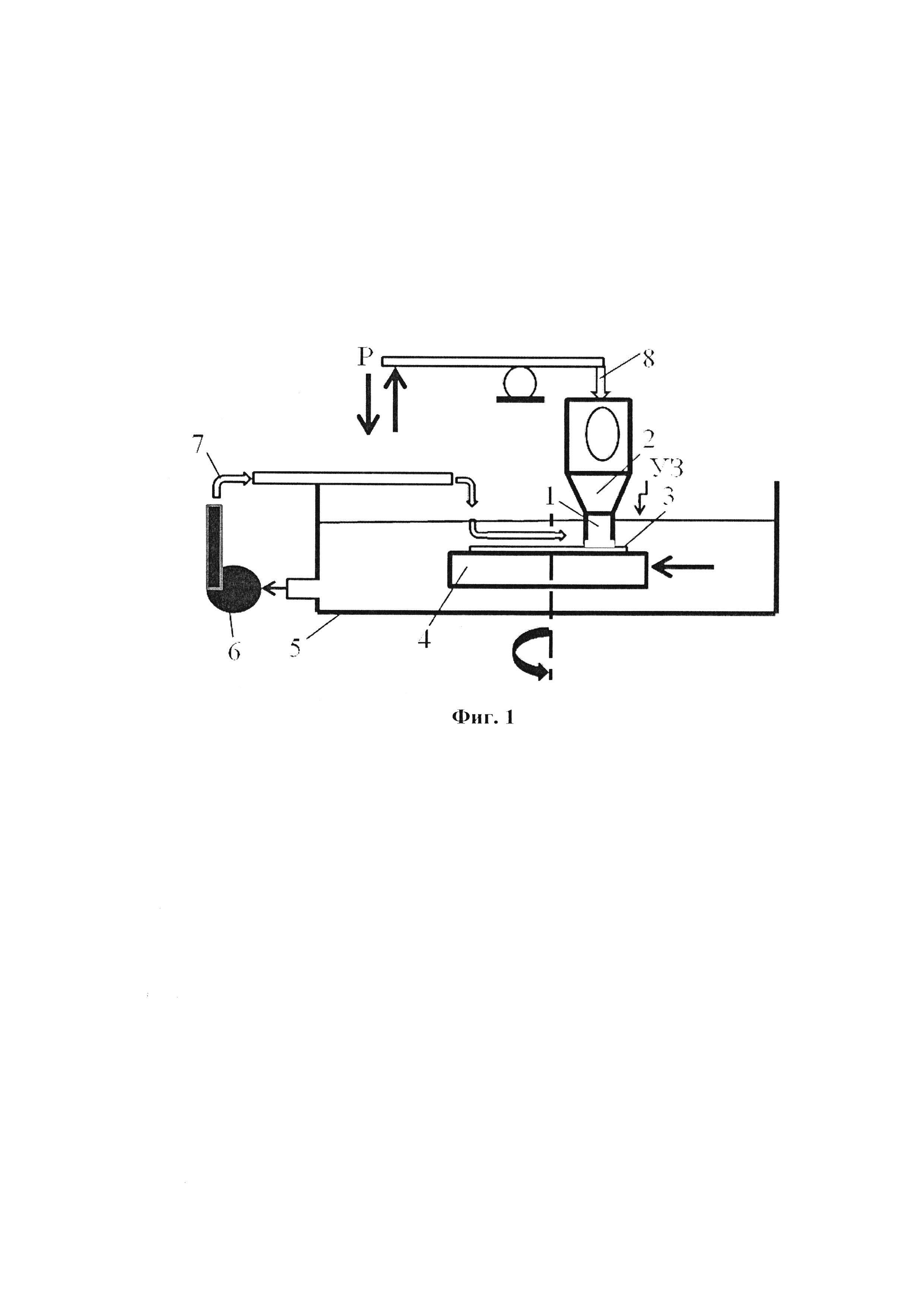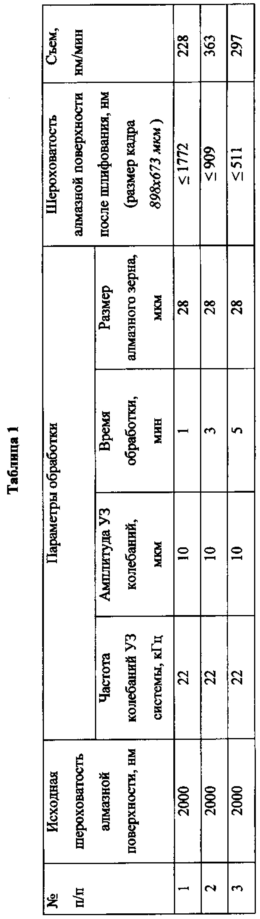 Предлагаемое изобретение относится к теплоэнергетике, электрохимии, микроэлектронике, точному приборостроению, а именно: к области механической обработки алмазов, в частности к способам ультразвуковой обработки алмазов, более конкретно: к способам шлифования и планаризации высокоаспектных поликристаллических алмазных пленок, полученных методом химического осаждения из газовой фазы, имеющих хаотическое расположение зерен на ростовой поверхности, с использованием ультразвуковых колебаний, накладываемых на излучатель, и может быть использовано преимущественно при изготовлении конструкционных, в том числе теплоотводящих, оптических и электронных элементов, например при планаризации, уменьшении неплоскостности и шероховатости на теплоотводах, элементах электрохимии, микроэлектроники и т.д. Состояние поверхности оказывает существенное влияние на теплопроводность граничного слоя, адгезионные, оптические, прочностные и др. характеристики поликристаллических алмазов, полученных осаждением из газовой фазы. Изначально полученные образцы характеризуются неплоской и шероховатой поверхностью и высоким аспектным числом, ограничивающими обработку и применение этих алмазов по параметрам, перечисленным выше. Для преодоления этих ограничений требуется уменьшить шероховатость полученных алмазных пленок и внести при этом минимальные повреждения в приповерхностный слой. Для получения поверхностей с плоским рельефом используются шлифование путем испарения или сублимации поверхности, шлифование при помощи химических реакций, лазерное шлифование, механохимическое шлифование, механическое шлифование, механическое с абразивными частицами с наложением ультразвуковых колебаний и т.д. При достаточно сильном нагревании поверхности материалов начинается процесс плавления или испарения. Шлифование алмазов путем испарения или сублимации поверхности раскрывается в патенте [1]. Согласно данному патенту заявляется способ абляции синтетического алмаза, полученного осаждением из газовой фазы, в соответствии с которым наносят слой коллоидального графита, а затем осуществляют травление поверхности плазмой, которая уносит материал с поверхности, образуя сглаженную поверхность. Затем, при необходимости, осуществляют притирочную доводку. Шлифование при помощи химических реакций достаточно часто встречается в патентной литературе. Например, в заявке [2] раскрывается способ шлифовки минеральных объектов, в соответствии с которым шлифуемую поверхность алмаза сначала насыщают водородом, а затем в процессе шлифовки используют химический активатор шлифовки, способный при нагревании генерировать локальную экзотермическую реакцию или реакцию, приводящую к химическому разрушению поверхности. В патентах [3, 4, 5] раскрываются способы химико-механического шлифования. Суть этих способов состоит в том, что на поверхность алмазных пленок наносят шлифовальную среду, представляющую собой диспергированные в жидкости абразивные частицы (в патенте [6] - диоксида кремния, а в заявке [7] - оксида алюминия) или частицы переходных металлов кислотного или основного носителя, а затем проводят обработку поверхности трением с использованием этих абразивных частиц, поверхность шлифуется за счет трения, возникающего при взаимодействии алмаз