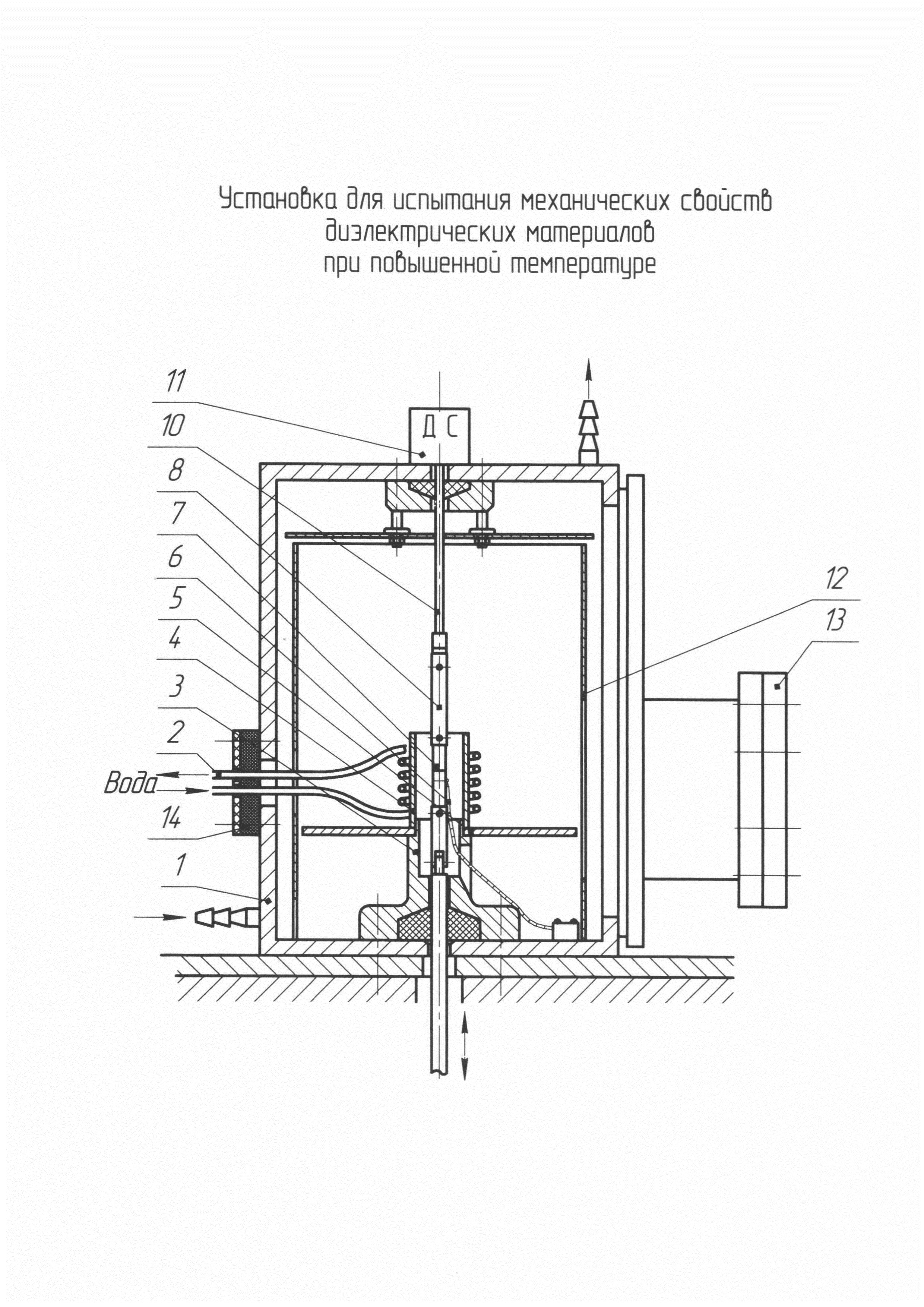 Установка для испытания диэлектрических материалов, содержащая ВЧ-индуктор, промежуточные токопроводящие элементы, верхнюю и нижнюю тяги с захватами, а также контрольную и регистрирующую аппаратуру, отличающаяся тем, что между индуктором и рабочим образцом соосно относительно тяг размещен цилиндр из токопроводящего материала, закрепленный на подставке с термопарой внутри нее, установленной на днище герметичной камеры, при этом высота цилиндра и высота индуктора выбираются такими, чтобы обеспечить постоянную температуру на рабочей части образца в процессе его деформирования.