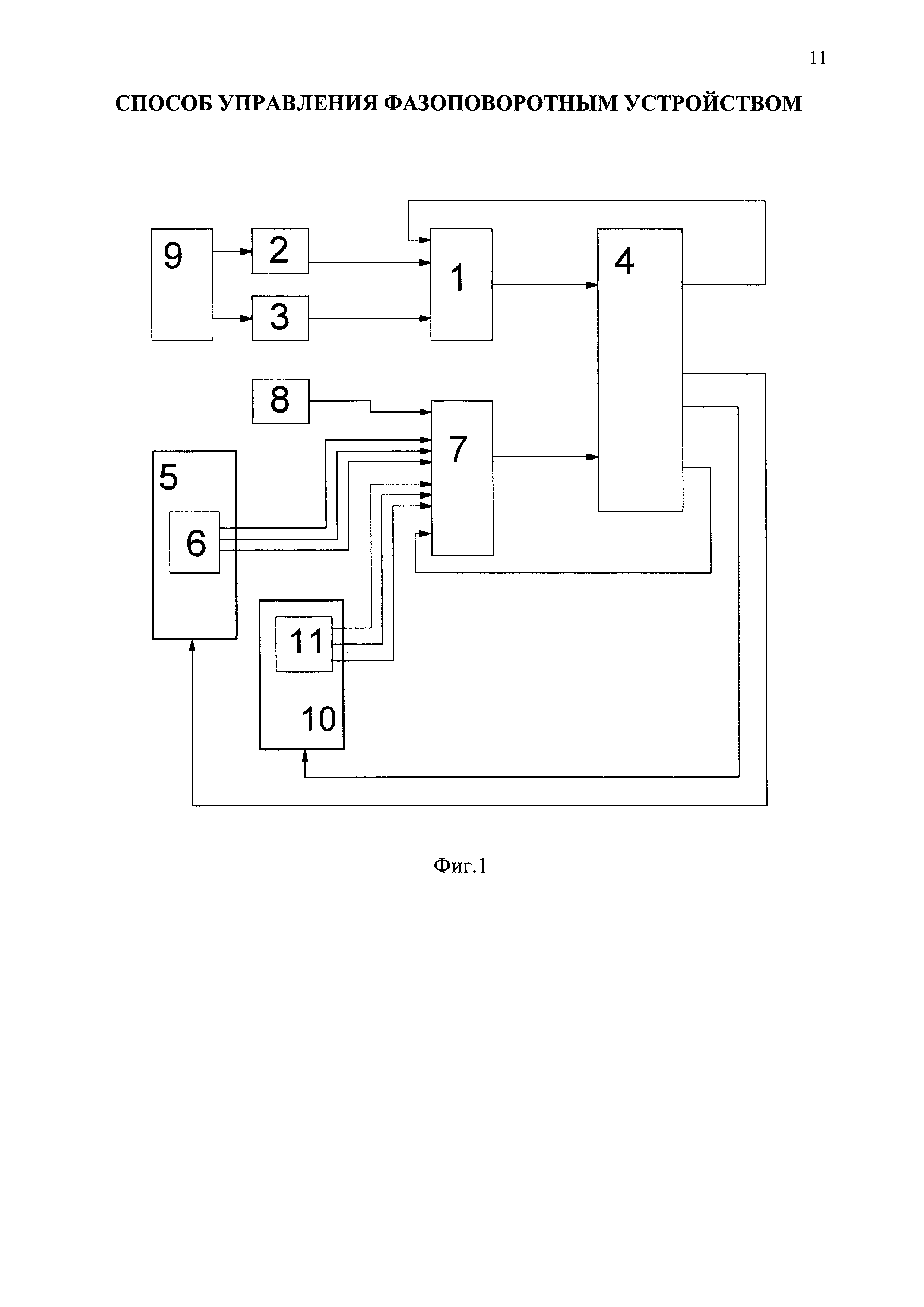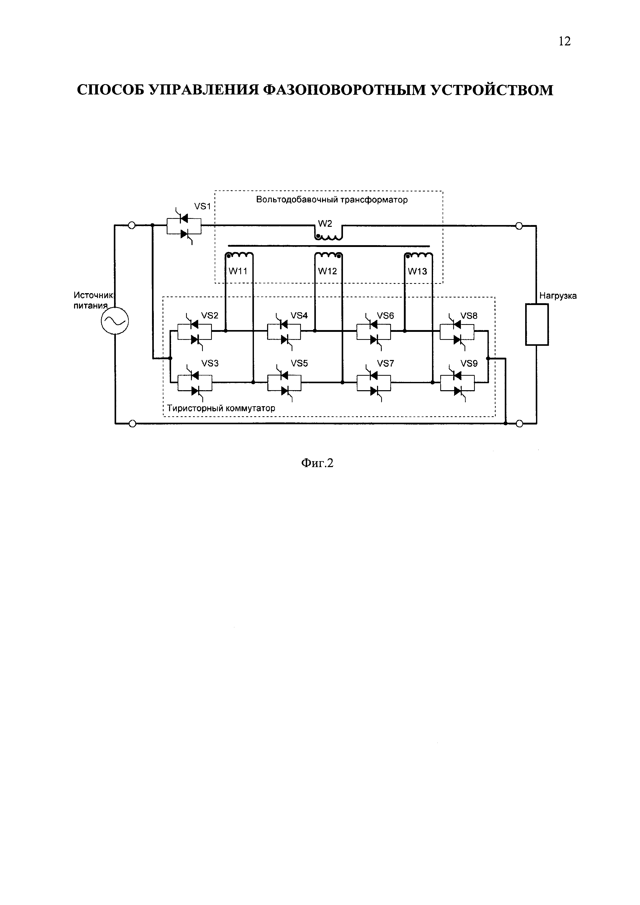 Способ управления фазоповоротным устройством путем поэтапного переключения тиристорным коммутатором шунтовых обмоток трансформатора, наводящих вольтодобавочное напряжение на его сериесной обмотке, заключающийся в том, что задают конечное состояние тиристорного коммутатора, вводят ограничения на поэтапное переключение тиристорного коммутатора из текущего состояния в заданное конечное, выбирают допустимую последовательность поэтапного переключения, удовлетворяющую заданным ограничениям, по меньшей мере, на величину выходного напряжения фазоповоротного устройства в процессе поэтапной коммутации, измеряют токи тиристорного коммутатора, выполняют его поэтапное переключение в соответствии с выбранной последовательностью за счет снятия импульсов управления со всех тиристорных ключей одной переключаемой фазы тиристорного коммутатора, фиксируют нулевой ток в переключаемой фазе тиристорного коммутатора в течение временного интервала, длительность которого превышает время восстановления тиристоров тиристорных ключей, подают импульсы управления на включение тиристорных ключей этой фазы в новое состояние, в соответствии с выбранной последовательностью поэтапного переключения, и осуществляют последовательное переключение каждой следующей фазы тиристорного коммутатора до окончания процесса переключения всех фаз тиристорного коммутатора в заданное конечное состояние, отличающийся тем, что перед началом поэтапного переключения каждой фазы тиристорного коммутатора отключают сериесную обмотку трансформатора переключаемой фазы с помощью двунаправленного тиристорного ключа, включенного последовательно с этой сериесной обмоткой трансформатора от источника питания и нагрузки, посредством снятия с него импульсов управления блоком управления тиристорными ключами фазоповоротного устройства, фиксируют наличие нулевого тока в двунаправленном тиристорном ключе, выдерживают временной интервал, длительность которого превышает время восстановления тиристоров двунаправленного тиристорного ключа, осуществляют процесс переключения тиристорных ключей тиристорного коммутатора и после их переключения в новое состояние подключают сериесную обмотку трансформатора переключаемой фазы к источнику питания и нагрузке с помощью двунаправленного тиристорного ключа, путем подачи на него импульсов управления блоком управления тиристорными ключами фазоповоротного устройства.