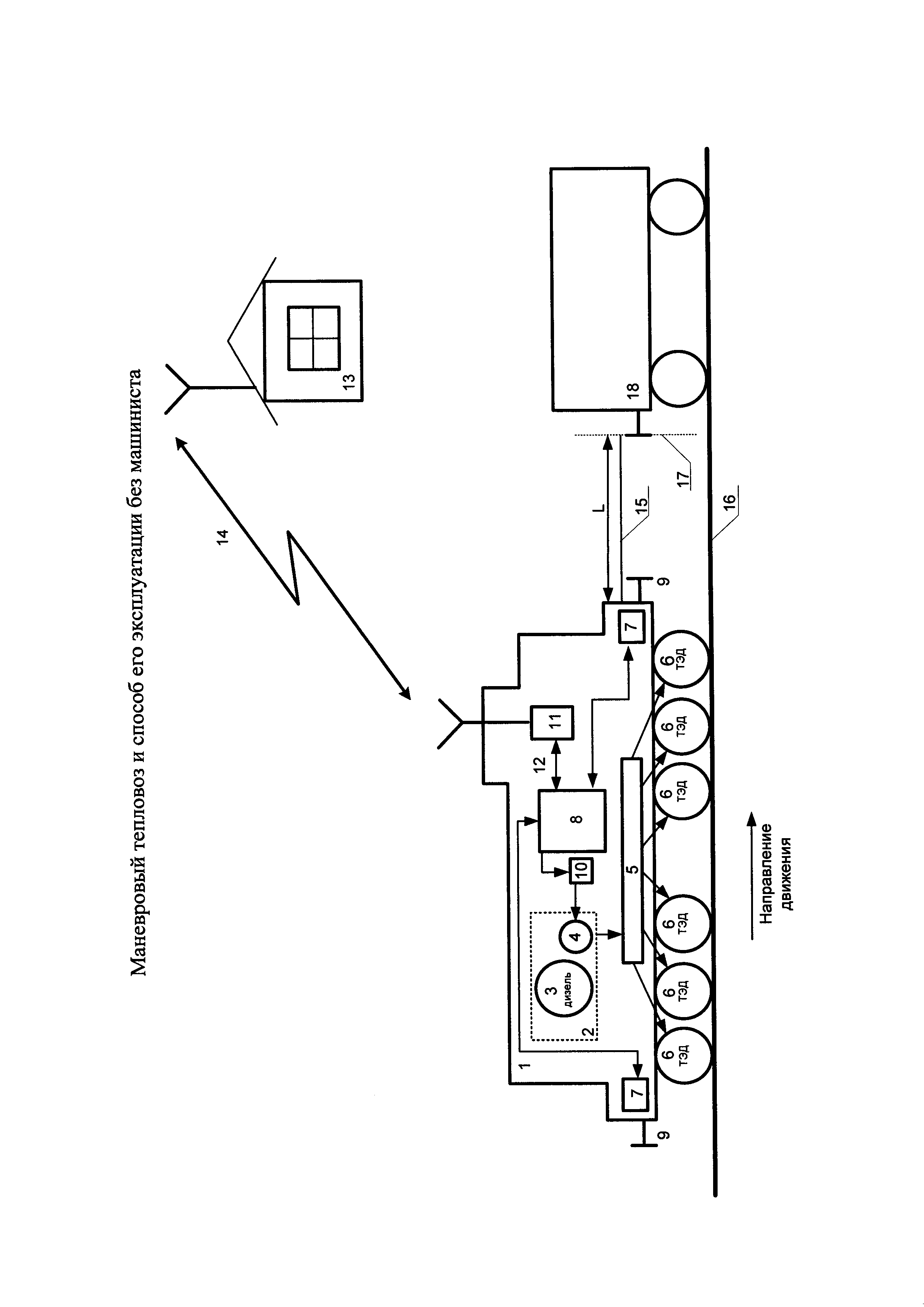 1. Маневровый тепловоз, имеющий ходовые механизмы, тяговую электропередачу с дизель-генераторной установкой с тяговым генератором переменного тока и тяговым выпрямителем или тяговым генератором постоянного тока, питающим тяговые электродвигатели постоянного тока последовательного возбуждения, на торцевых сторонах маневрового тепловоза расположены дальномеры бесконтактного действия, связанные с устройством управления, которое подключено к блоку возбуждения тягового генератора и предусмотрено для управления скоростью движения путем воздействия на блок возбуждения тягового генератора в режимах тяги и электрического торможения, отличающийся тем, что он оснащен устройством удаленного контроля, выполненным в виде бортовой специализированной радиостанции, соединенным каналом связи с устройством управления маневрового тепловоза, а дальномеры бесконтактного действия установлены на уровне автосцепных приборов и их плоскость считывания расположена параллельно плоскости рельсового пути, при этом линия считывания формируется пересечением плоскости считывания и плоскости расположения автосцепных приборов ближайшего по ходу движения вагона, перпендикулярной плоскости пути. 2. Маневровый тепловоз по п. 1, отличающийся тем, что в качестве дальномеров бесконтактного действия могут быть применены ультразвуковые уровнемеры. 3. Способ эксплуатации маневрового тепловоза без машиниста, заключающийся в непрерывном бесконтактном контроле линии считывания по ходу движения маневрового тепловоза, отличающийся тем, что осуществляют управление движением маневрового тепловоза по командам, поступающим от стационарного поста управления на устройство удаленного контроля, при расстоянии до линии считывания меньше наперед заданного значения контролируют момент скачкообразного увеличения нагрузки тяговых электродвигателей постоянного тока в режиме тяги и скачкообразного уменьшения нагрузки тяговых электродвигателей постоянного тока в режиме электрического торможения, принимают его за момент сцепки с ближайшим по ходу движения вагоном состава и останавливают маневровый тепловоз путем отключения возбуждения тягового генератора и снятия нагрузки с тяговых электродвигателей постоянного тока последовательного возбуждения.