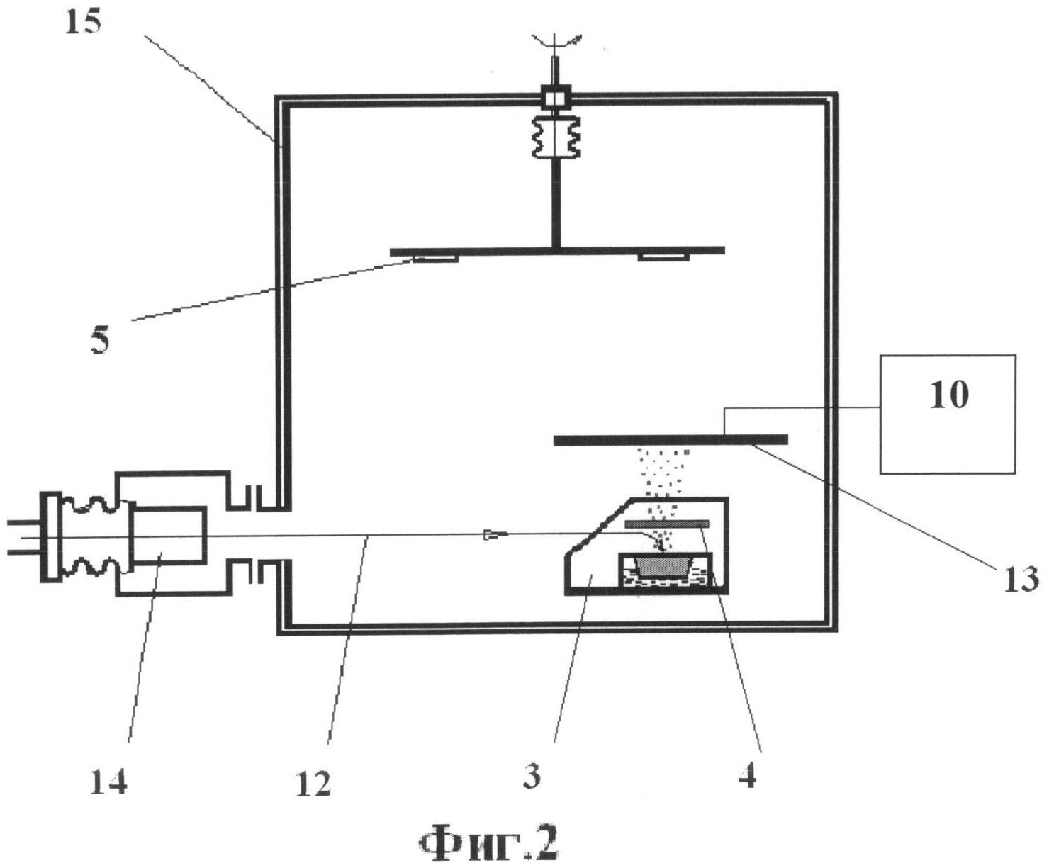 Изобретение относится к области нанесения покрытия в вакууме электронно-лучевым способом, конкретно к контролю толщины и скорости нанесения покрытия при проведении технологического процесса. Электронно-лучевое испарение в вакууме сопровождается возникновением различного рода нестабильностей, которые приводят к изменению скорости испарения рабочего вещества и, следовательно, к отклонению толщины покрытия от заданного значения. Обычно толщину слоев конденсата контролируют с помощью различного рода датчиков. Известен способ нанесения покрытий на поверхность оптических элементов, включающий электронно-лучевое испарение материала покрытия в вакууме и осаждение паров на поверхность оптических элементов в процессе их многократного прохождения через зону напыления, после каждого прохода оптического элемента через зону напыления производят сканирующее по определенной ширине спектра определение коэффициента преломления, полученную зависимость коэффициента преломления от длины волны сравнивают с заданной и затем корректируют величину тока катодов электронно-лучевых испарителей и/или скорость перемещения оптического элемента в зоне напыления, и/или величину вакуума для уменьшения несовпадений измеренной и заданной зависимостей коэффициента преломления от длины волны после следующего прохода (Патент Российской Федерации №2133049, G02B 1/11, 1999 г.). Известен более простой и универсальный, чем спектрофотометрический, способ измерения толщины и скорости нанесения покрытий с помощью кварцевого резонатора, основанный на компенсационном методе измерения (И.А. Малышева «Технология производства интегральных микросхем». Москва. Радио и связь. 1991, стр.169-173).Максимальная толщина слоя, напыляемого на один кристалл датчика, составляет приблизительно 2 мкм до его замены. Известен способ измерения толщины металлической пленки, включающий формирование ступенчатой структуры на поверхности пленки, высота которой равна толщине пленки, напыление на поверхность подложки со ступенькой слоя высокоотражающего металла и освещение пленки лучом лазера с известной длиной волны, ступенчатую структуру формируют из чередующихся непротравленных и протравленных на всю толщину пленки, вплоть до подложки, полос одинаковой ширины, затем, при облучении полученной рельефной структуры зондирующим лазерным пучком, в полученной отраженной дифракционной картине проводят измерение мощностей дифрагированных пучков нулевого и первого дифракционных порядков, после чего рассчитывают толщину исходной металлической пленки (Патент Российской Федерации №2221989, G01B 11/06, 2004 г.). Известен электронно-лучевой испаритель с аксиальной пушкой и нейтрализацией парового потока, содержащий изолятор; прижим; экран; карусель; лампы накаливания; подложкодержатель; подложку; А1 пленку; анод ионизатора (анод - два симметрично расположенных относительно тигля молибденовых стержня); поворотный секторный электромагнит; электромагнит тигля; тигель; А1 навеску; электронную пушку (А.А. Буянкин, Ю.С. Динов, Н.В. Самухина. Электроннолучевой испаритель с аксиальной пушкой и нейтрализацией парового потока. // Вакуумные технологии и оборудование (ICVTE). Харьков, 2002 г., с.248.). Известен способ нанесения покрытий электронно-лучевым испарением в вакууме, включающий нагрев испаряемого 