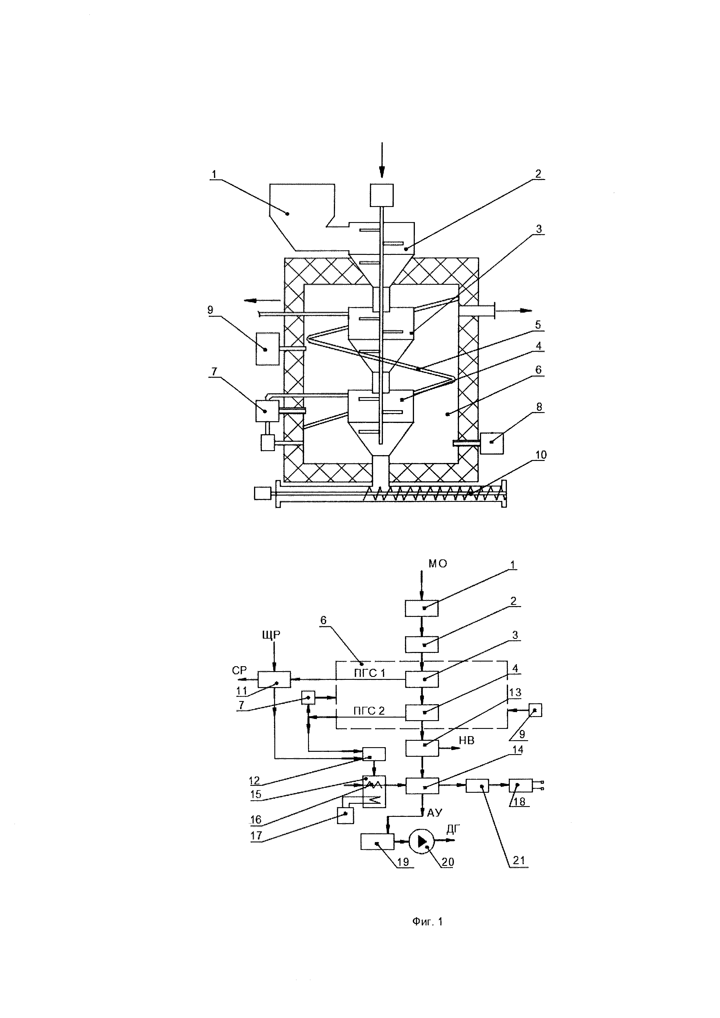 1. Способ утилизации твердых хлорсодержащих медицинских отходов, включающий их термическое разложение без доступа воздуха (пиролиз) с образованием газообразных и твердых продуктов, сжигание продуктов пиролиза, охлаждение и очистку дымовых газов, отличающийся тем, что отходы подвергают термическому разложению в последовательно расположенных низкотемпературной и высокотемпературной камерах термического разложения (КТР), обогреваемых снаружи теплом от сжигания газообразных продуктов пиролиза, выведенных из высокотемпературной КТР, температура в которой не превышает 600°С, а температура в низкотемпературной КТР не превышает 350°С, газообразные продукты, выведенные из низкотемпературной КТР, промывают водным щелочным раствором, несконденсировавшиеся при промывке газообразные продукты сжигают совместно с основной частью газообразных продуктов пиролиза, образующиеся при сжигании газообразных продуктов пиролиза дымовые газы охлаждают в теплообменнике, очищают в системе газоочистки и выводят в атмосферу, твердые продукты пиролиза выводят из высокотемпературной секции КТР отдельно от газообразных продуктов, выделяют из них неорганические включения, а коксовый остаток подвергают паровой газификации в отдельном устройстве. 2. Способ по п. 1, отличающийся тем, что процесс пиролиза проводят в двух размещенных в камере обогрева и расположенных друг над другом камерах термического разложения, в условиях движущегося слоя твердого материала, скорость движения которого задают регулятором движения материала. 3. Способ по пп. 1, 2, отличающийся тем, что температуру в верхней низкотемпературной КТР регулируют изменением количества воздуха, подаваемого воздушным регулятором температуры в верхнюю часть камеры обогрева. 4. Способ по пп. 1-3, отличающийся тем, что образующийся при пиролизе коксовый остаток газифицируют перегретым водяным паром при атмосферном давлении при температуре 800-900°С до исчерпания примерно половины углерода, образующийся активированный уголь используют для доочистки дымовых газов, а образующийся при газификации горючий водяной (синтез) газ освобождают от паров воды, компримируют и направляют на сжигание в генератор электроэнергии.