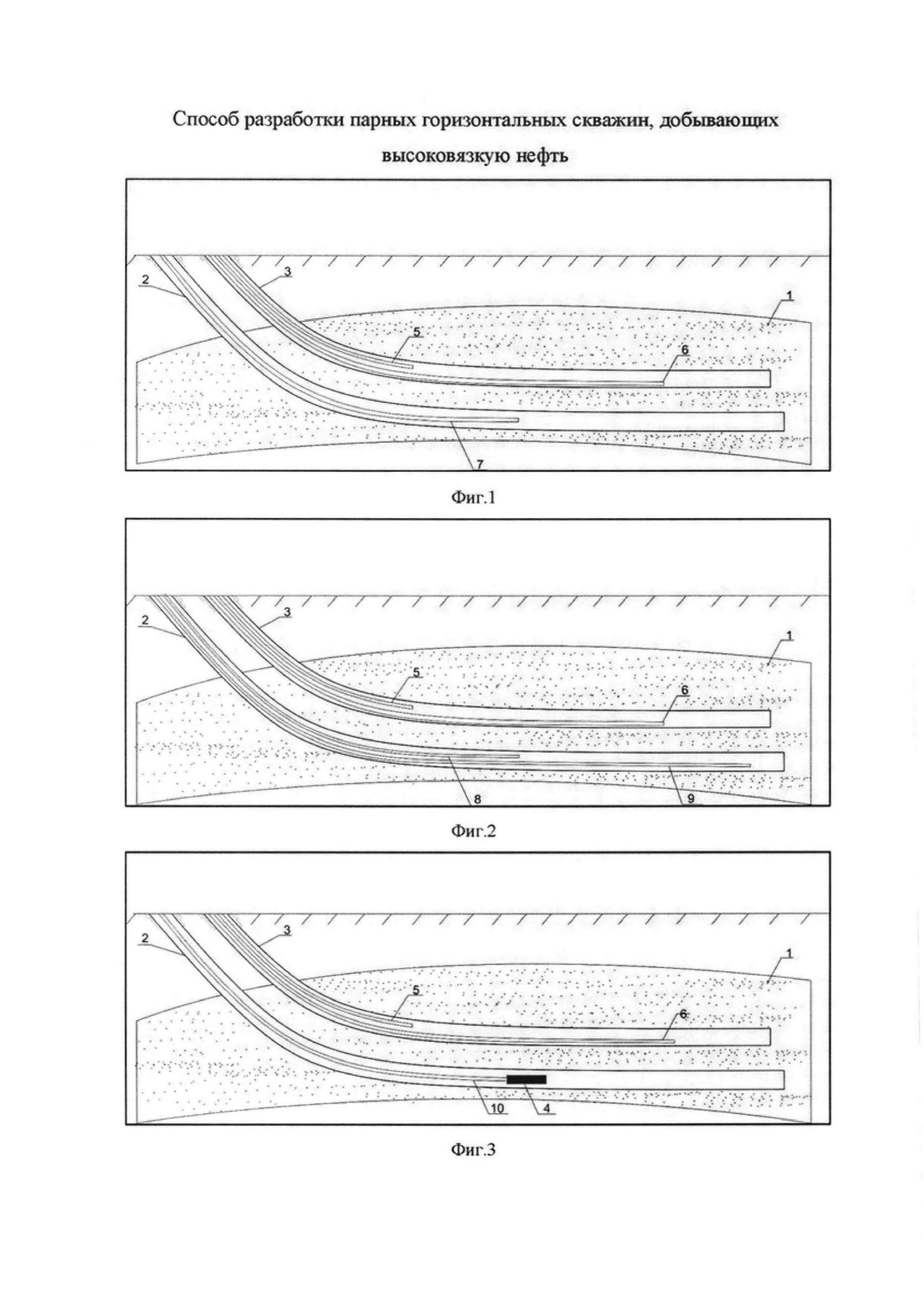 Изобретение относится к нефтедобывающей промышленности и может найти применение при разработке залежи высоковязкой и битумной нефти. Способ разработки парных горизонтальных скважин, добывающих высоковязкую нефть, включает строительство горизонтальных добывающей скважины и нагнетательной скважины, располагаемой выше и параллельно добывающей скважине, создание проницаемой зоны между скважинами за счет нагнетания водяного пара в обе скважины. Причем после создания проницаемой зоны подают пар только в нагнетательную горизонтальную скважину, а из добывающей горизонтальной скважины отбирают продукцию. При этом в горизонтальном стволе нагнетательной скважины проводят геофизические исследования по определению нефтенасыщенности вдоль горизонтального ствола. После чего в нагнетательной скважине размещают две колонны насосно-компрессорных труб (НКТ). При этом конец колонны меньшего диаметра располагают в начале горизонтального ствола, а конец колонны большего диаметра - в зоне с нефтенасыщенностью более 60%. Для закачки пара в добывающей скважине размещают одну или две колонны НКТ со смещением конца или концов по горизонтали относительно концов НКТ нагнетательной скважины не менее чем на 10 м. В обе скважины закачивают объем пара, определяемый по приведенному математическому выражению. После окончания закачки расчетного объема пара скважины останавливают на выдержку для термокапиллярной пропитки и остывания ствола добывающей скважины, в которой проводят термобарометрические измерения посредством геофизических исследований. По результатам которых в горизонтальном стволе добывающей скважины выявляют переходные зоны с температурой между большим и меньшим прогревом. Среди выявленных зон определяют зону с изменением угла набора кривизны не более 2 градусов на 10 м, в которой размещают оптоволоконный кабель и спускаемый на колонне НКТ электроцентробежный насос (ЭЦН), оснащенный на приеме датчиками температуры и давления. Закачку пара через нагнетательную скважину возобновляют, а отбор продукции ЭЦН проводят со съемом термограммы вдоль ствола добывающей скважины посредством оптоволоконного кабеля и замером температуры на приеме ЭЦН для контролирования процесса равномерного прогрева добывающей скважины. Причем при снижении температуры жидкости ниже максимально допустимой на входе насоса увеличивают закачку пара через нагнетательную скважину, а при повышении температуры на входе ЭЦН снижают закачку пара через нагнетательную скважину и/или переводят ЭЦН в периодический режим работы. После стабилизации температуры на входе ЭЦН, равной максимально допустимой по условиям работы, насос переводят на постоянный режим работы. Техническим результатом является снижение энергетических затрат за счет использования одноустьевых скважин, исключение неравномерности прогрева и прорыва пара в добывающую скважину за счет применения контроля прогрева и увеличение надежности работы за счет использования погружных ЭЦН. 2 з.п. ф-лы, 3 ил.