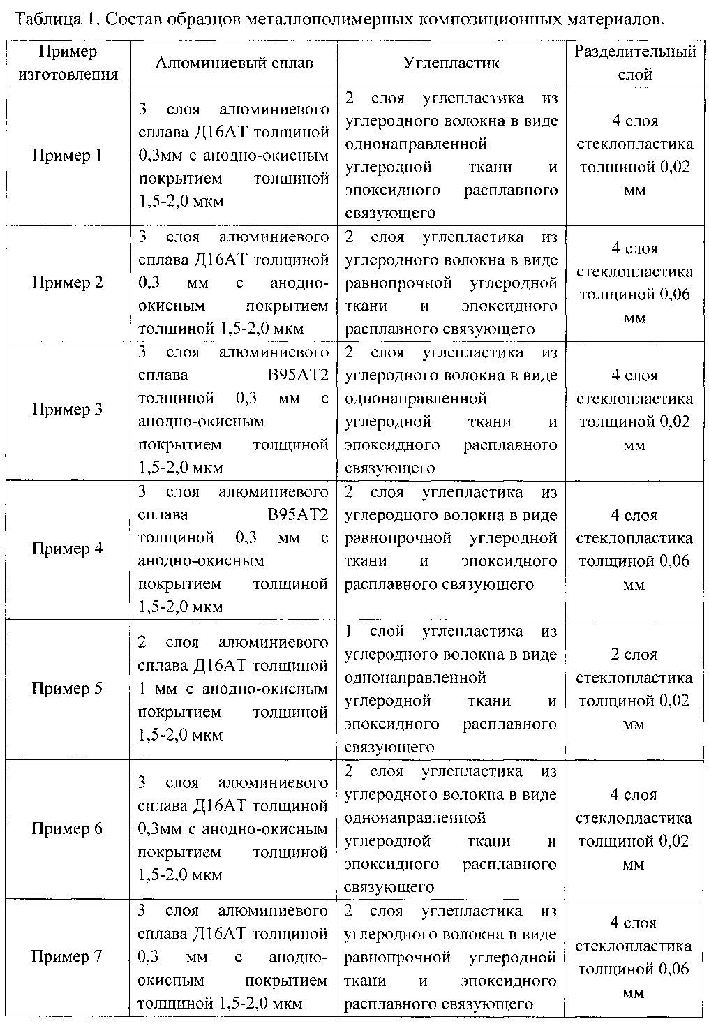 Изобретение относится к авиастроительной промышленности, в частности к слоистым металлополимерным композиционным материалам, и может быть использовано в производстве изделий конструкционного назначения, например, обшивок фюзеляжа, створок, люков, рулей управления и стабилизаторов транспортных и пассажирских самолетов с целью уменьшения массы конструкций и увеличения срока эксплуатации при увеличении надежности и безопасности эксплуатации конструкции. Также применение материала возможно в машиностроительной и других отраслях промышленности, преимущественно для изделий городского и железнодорожного транспортов. Создание материалов, позволяющих существенно снизить массу, повысить ресурс и безопасность эксплуатации конструкций - важная и не теряющая актуальности проблема в авиастроении. Традиционные методы совершенствования свойств авиационных материалов практически исчерпали свои возможности. Так, для металлических сплавов при увеличении прочности за счет оптимизации состава и структуры не удается добиться показателей выносливости и стойкости к усталостному разрушению необходимых для современных летательных аппаратов. Рост прочности обычно сопровождается повышением чувствительности к концентраторам напряжений, что может служить причиной преждевременного разрушения нагруженных конструкции. Известны металлополимерные композиционные слоистые материалы, состоящие из слоев алюминиевого сплава и слоев полимерных композитов на основе стеклянных, арамидных или углеродных волокон (Статья "Glare technology development 1997-2000", J.W. Gunnink, A. Vlot, T.J. de Vries, W. van der Hoeven. - Chemistry and materials science, v. 9 №4 (2002), p. 201-219, 2002; статья "Development of fibre metal laminates: concurrent multi-scale modeling and testing", J. Sinke. - J Mater Sci, published online, Springer Science+Business Media 2006; статья "Residual strength of centrally cracked metal/fiber composite laminates" Z.-H. Jin, R.C. Batra, Materials science and engineering, A216, p. 117-124, 1996). Эти материалы имеют повышенные механические свойства по сравнению с листами алюминиевого сплава, а также обладают высокой трещиностойкостью при усталостном разрушении. В настоящее время за рубежом такие материалы применяются в конструкции самолетов гражданской авиации, в частности в конструкции самолетов фирмы Airbus (А-380, А-350). Наиболее часто за рубежом используется слоистые металлополимерные композиционные материалы «алюминий - стеклопластик» под маркой GLARE. В Российской Федерации его аналогом являются материалы, выпускаемые под маркой СИАЛ. Слоистый материал СИАЛ содержит слои алюминиевого сплава и слои стеклопластика, армированного стеклянными волокнами (RU 2185964 С1, 27.07.2002). Недостатком СИАЛ и GLARE является низкое значение модуля упругости (60-70 ГПа), которое не превышает значения модуля упругости алюминиевых сплавов. Известен композиционный слоистый материал АЛОР, который предназначен для изготовления элементов конструкции авиационной техники, например, для изготовления силовых деталей планера. Материал содержит слои алюминиевого сплава и слои органопластика, армированного высокопрочными арамидными волокнами (RU 2185963 С1, 27.07.2002). Недостатком слоистого материала АЛОР является его склонность к поглощению влаги из-за способности арамидных волокон поглощать воду. Наличие влаги приводит к развитию коррозионных процессов, которые могут привести к разрушению слоистого материала. Известен слоистый композиционный материал «алюмин
